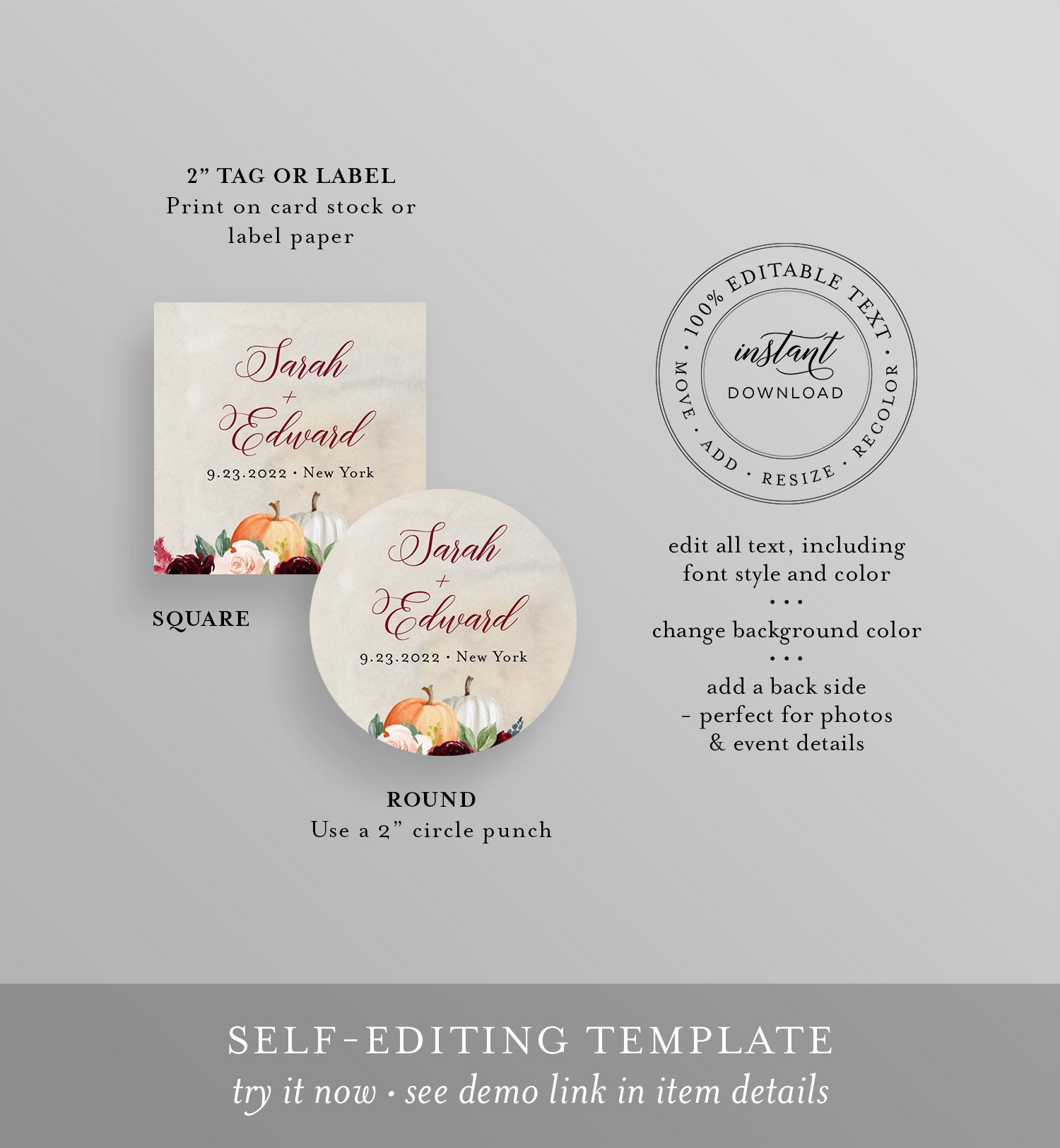 This listing is an "INSTANT DOWNLOAD" that includes a high resolution, printable WEDDING / BRIDAL FAVOR TAG template - use this create personalized tags or labels. Access your template within minutes of purchase and edit in TEMPLETT - A fully customizable template editor that allows you to personalize your printable directly in your web browser. No software to install or fonts to download.