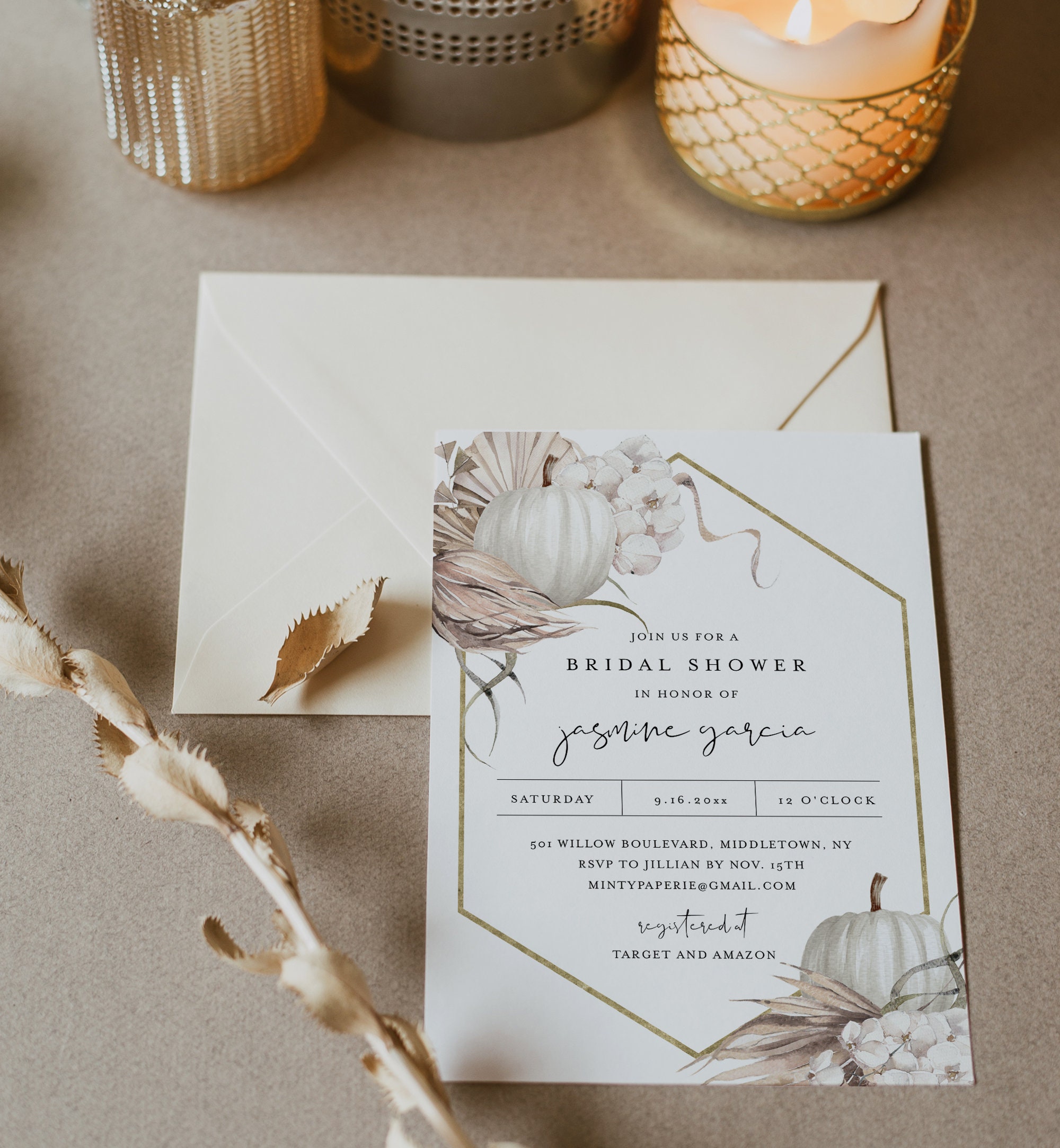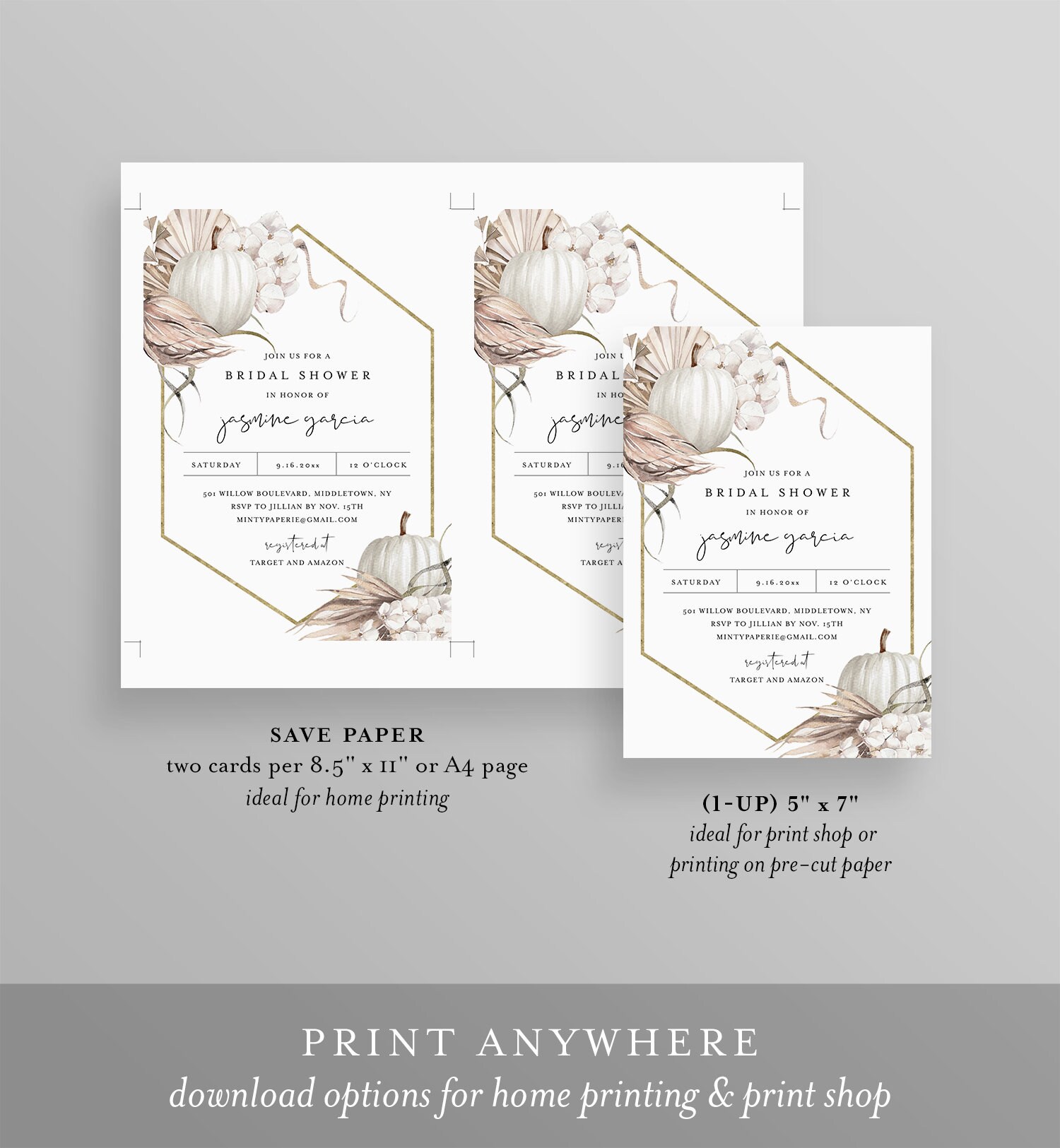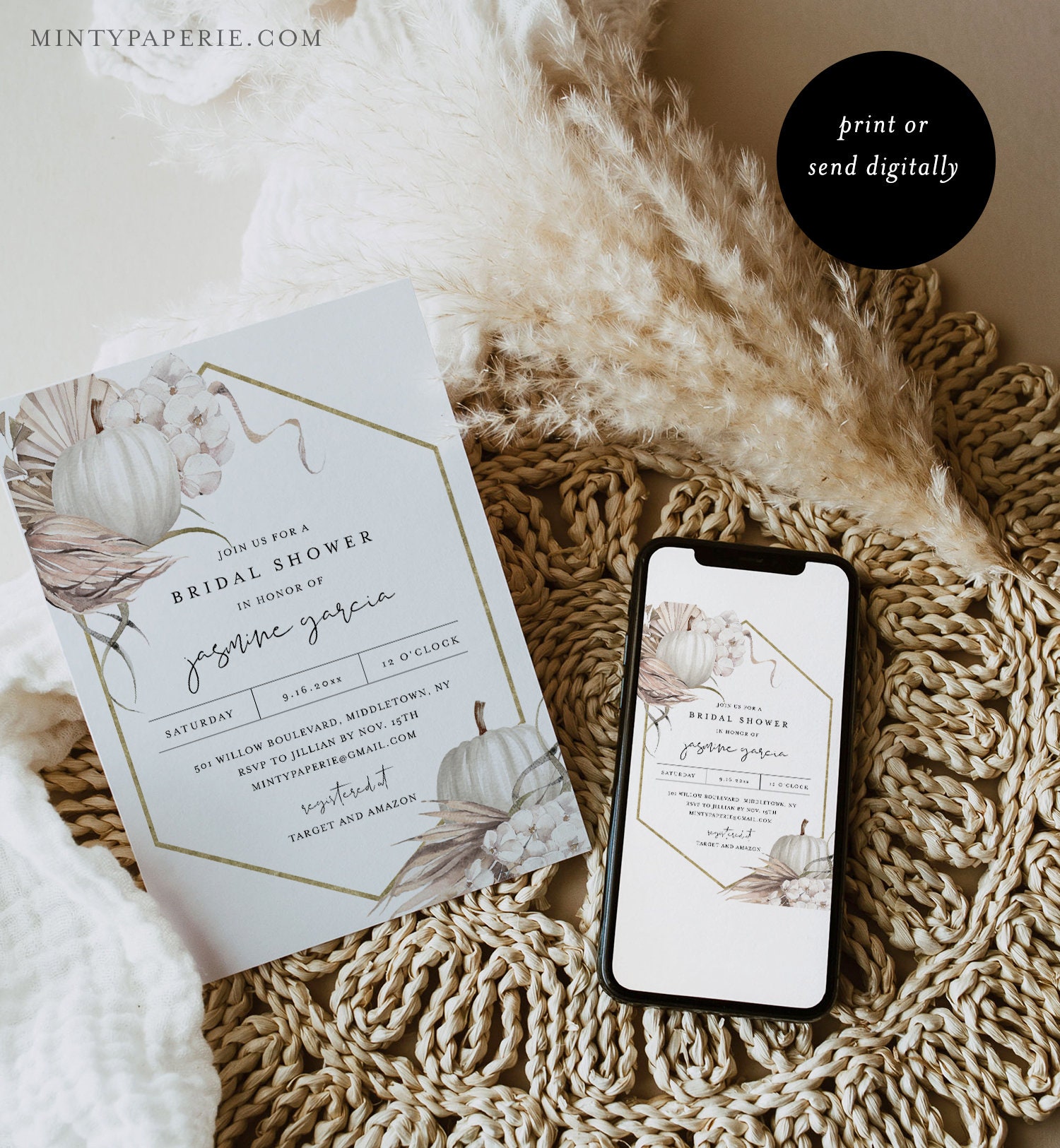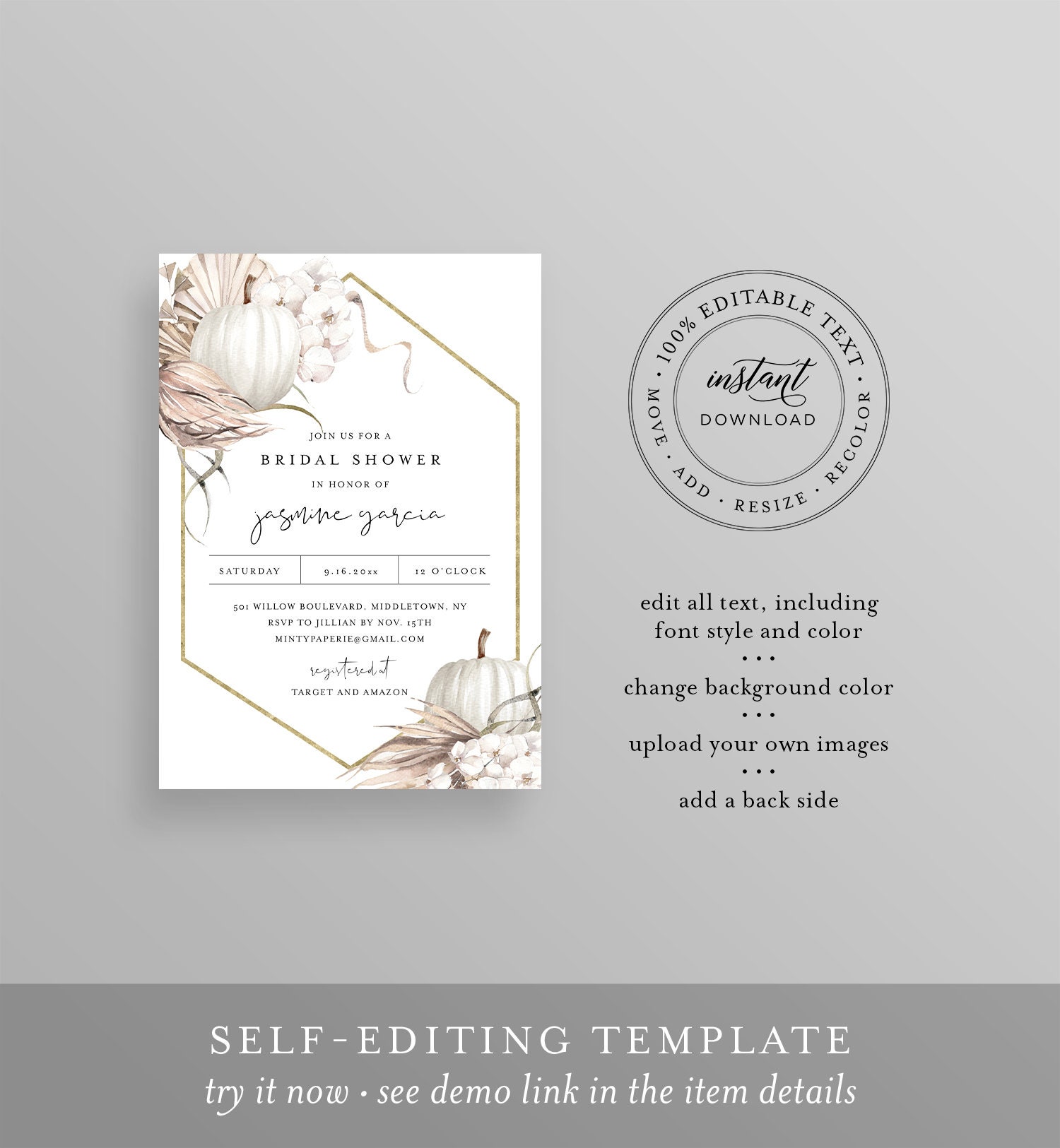 This Fall Bohemian Pumpkin Bridal Shower Invitation template is an instant download. Access your template within minutes of purchase and edit in Templett - A fully customizable template editor that allows you to personalize your printable directly in your web browser. No software to install or fonts to download.