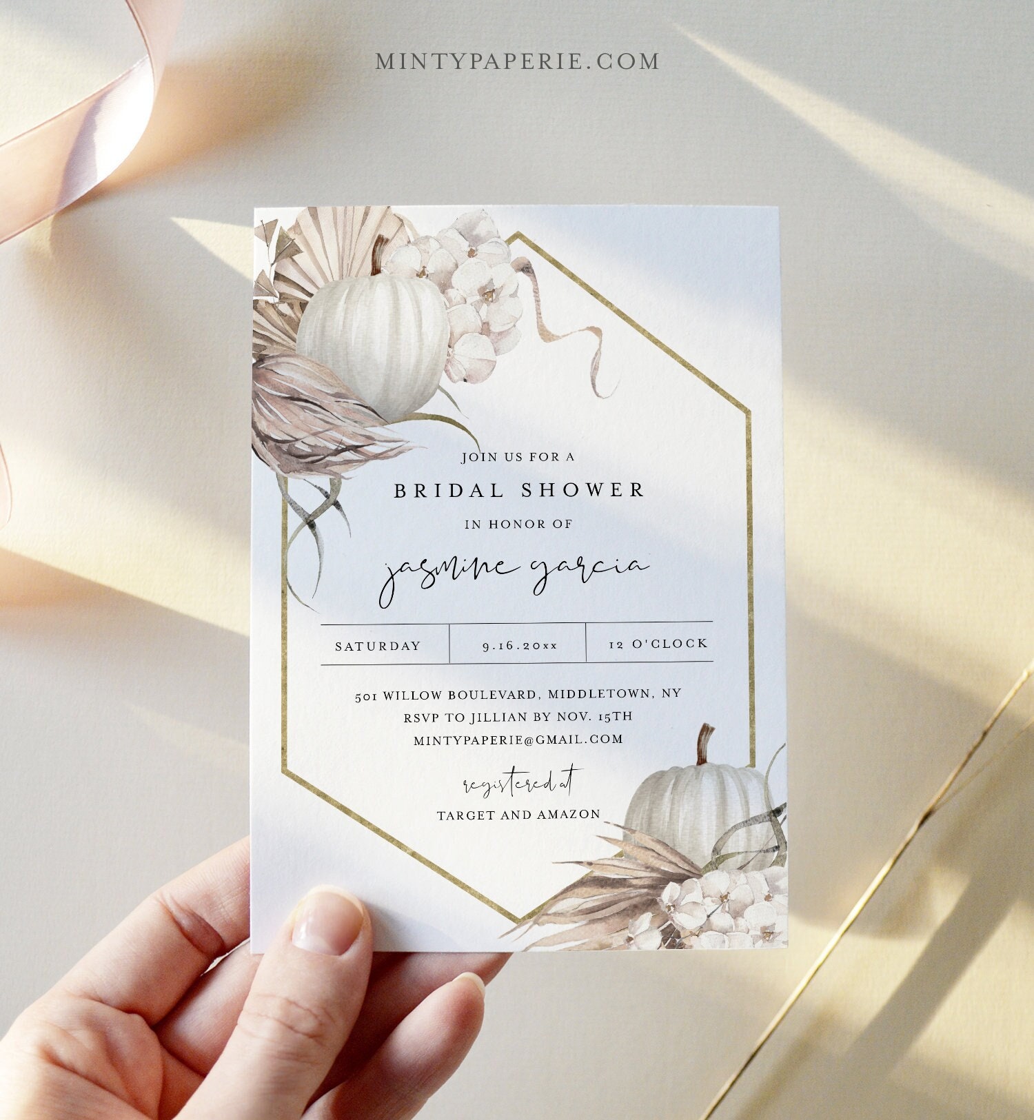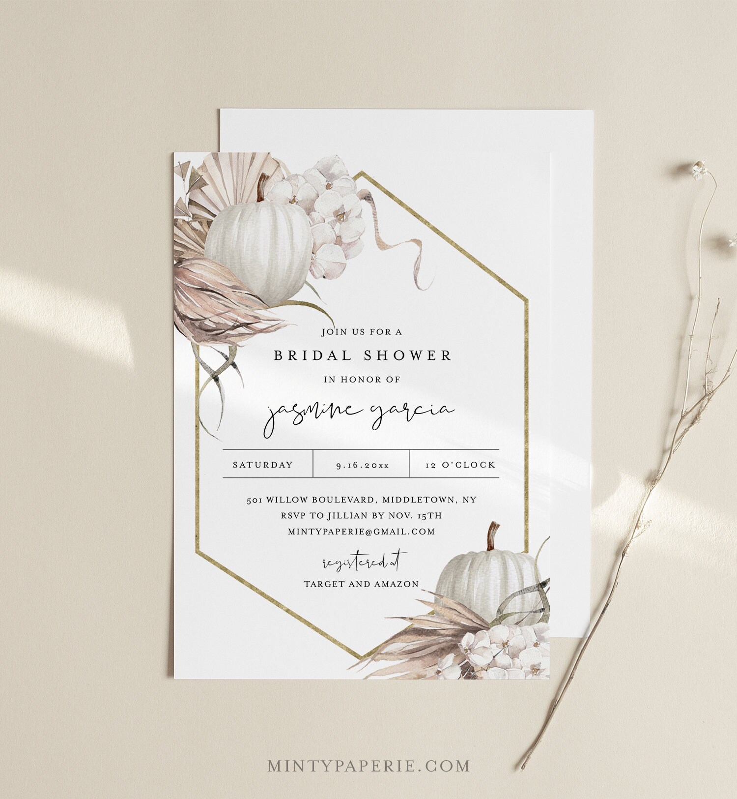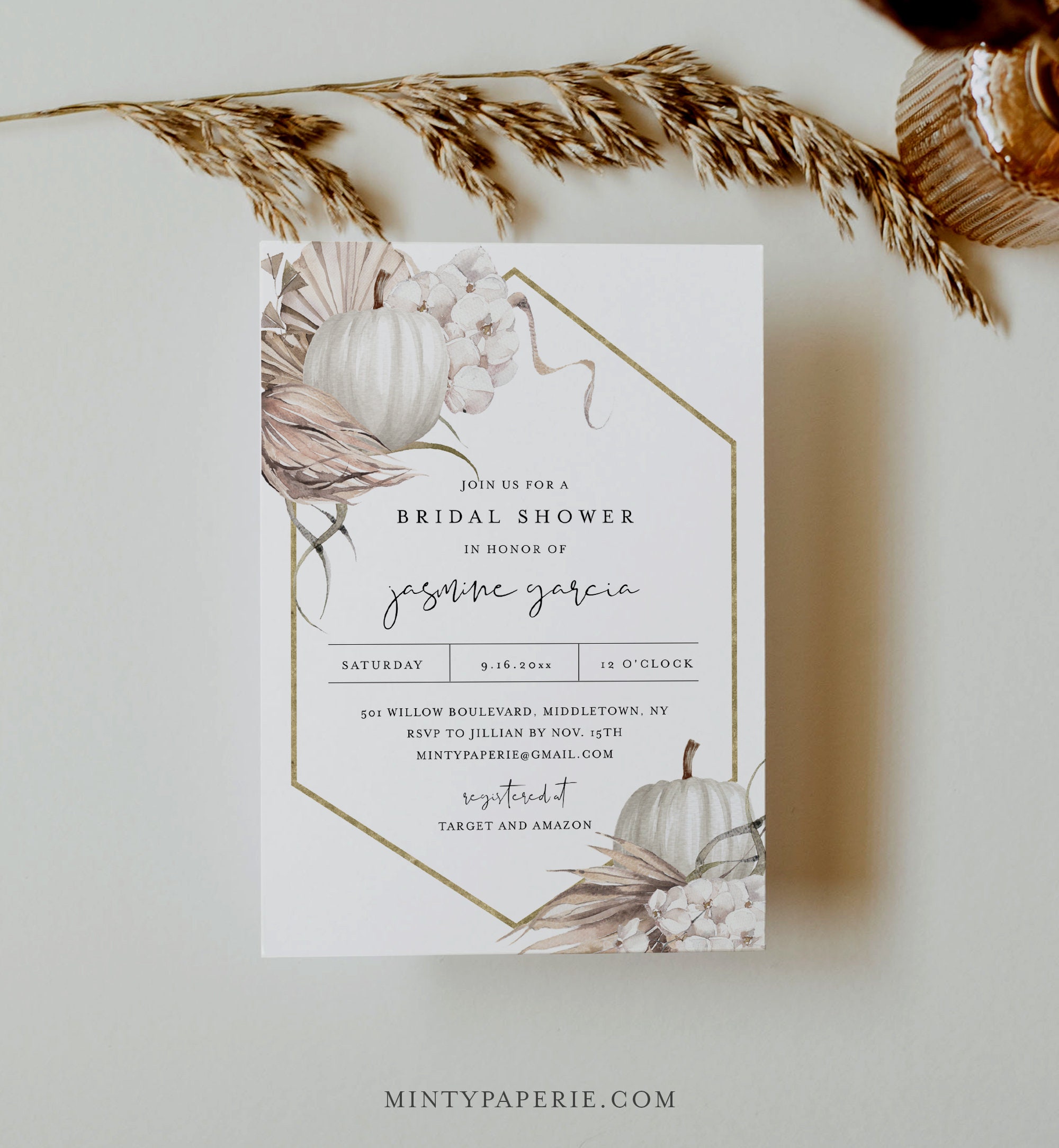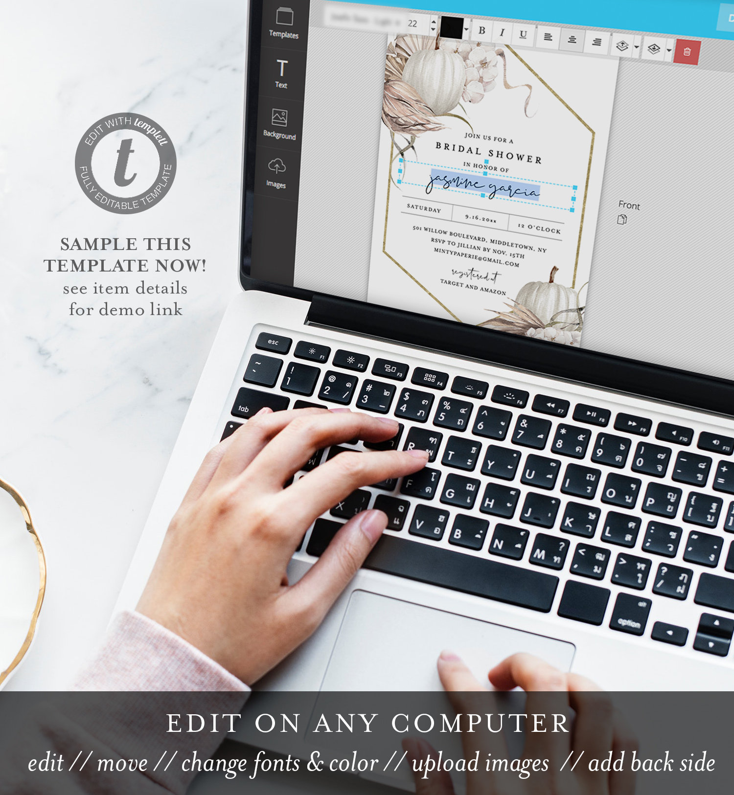 This Fall Bohemian Pumpkin Bridal Shower Invitation template is an instant download. Access your template within minutes of purchase and edit in Templett - A fully customizable template editor that allows you to personalize your printable directly in your web browser. No software to install or fonts to download.