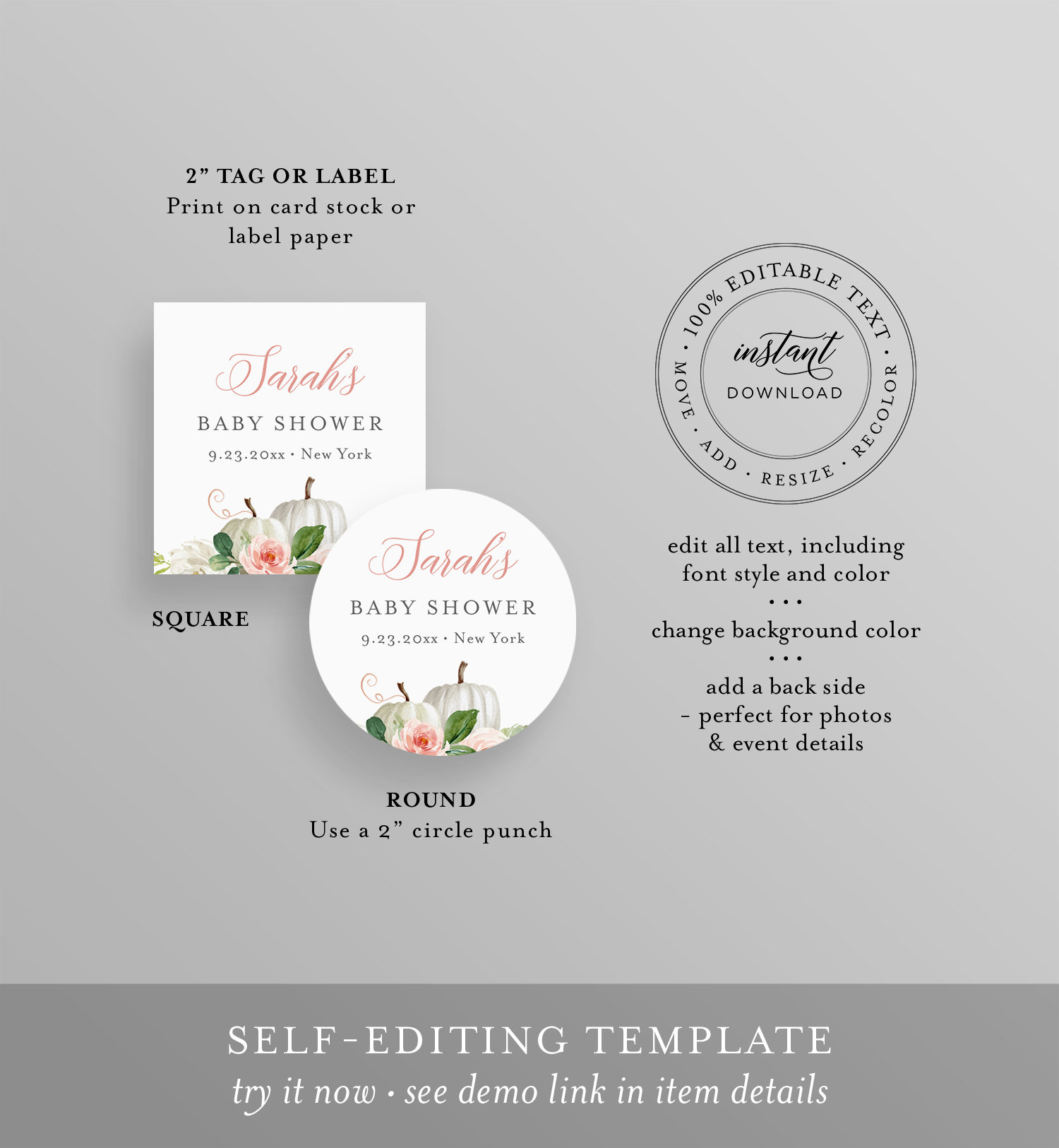 This favor tag / label is an instant download. Use this template to to create personalized tags or labels. Access your template within minutes of purchase and edit in Templett - A fully customizable template editor that allows you to personalize your printable directly in your web browser. No software to install or fonts to download.