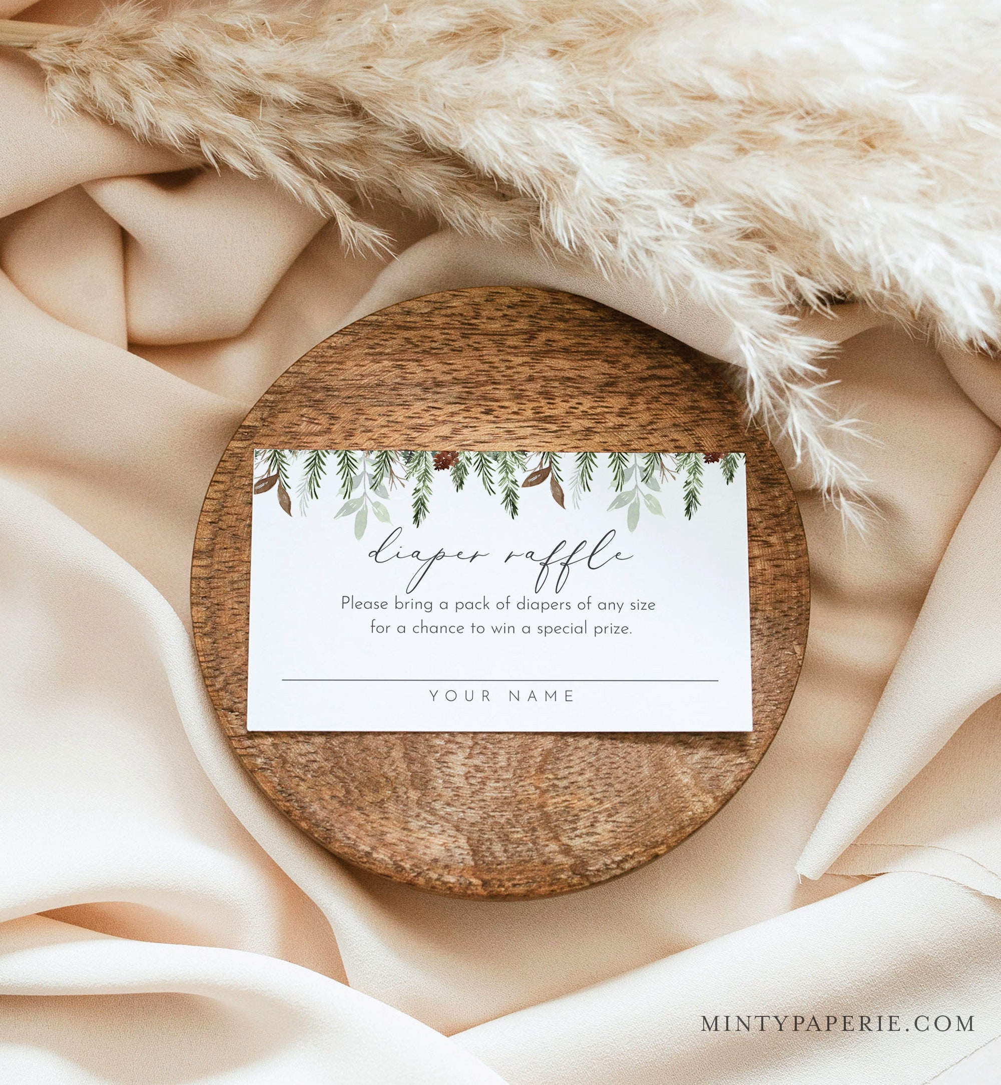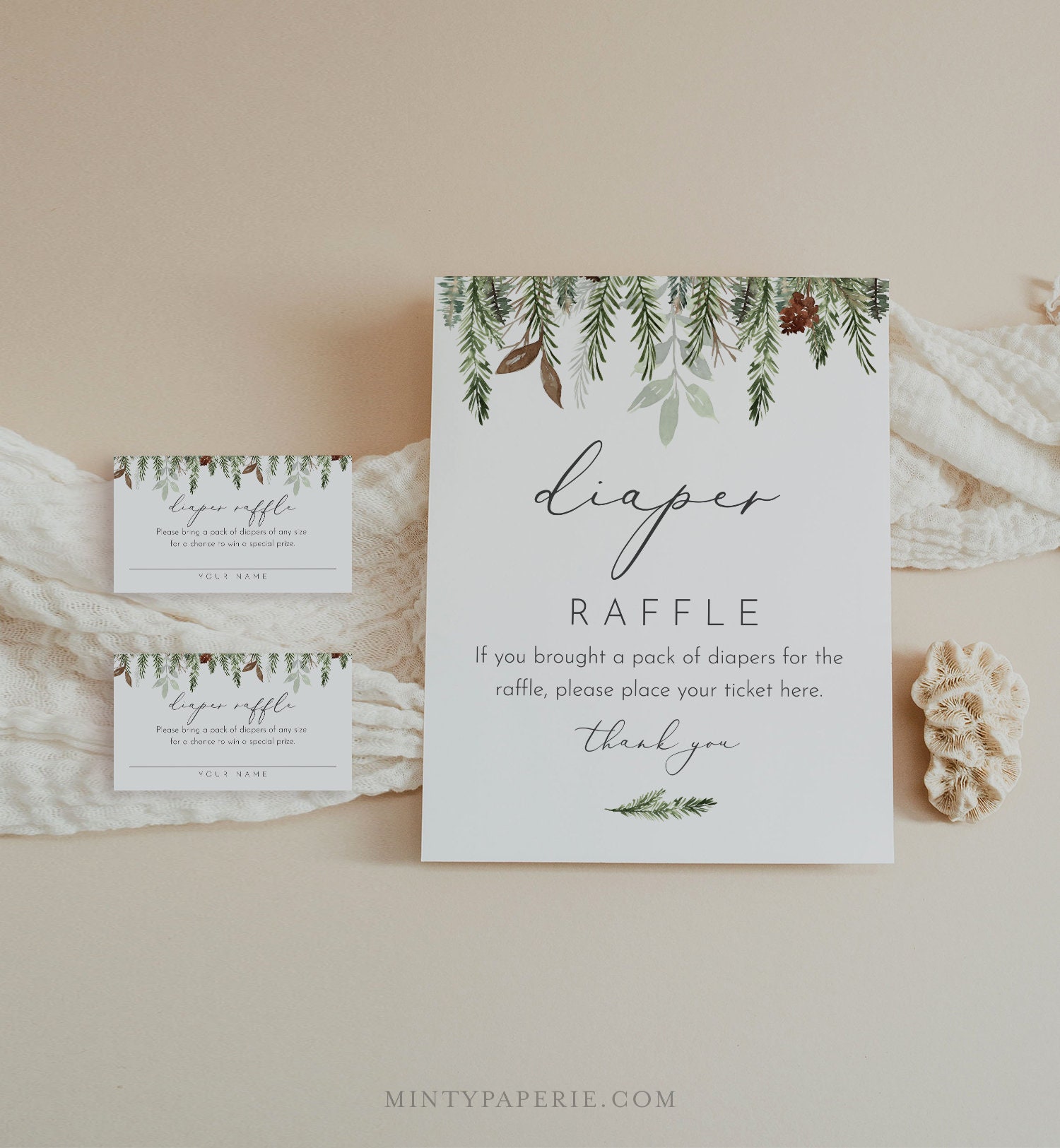 This winter pine baby diaper raffle baby shower game template is an instant download. Access your template within minutes of purchase and edit using Templett - A fully customizable template editor that allows you to personalize your printable directly in your web browser. No software to install or fonts to download.