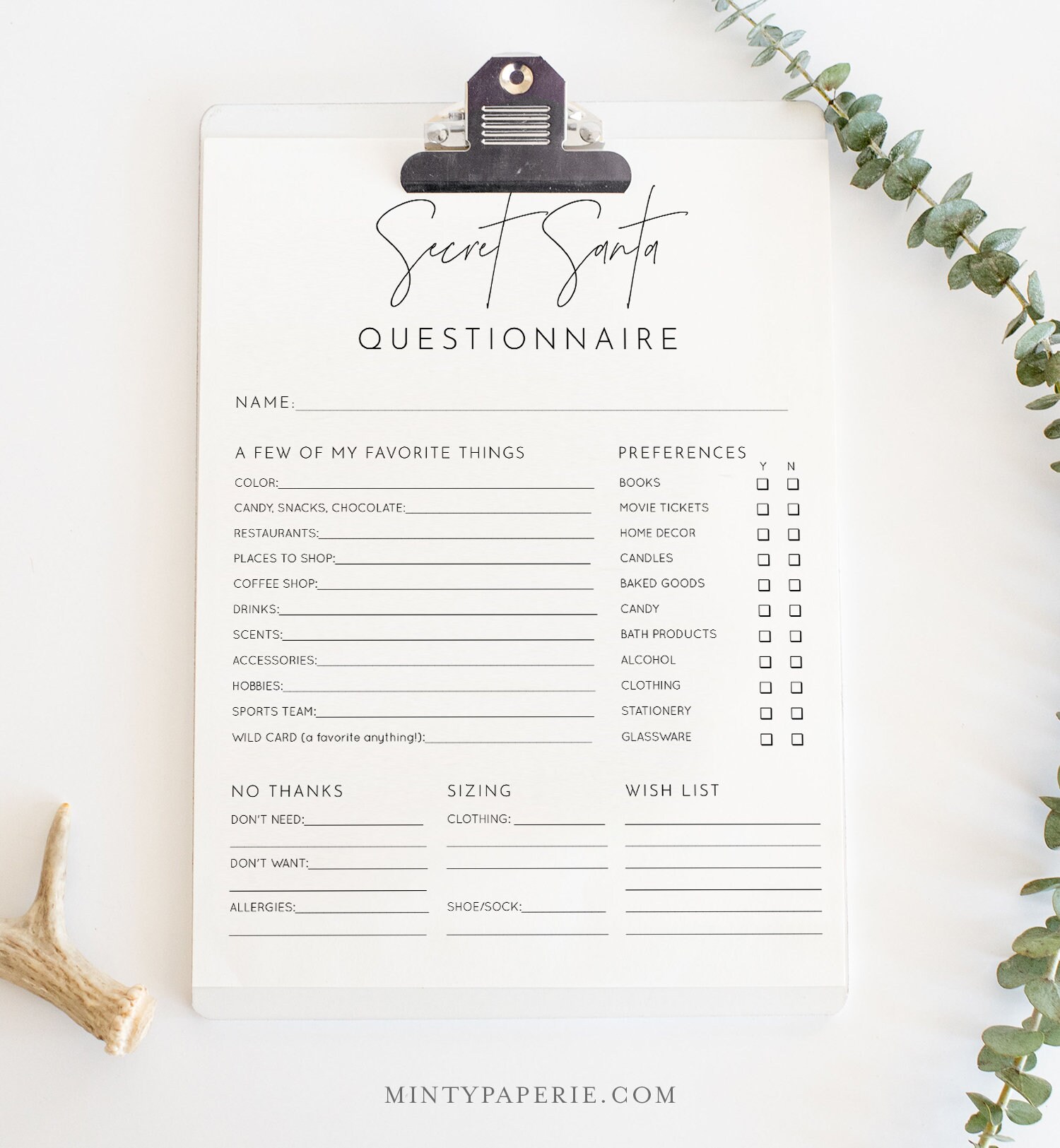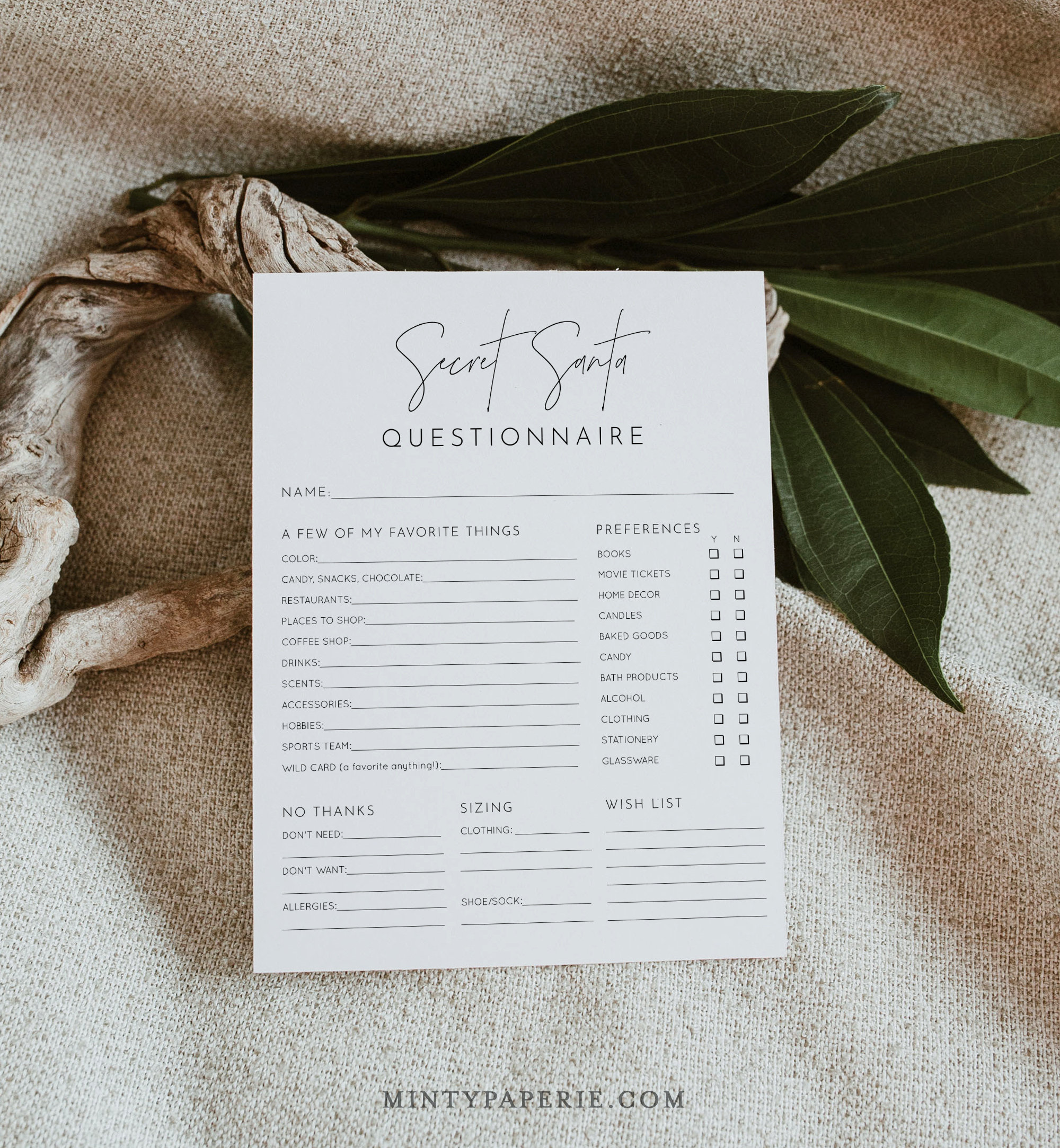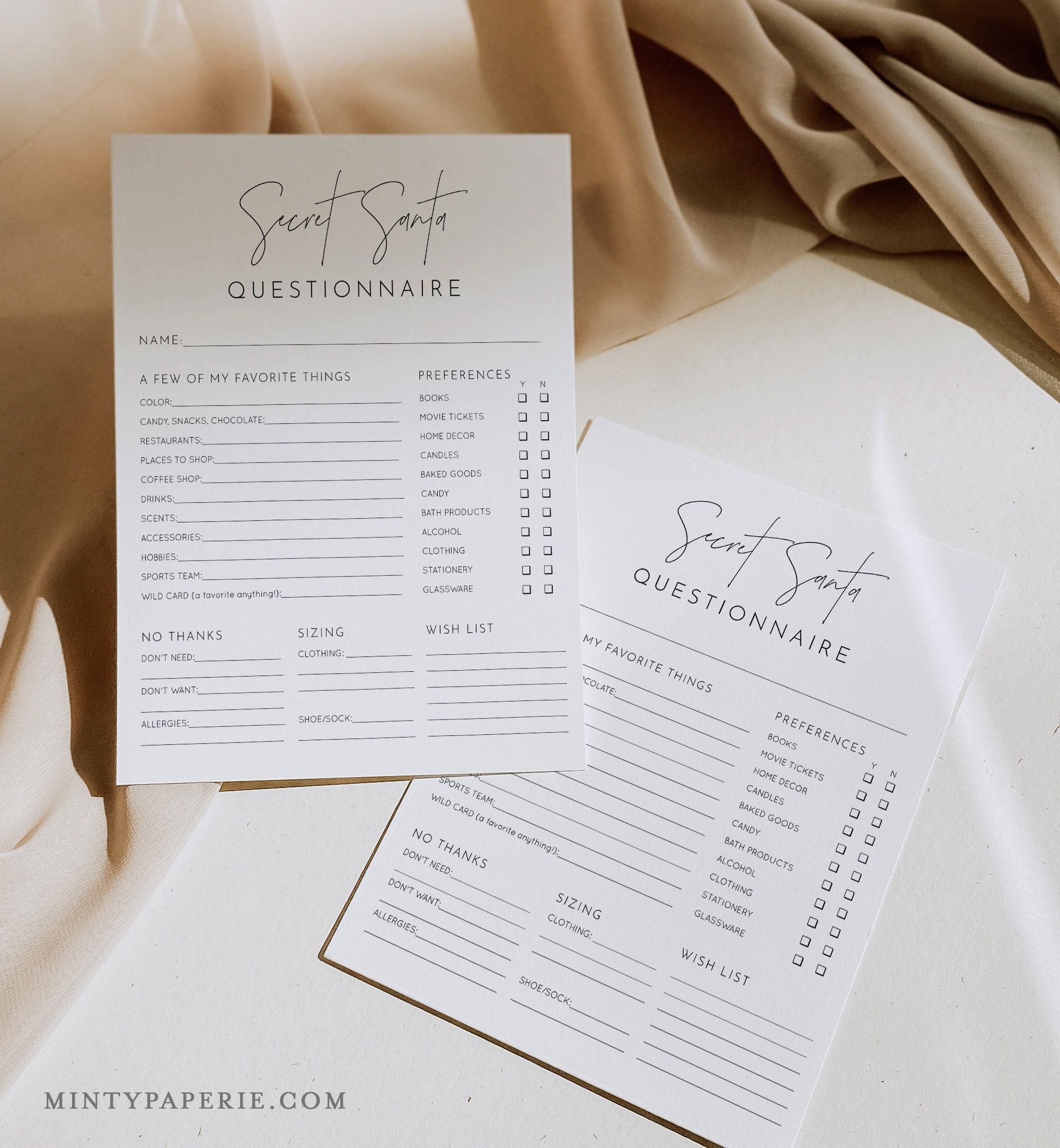 This secret santa questionnaire is an instant download. Access your template within minutes of purchase and edit in Templett - A fully customizable template editor that allows you to personalize your printable directly in your web browser. No software to install or fonts to download.