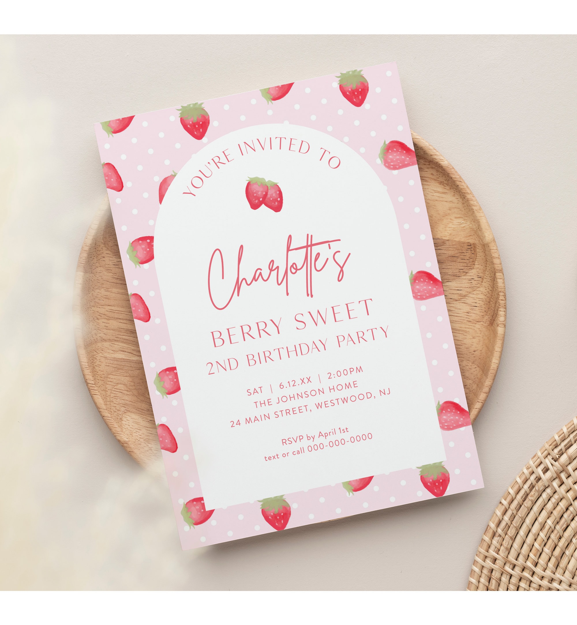 This berry sweet birthday Invitation template is and instant download. Access your template within minutes of purchase and edit in Templett - A fully customizable template editor that allows you to personalize your printable directly in your web browser. No software to install or fonts to download.