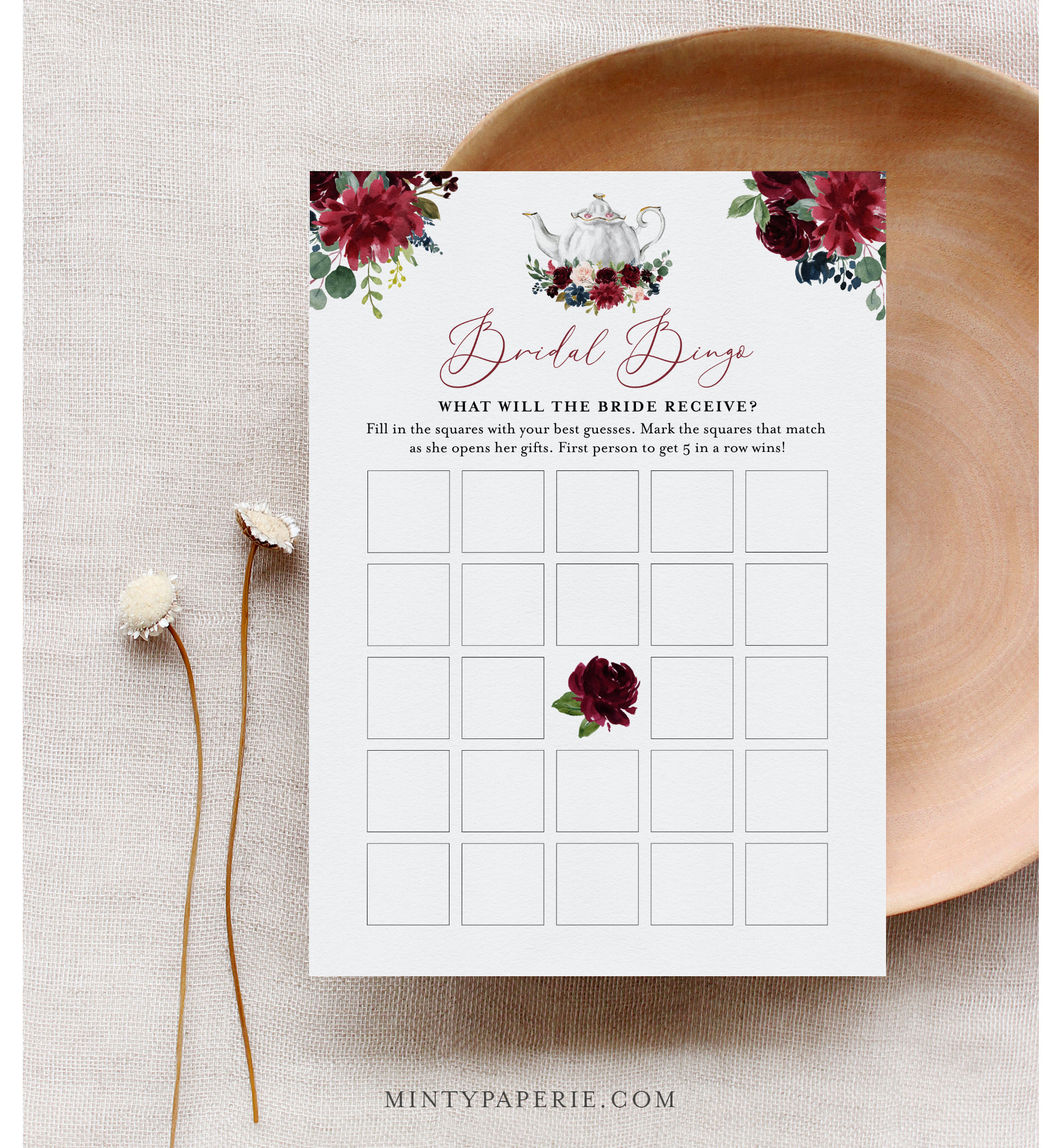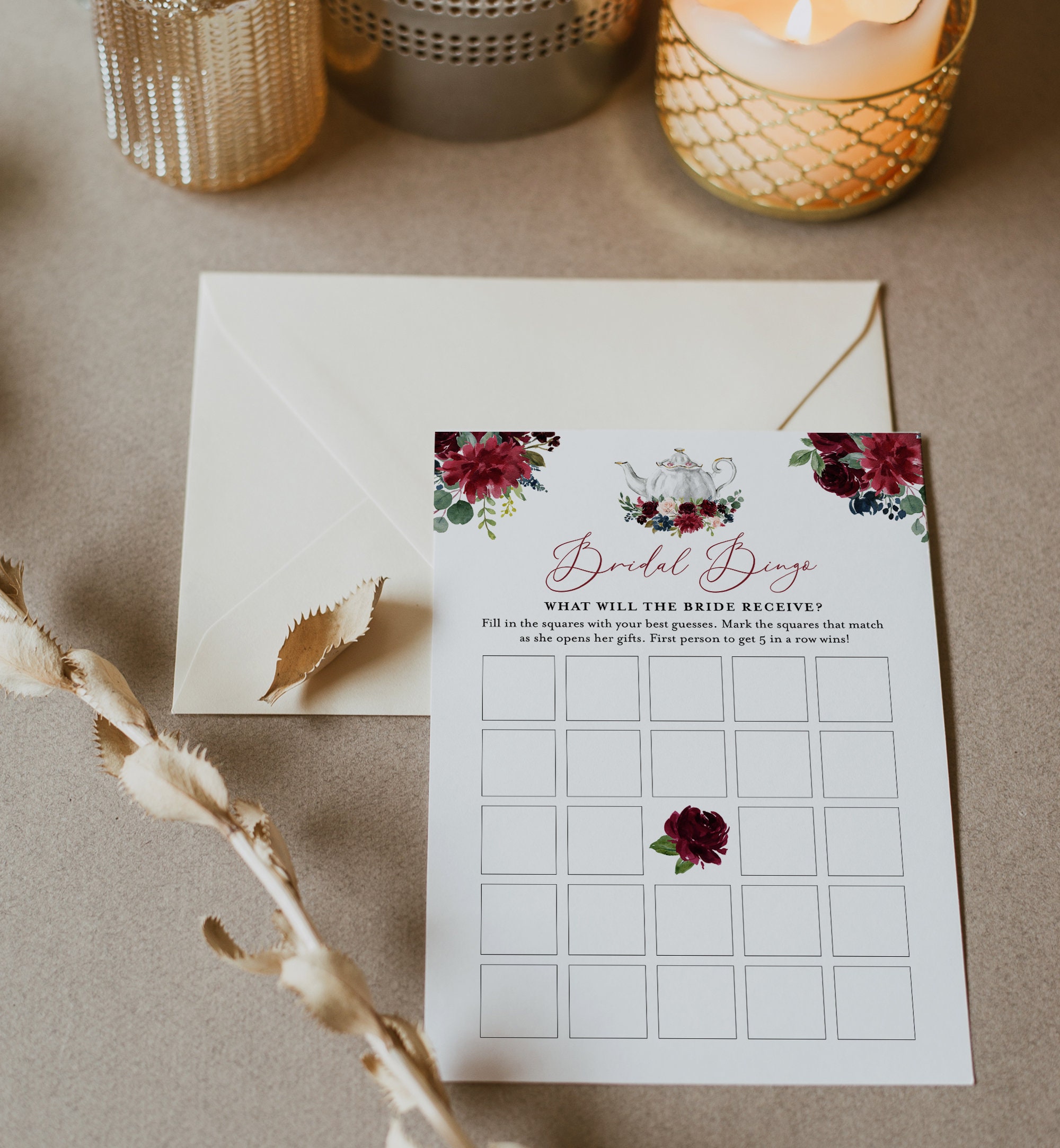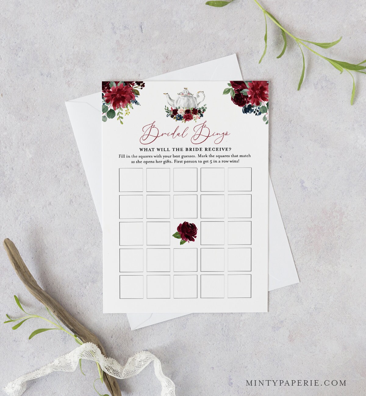 This BRIDAL BINGO GAME features a hand-painted teapot with boho florals. It's an INSTANT DOWNLOAD - Access your template within minutes of purchase and edit in TEMPLETT - A fully customizable template editor that allows you to personalize your printable directly in your web browser. No software to install or fonts to download.