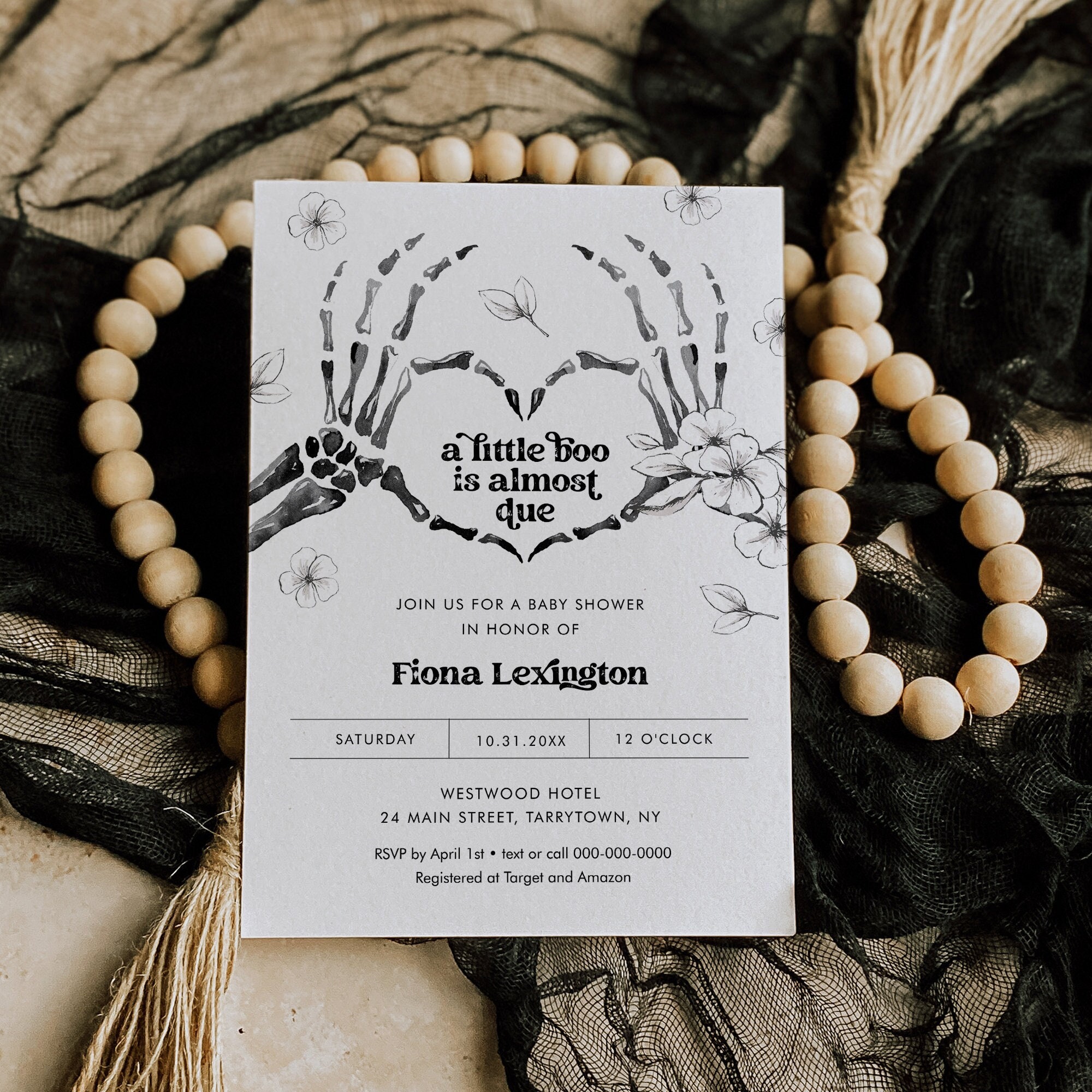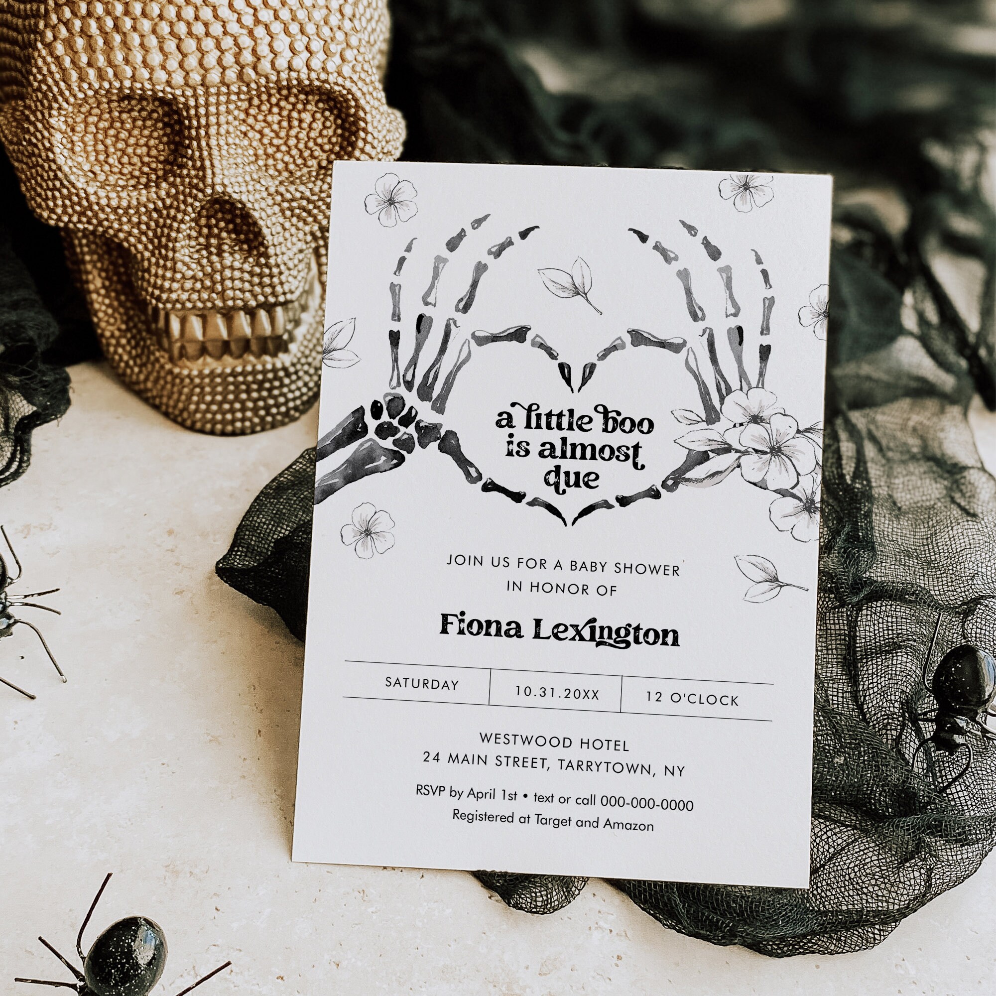 This halloween baby shower Invitation template is and instant download. Access your template within minutes of purchase and edit in Templett - A fully customizable template editor that allows you to personalize your printable directly in your web browser. No software to install or fonts to download.