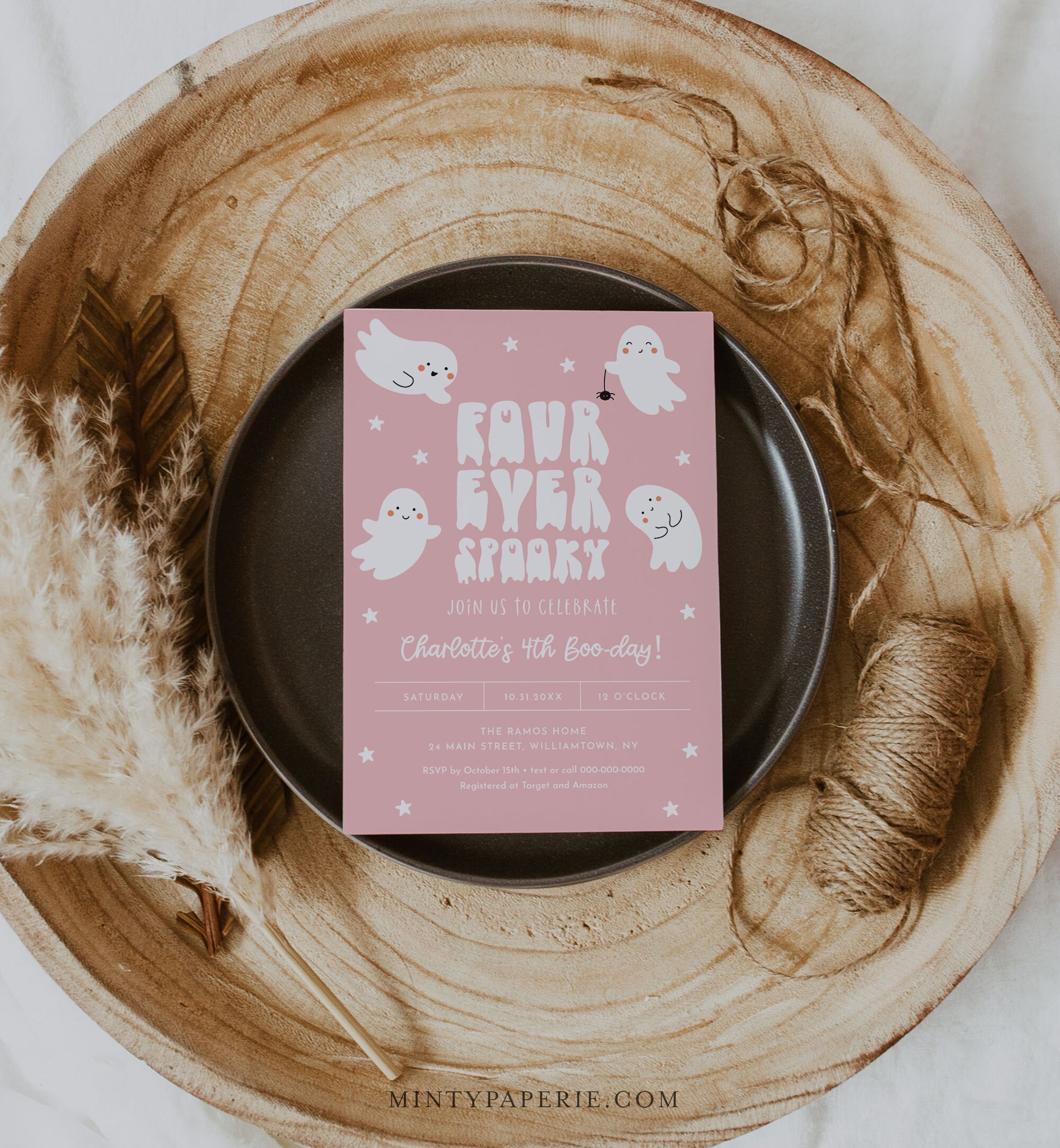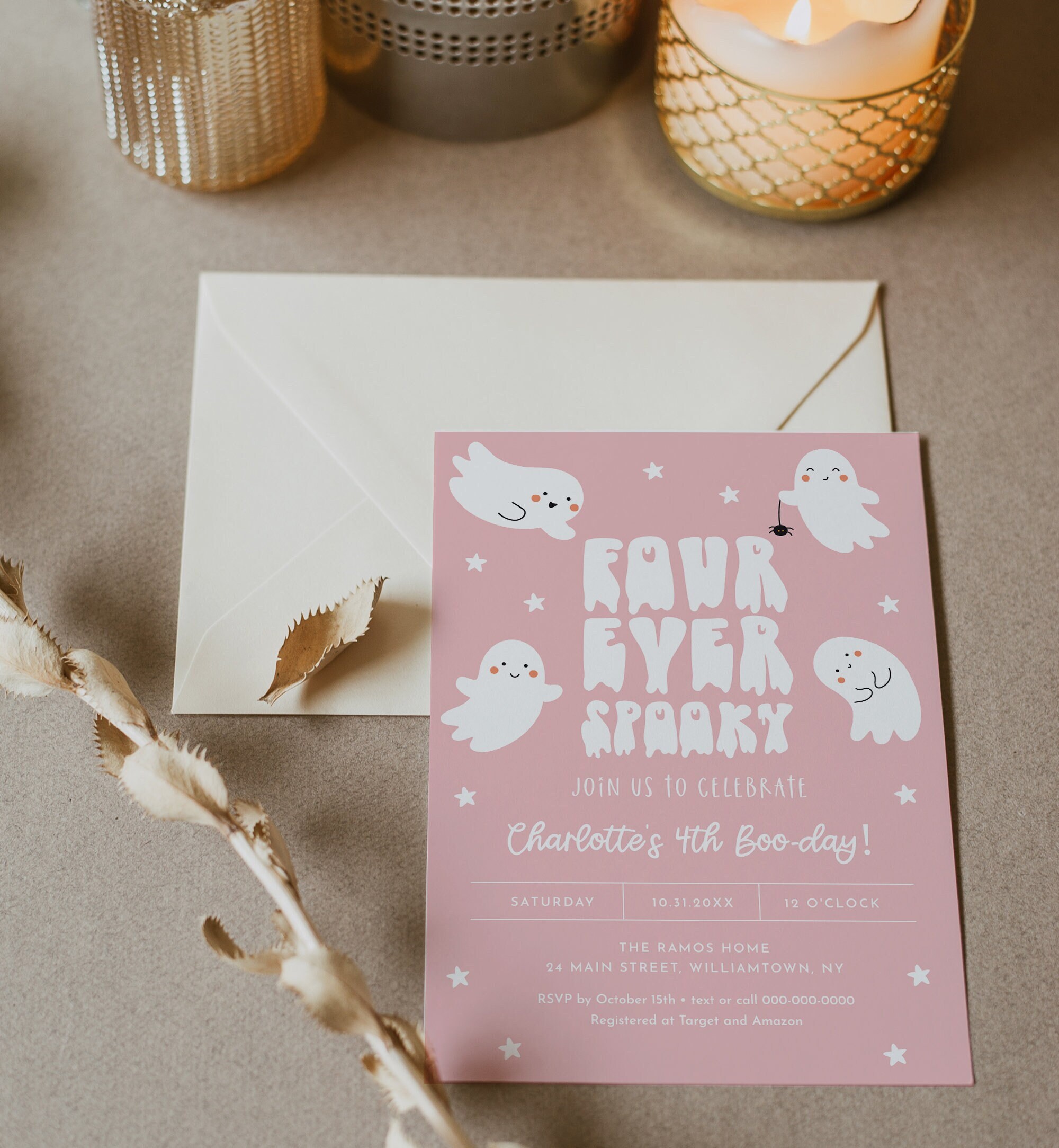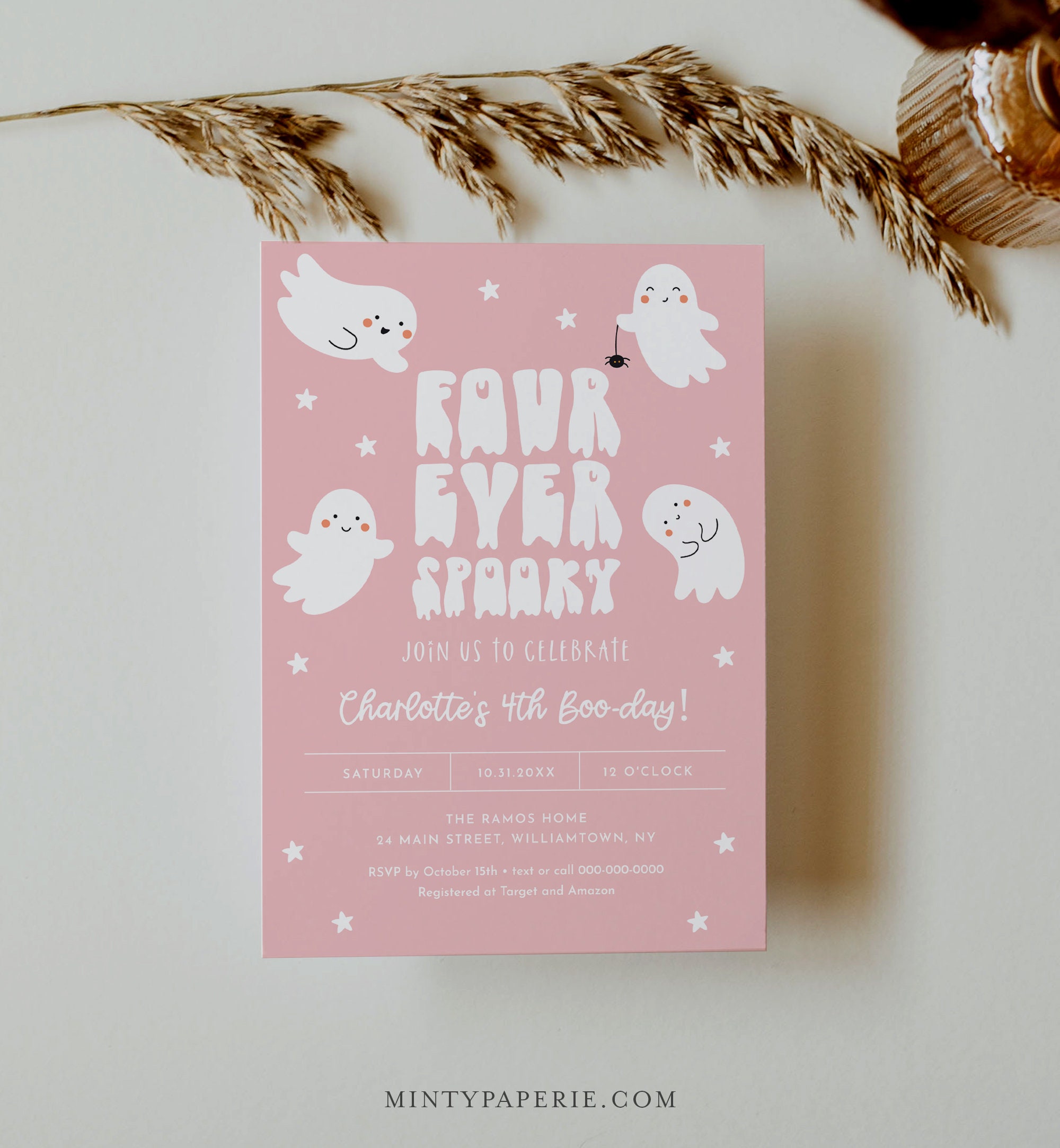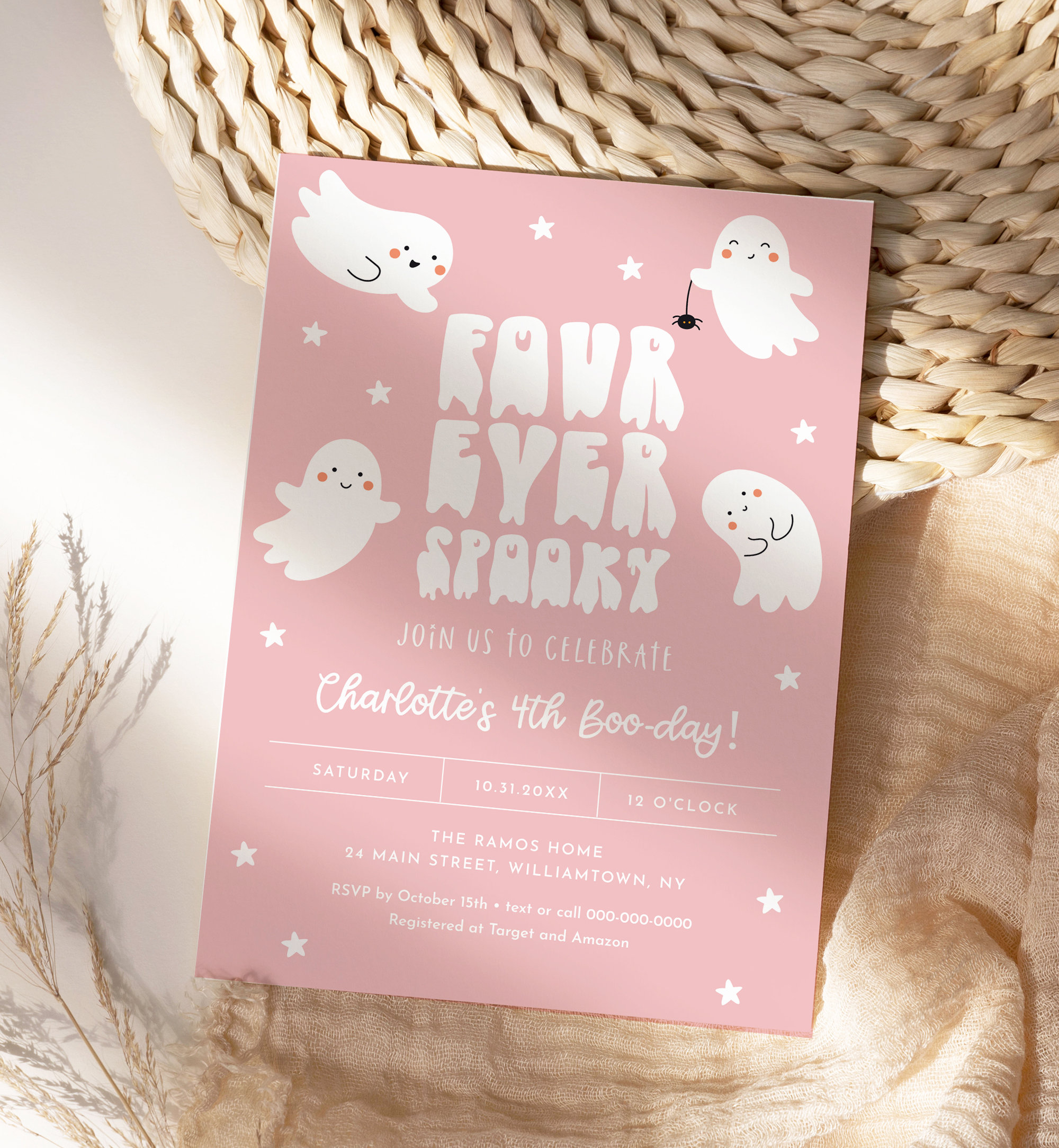 This halloween 4th birthday Invitation template is and instant download. Access your template within minutes of purchase and edit in Templett - A fully customizable template editor that allows you to personalize your printable directly in your web browser. No software to install or fonts to download.