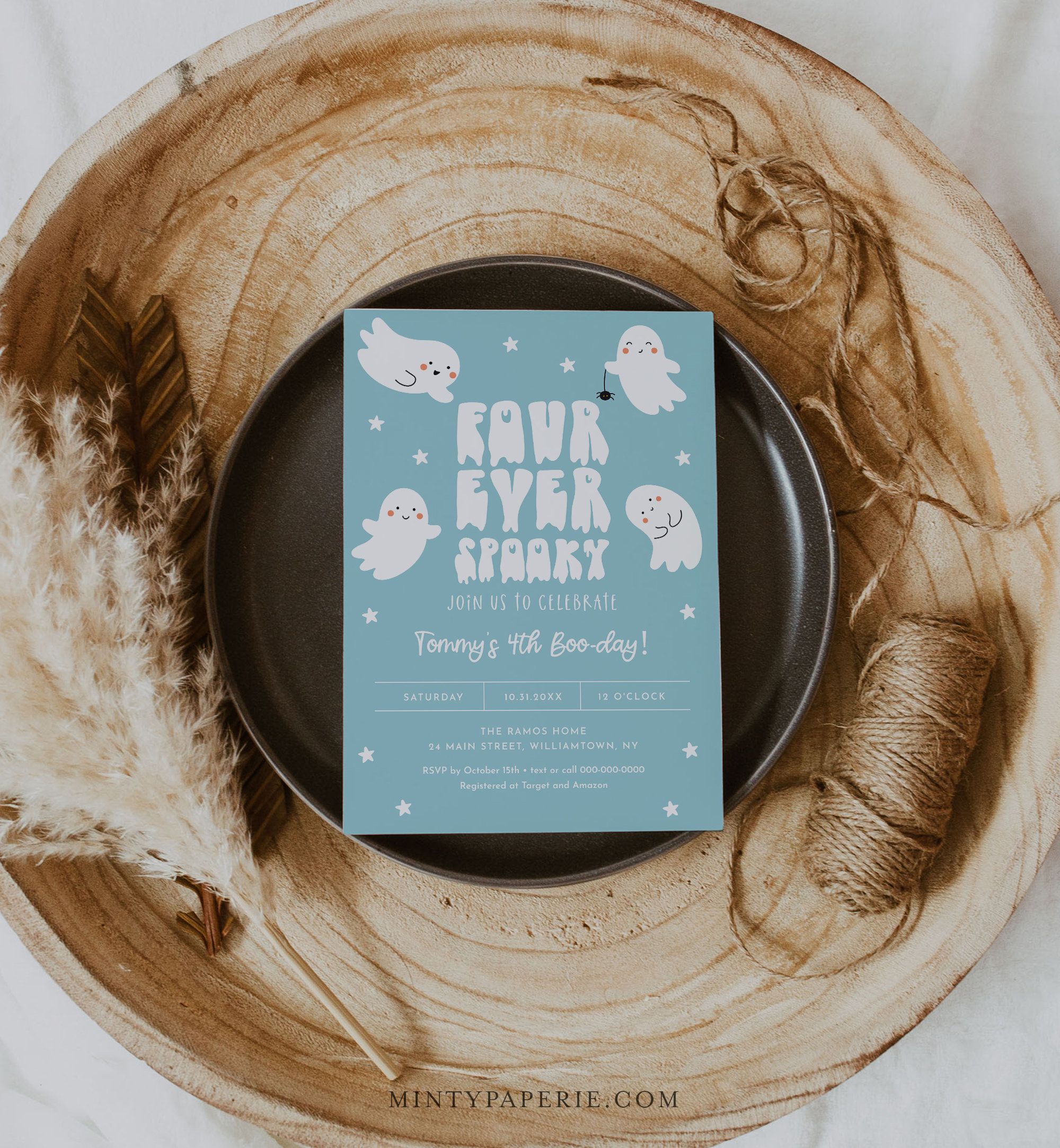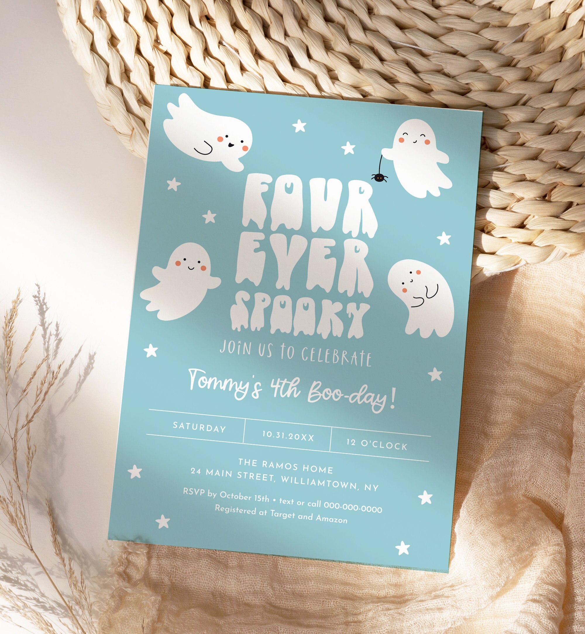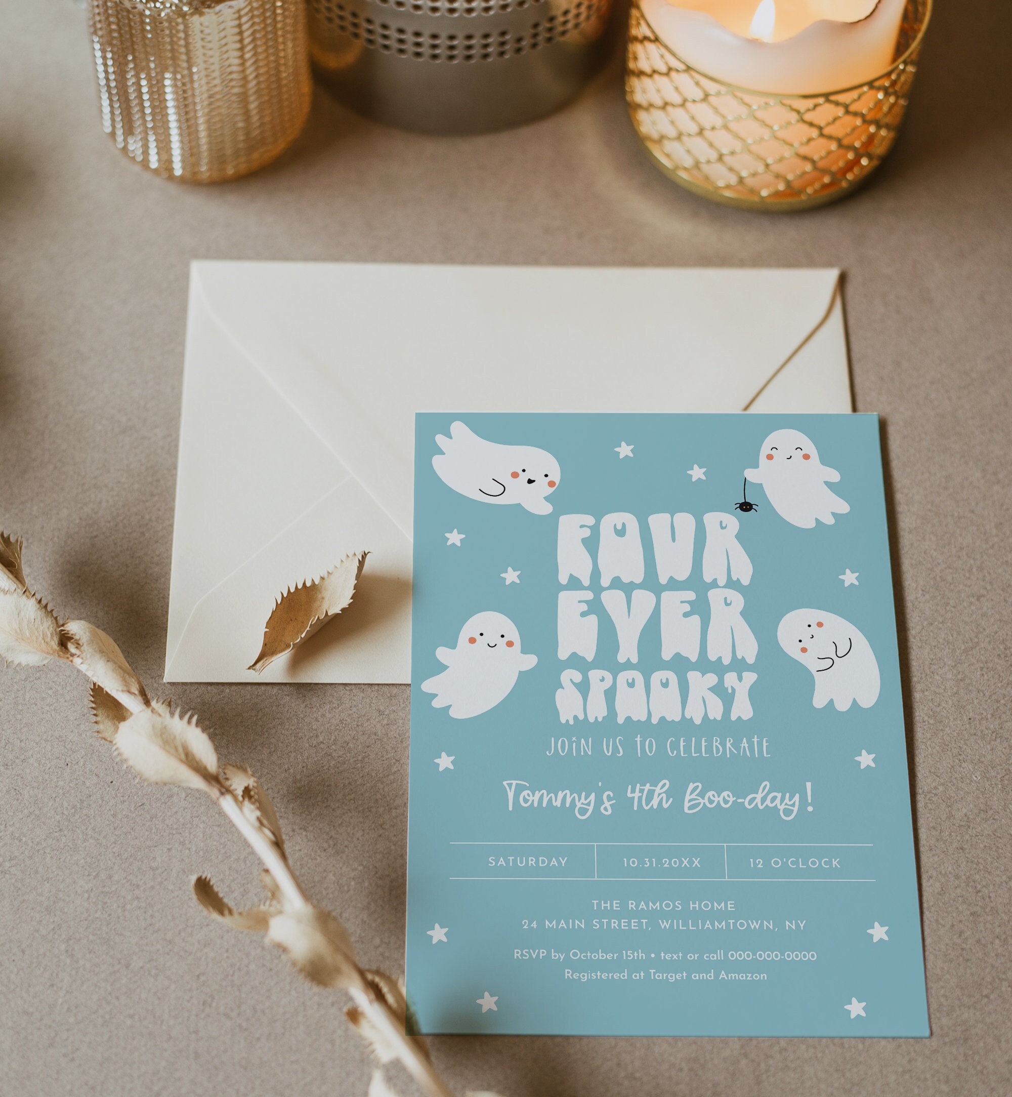 This halloween 4th birthday Invitation template is and instant download. Access your template within minutes of purchase and edit in Templett - A fully customizable template editor that allows you to personalize your printable directly in your web browser. No software to install or fonts to download.