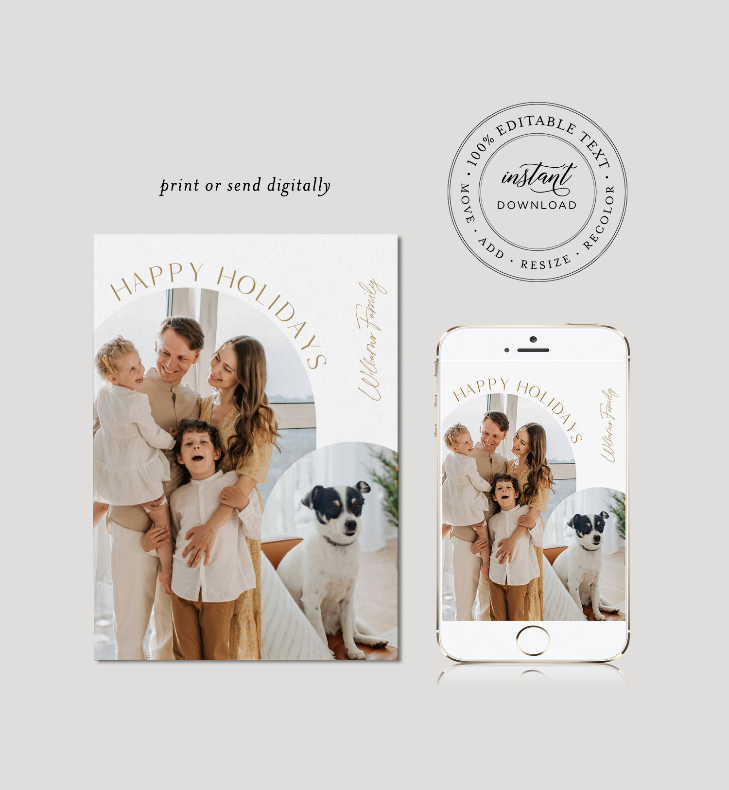This photo holiday card template is an instant download. Access your template within minutes of purchase and edit using Templett - A fully customizable template editor that allows you to personalize your printable directly in your web browser. No software to install or fonts to download.