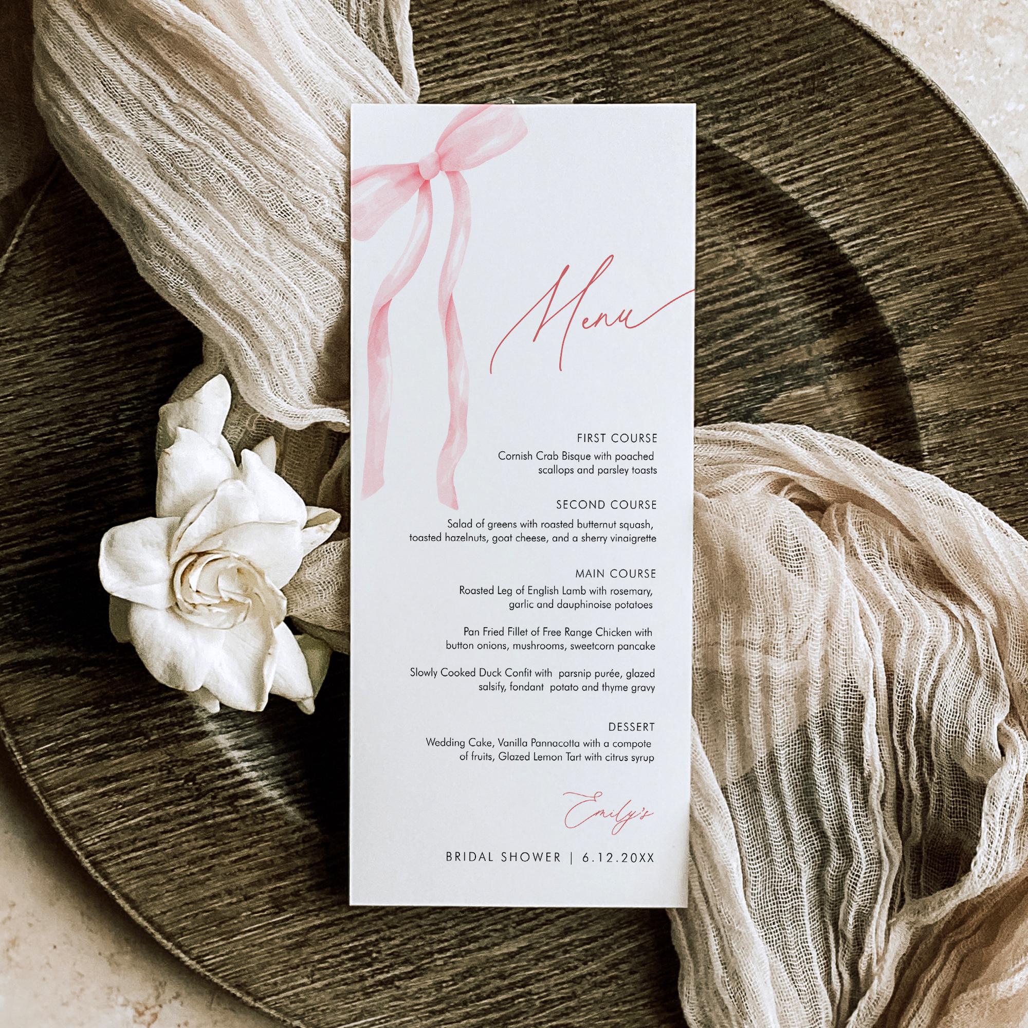 This coquette bow menu template is an instant download. Access your template within minutes of purchase and edit in Templett - A fully customizable template editor that allows you to personalize your printable directly in your web browser. No software to install or fonts to download.