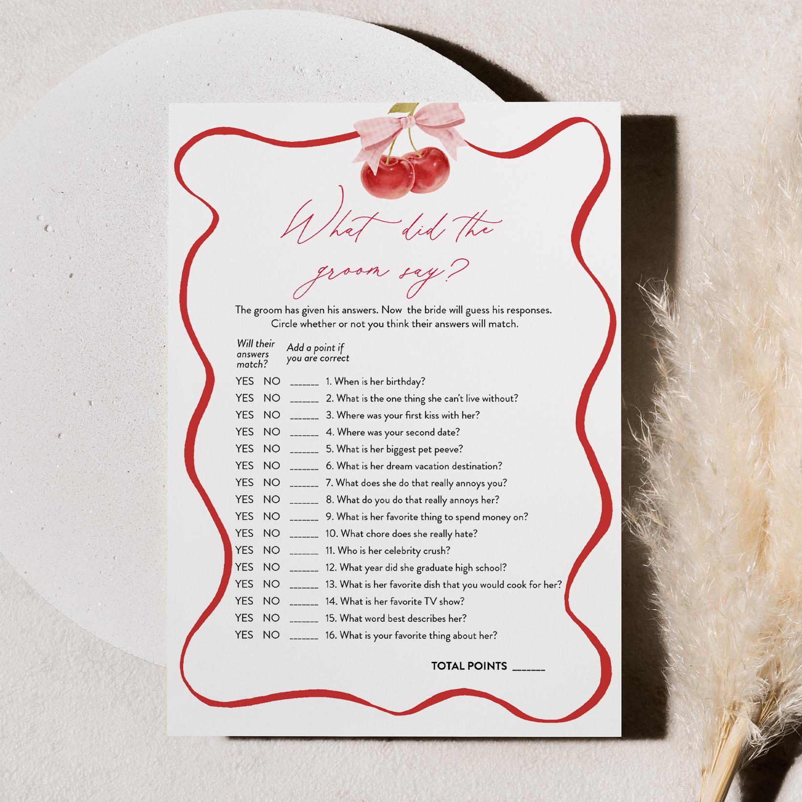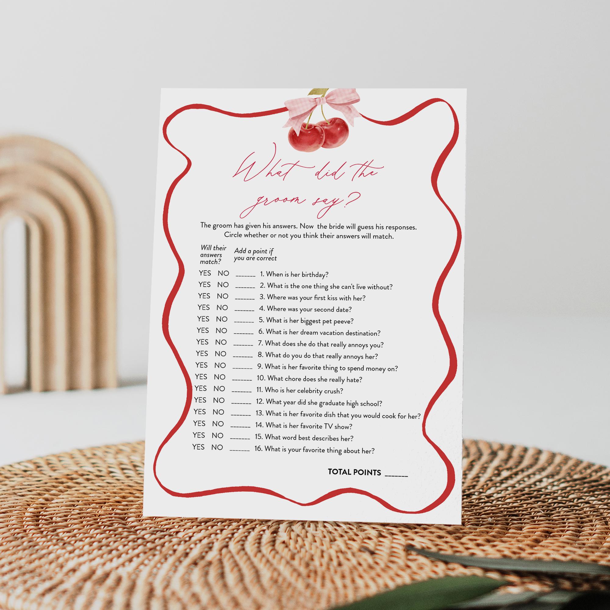 This What Did the Groom Say Game is an instant download. Access your template within minutes of purchase and edit in Templett - A fully customizable template editor that allows you to personalize your printable directly in your web browser. No software to install or fonts to download.