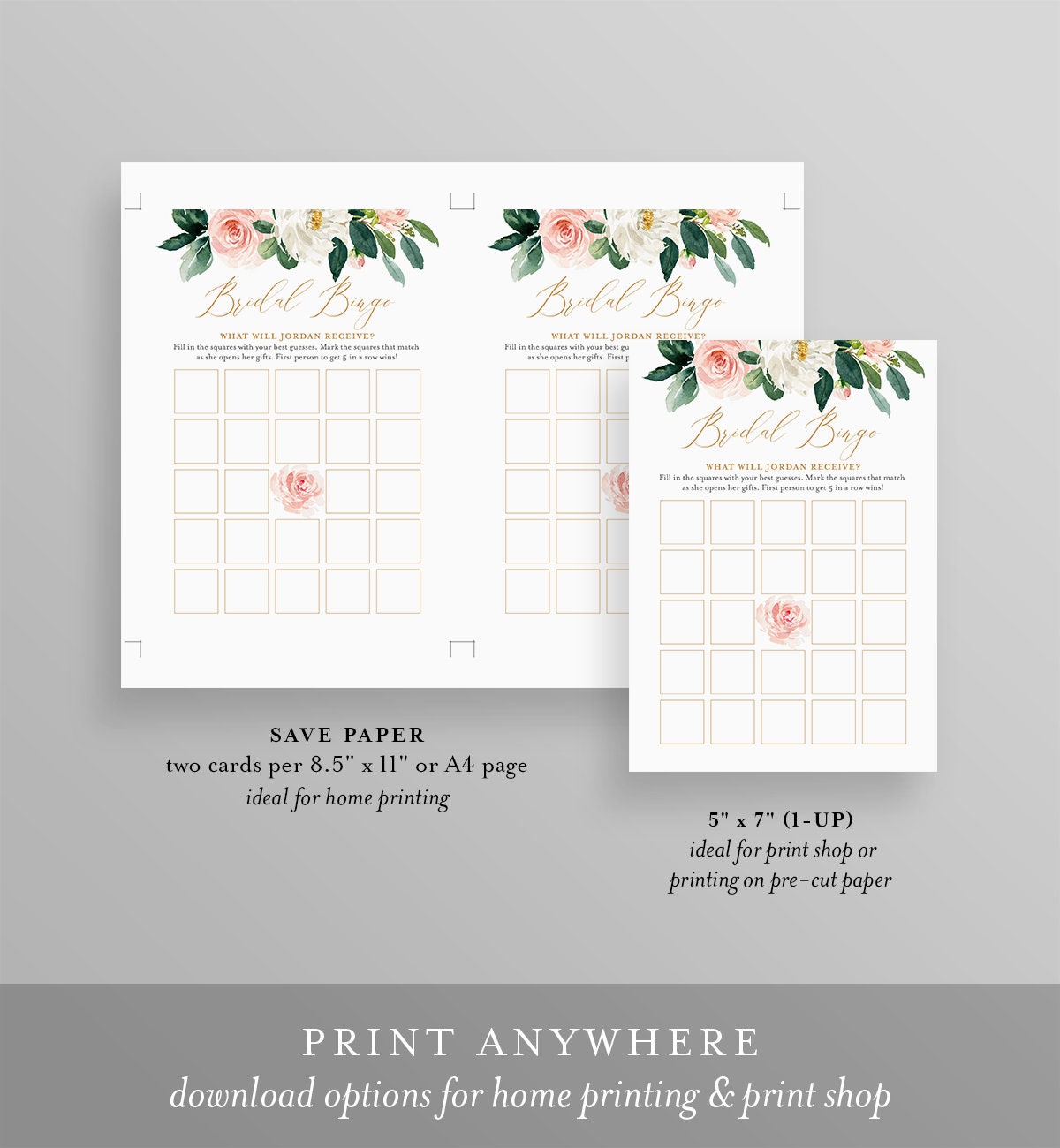 This BRIDAL SHOWER BINGO GAME template features hand-painted blush and cream florals and greenery. It's an INSTANT DOWNLOAD - Access your template within minutes of purchase and edit in TEMPLETT - A fully customizable template editor that allows you to personalize your printable directly in your web browser. No software to install or fonts to download.