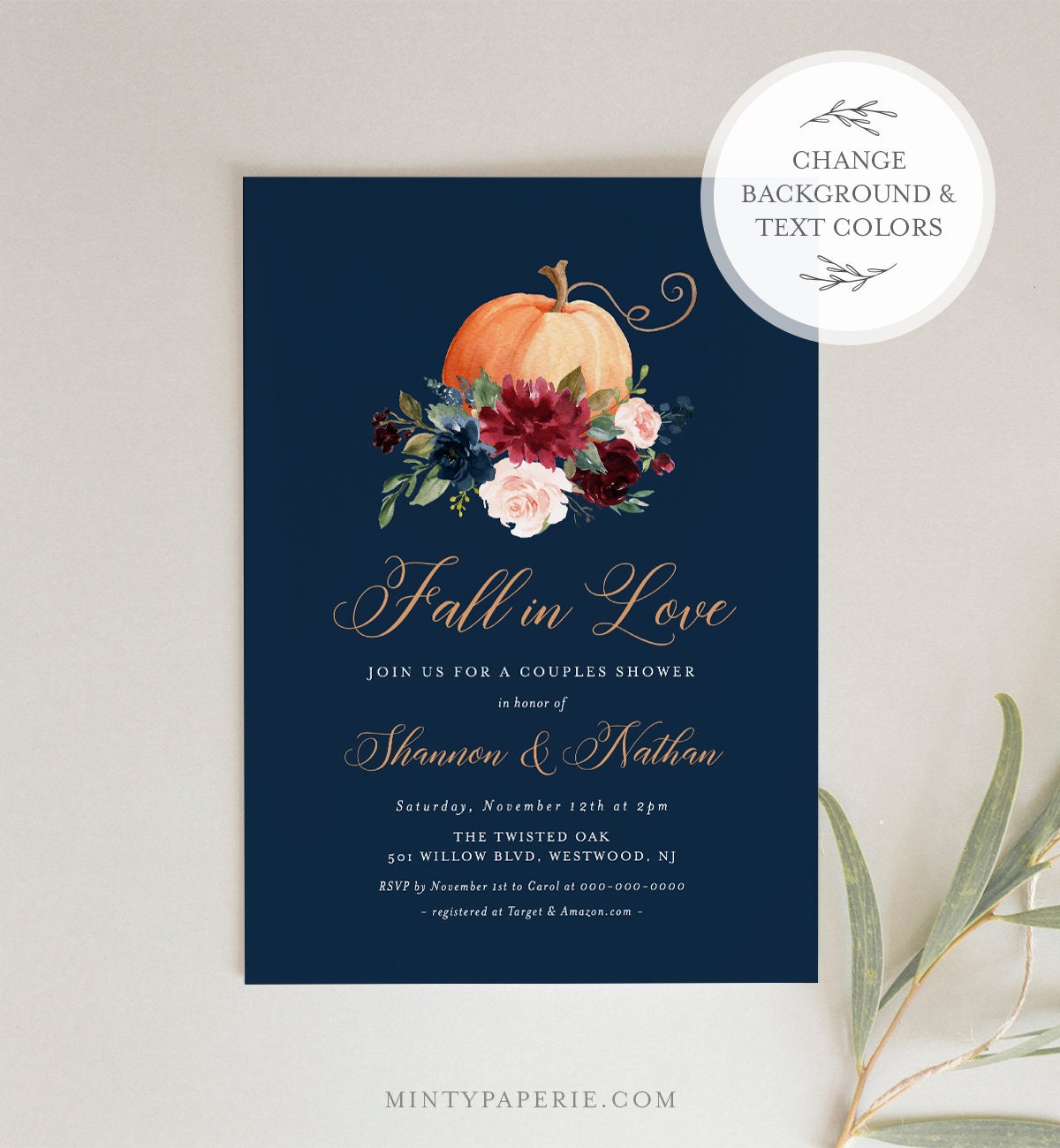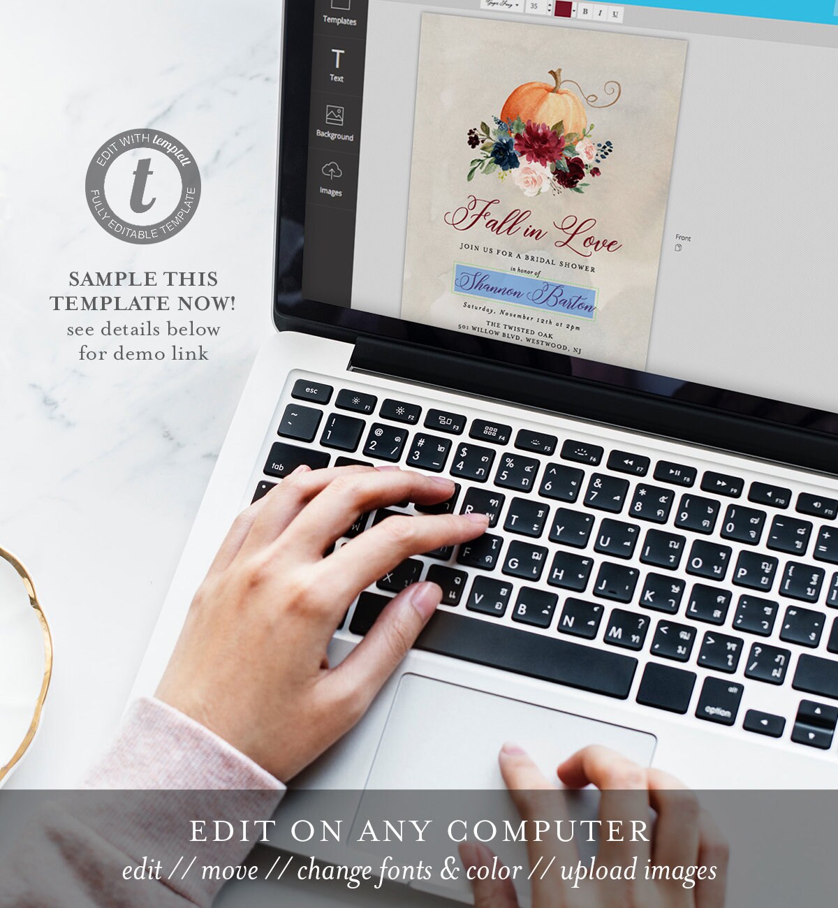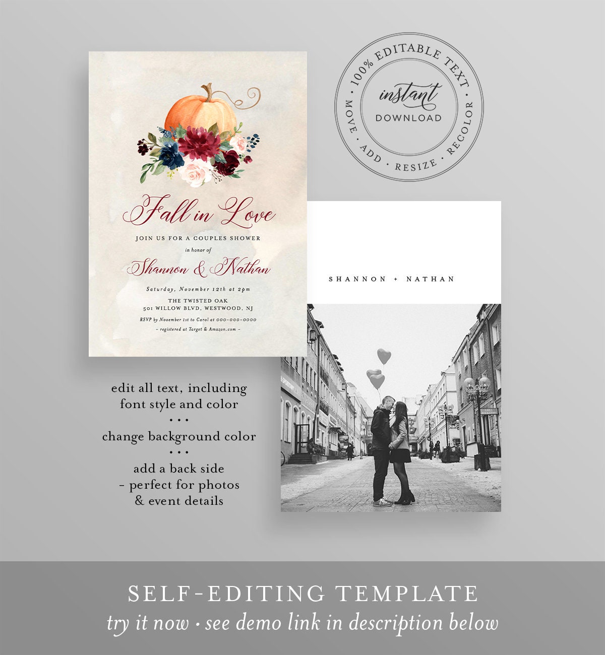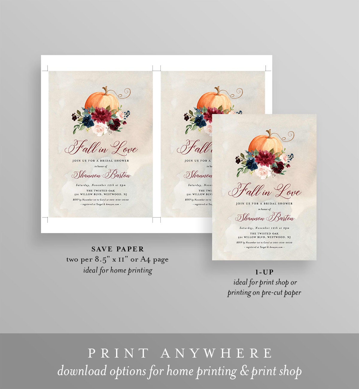 This BRIDAL SHOWER INVITATION features a hand-painted pumpkin with boho burgundy florals and greenery. It's an INSTANT DOWNLOAD, so access your template within minutes of purchase and edit using TEMPLETT - A fully customizable template editor that allows you to personalize your printable directly in your web browser. No software to install or fonts to download.