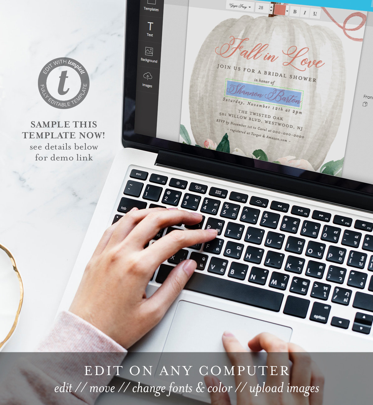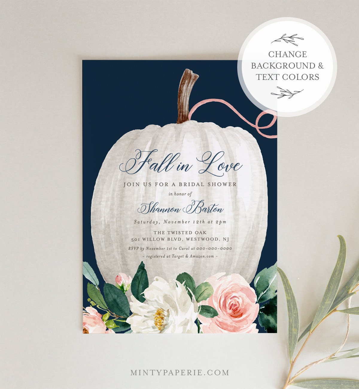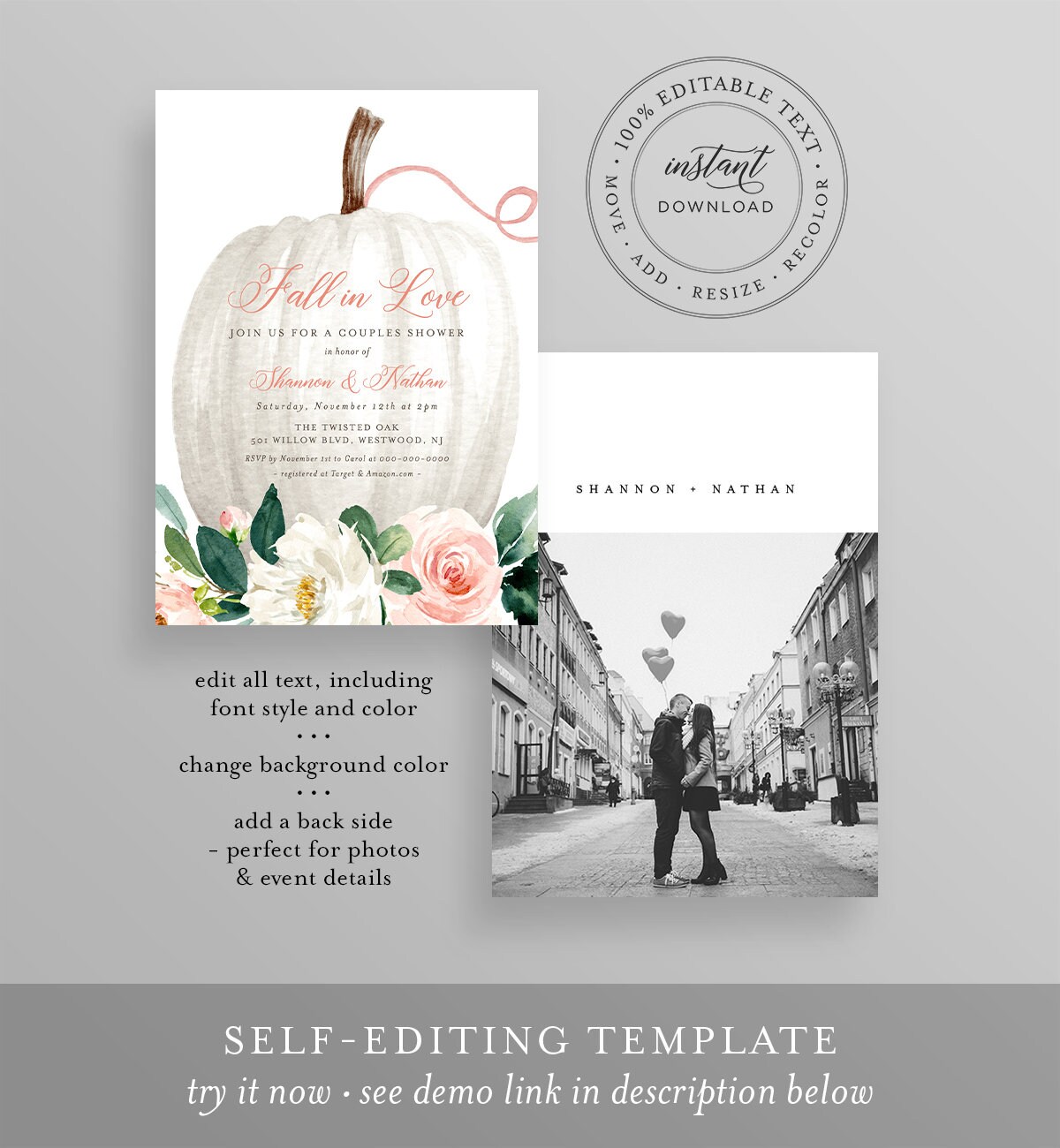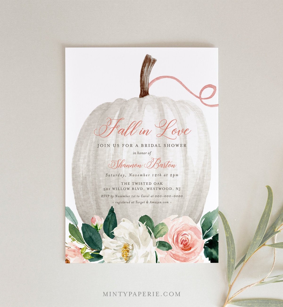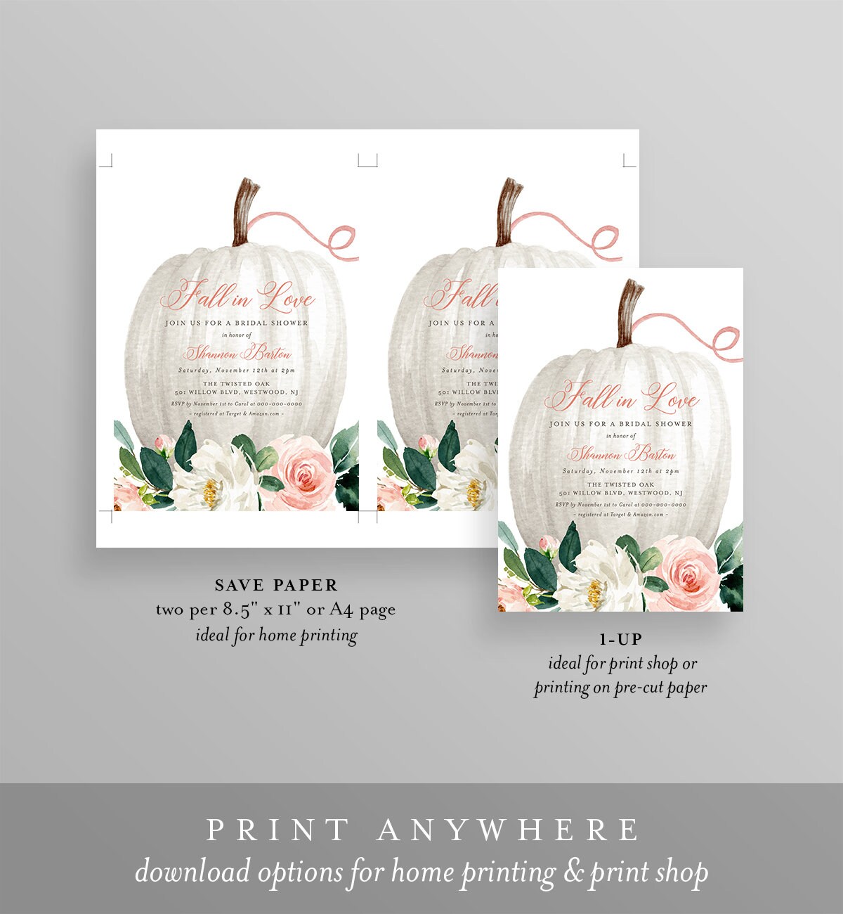 This BRIDAL SHOWER INVITATION features a hand-painted pumpkin with pink florals and greenery. It's an INSTANT DOWNLOAD, so access your template within minutes of purchase and edit using TEMPLETT - A fully customizable template editor that allows you to personalize your printable directly in your web browser. No software to install or fonts to download.