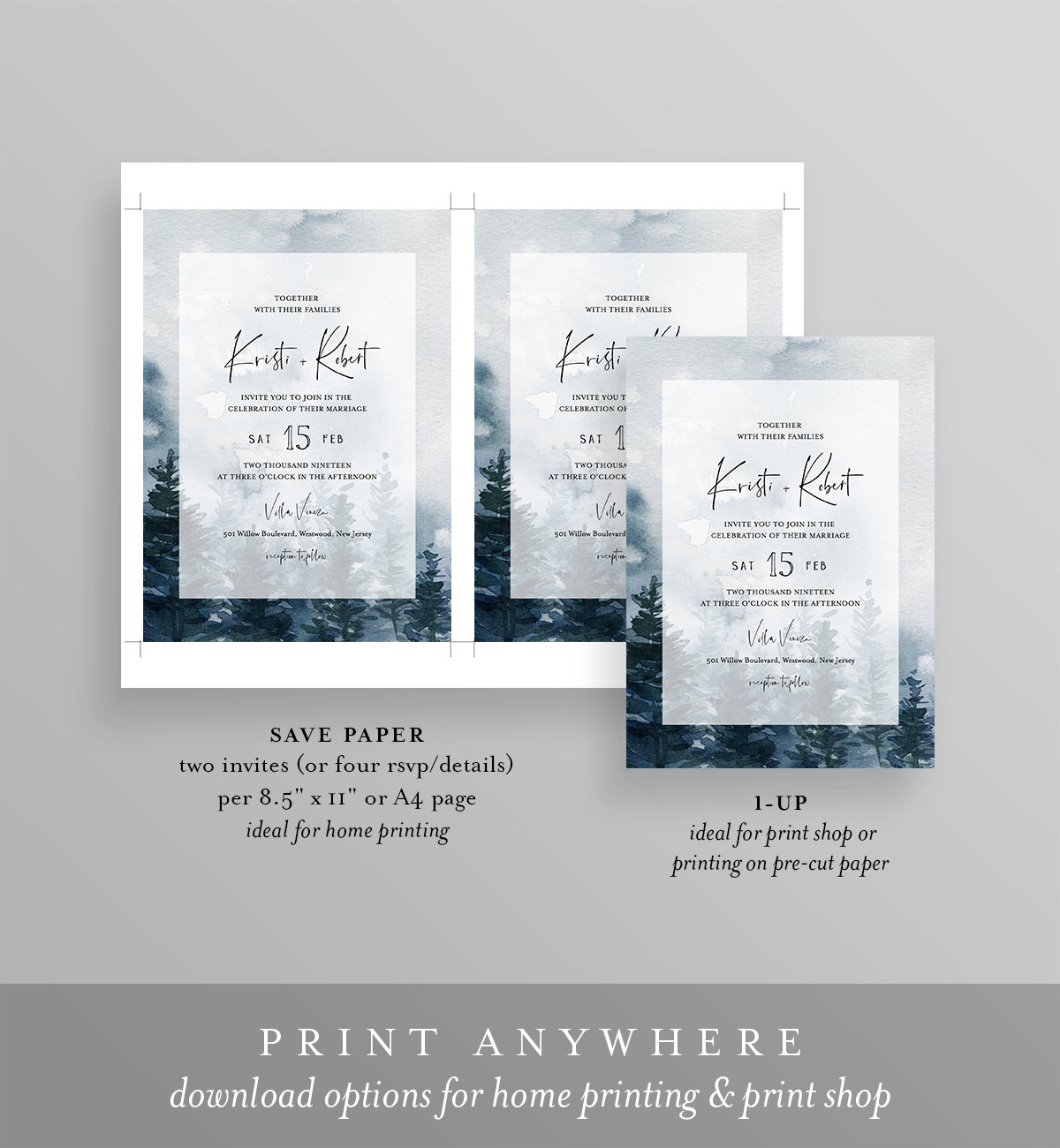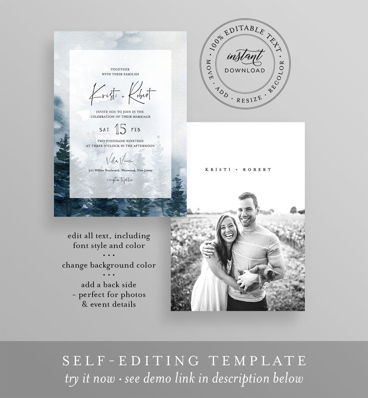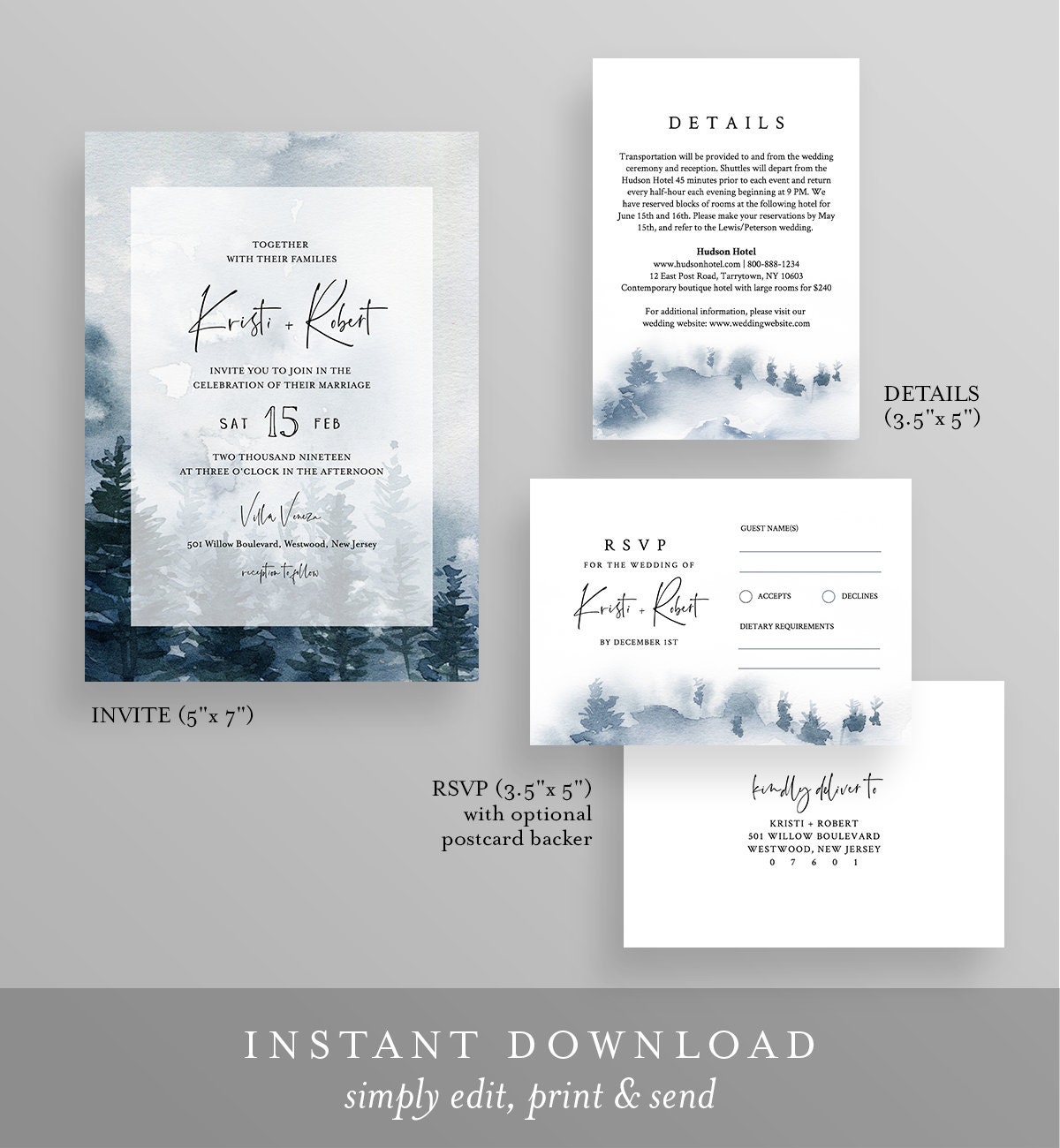 This WEDDING INVITATION SUITE features stunning watercolor woodland and pine landscape - perfect for a rustic fall or winter wedding. It's an INSTANT DOWNLOAD, so you get to access your template within minutes of purchase and edit in TEMPLETT - A fully customizable template editor that allows you to personalize your printable directly in your web browser. No software to install or fonts to download.