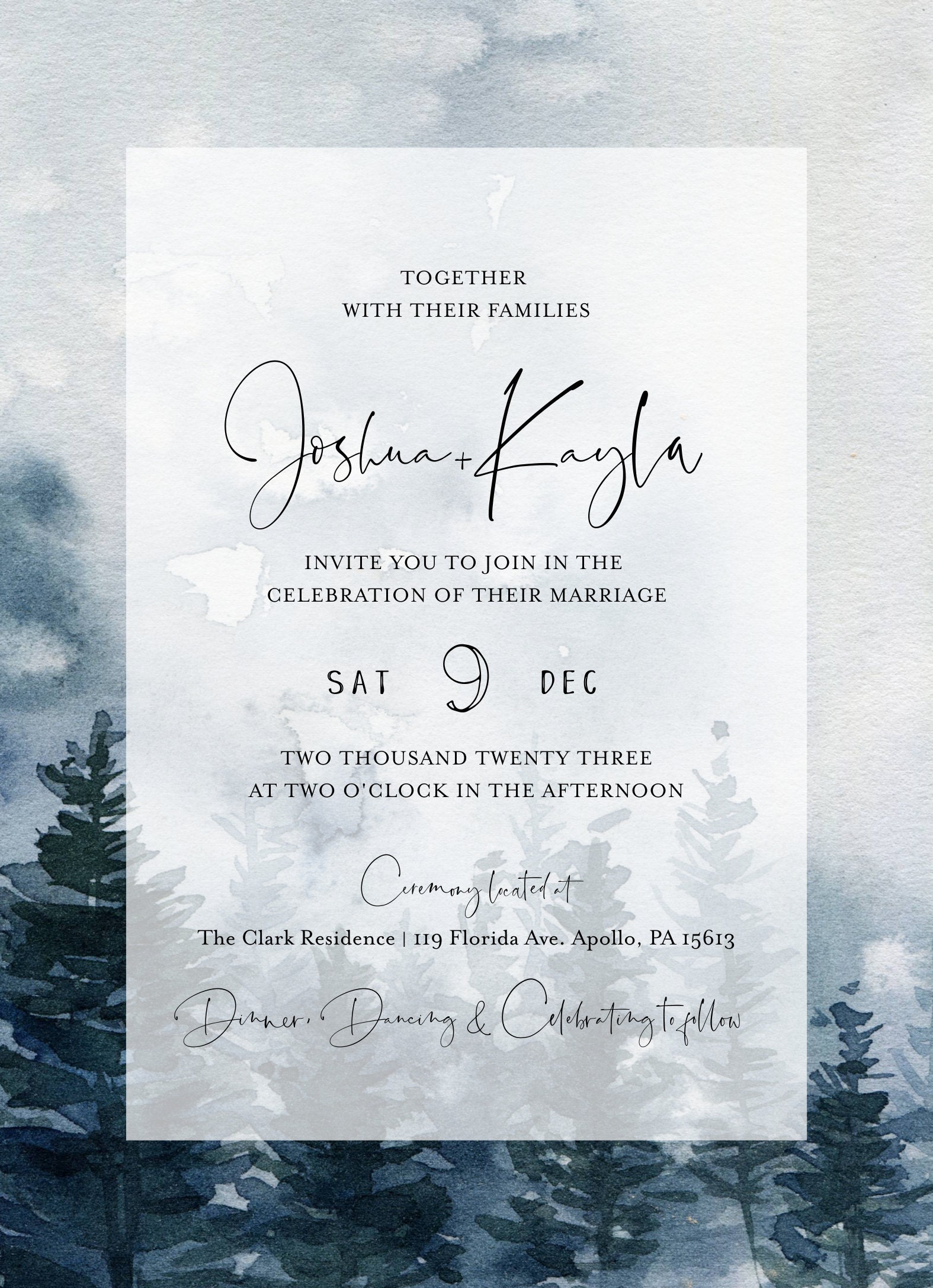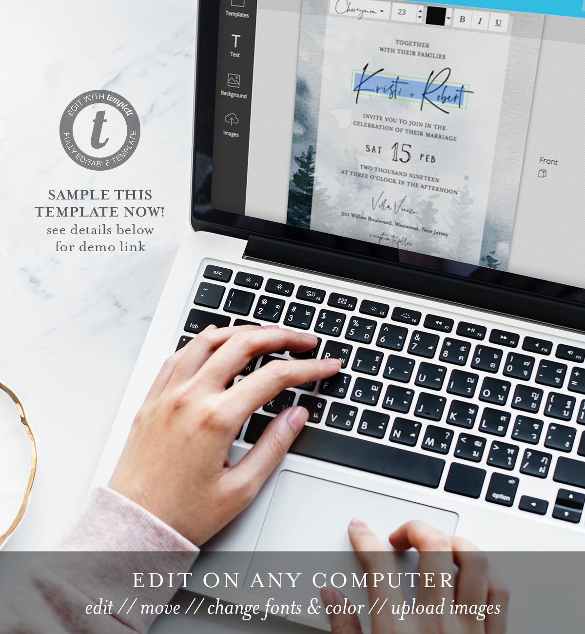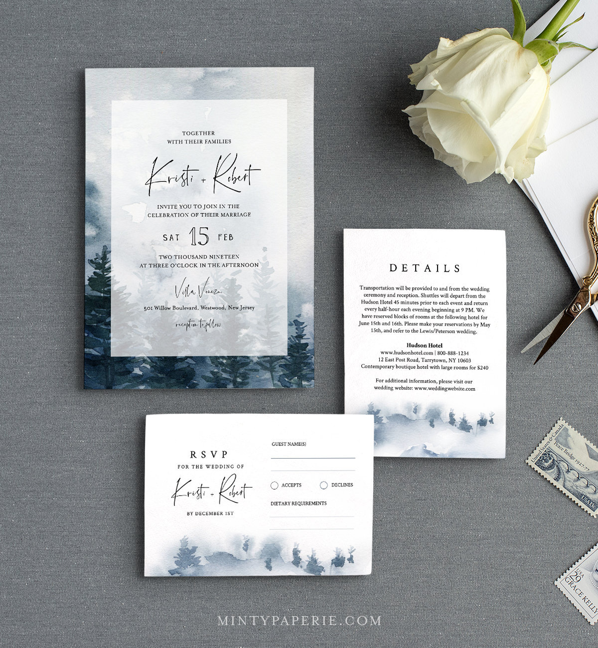 This WEDDING INVITATION SUITE features stunning watercolor woodland and pine landscape - perfect for a rustic fall or winter wedding. It's an INSTANT DOWNLOAD, so you get to access your template within minutes of purchase and edit in TEMPLETT - A fully customizable template editor that allows you to personalize your printable directly in your web browser. No software to install or fonts to download.