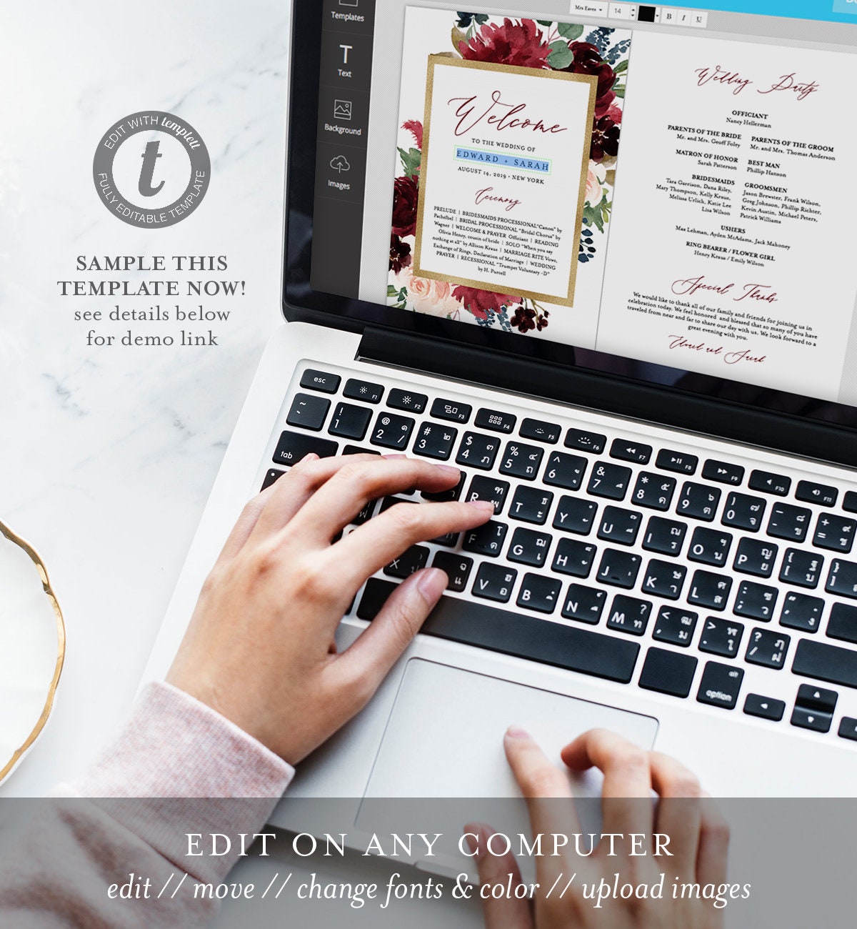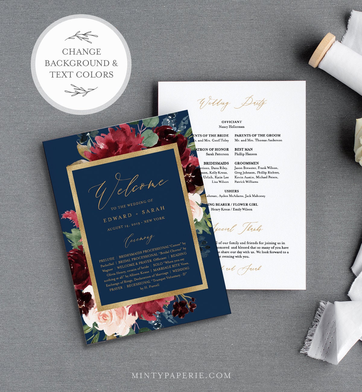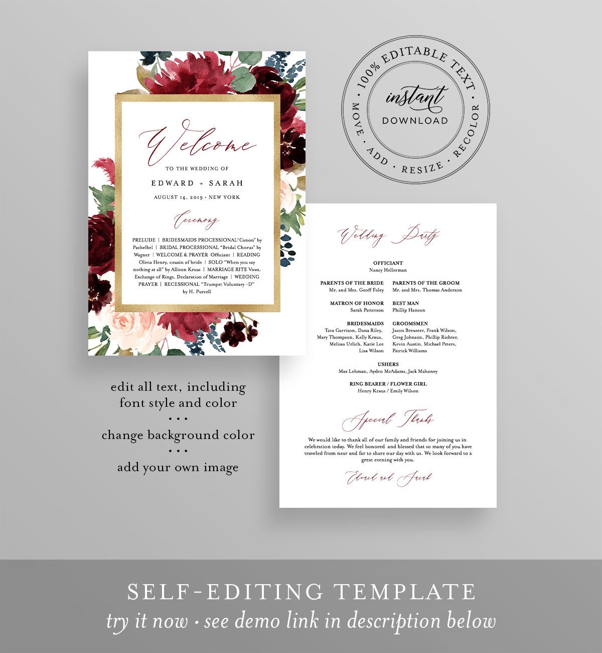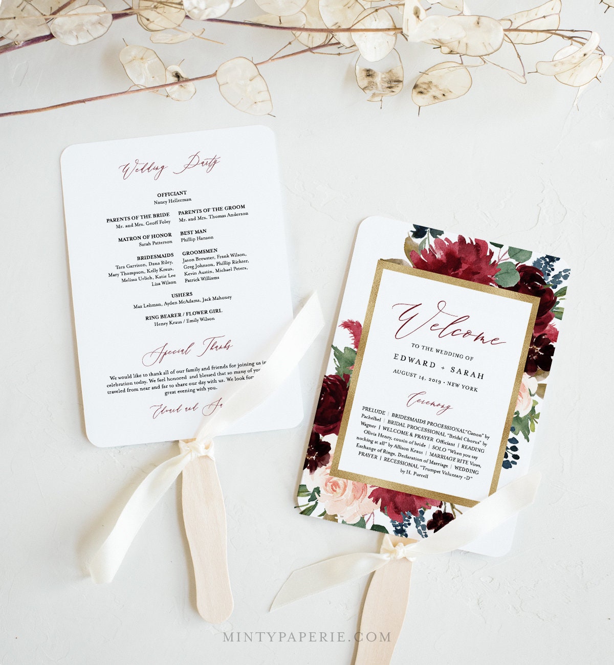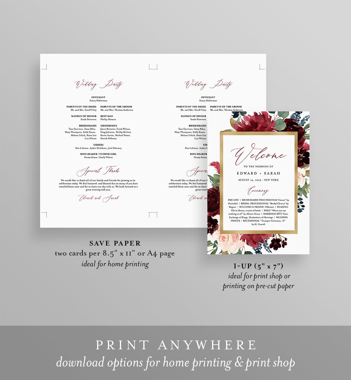 This WEDDING PROGRAM (FAN OR FLAT) template features hand-painted florals in rich merlot and burgundy tones accented with light pink and blue hues - a perfect program for a fall or winter wedding. It's an INSTANT DOWNLOAD, so you get to access your templates within minutes of purchase. Edit in TEMPLETT - A fully customizable template editor that allows you to personalize your printable directly in your web browser. No software to install or fonts to download.