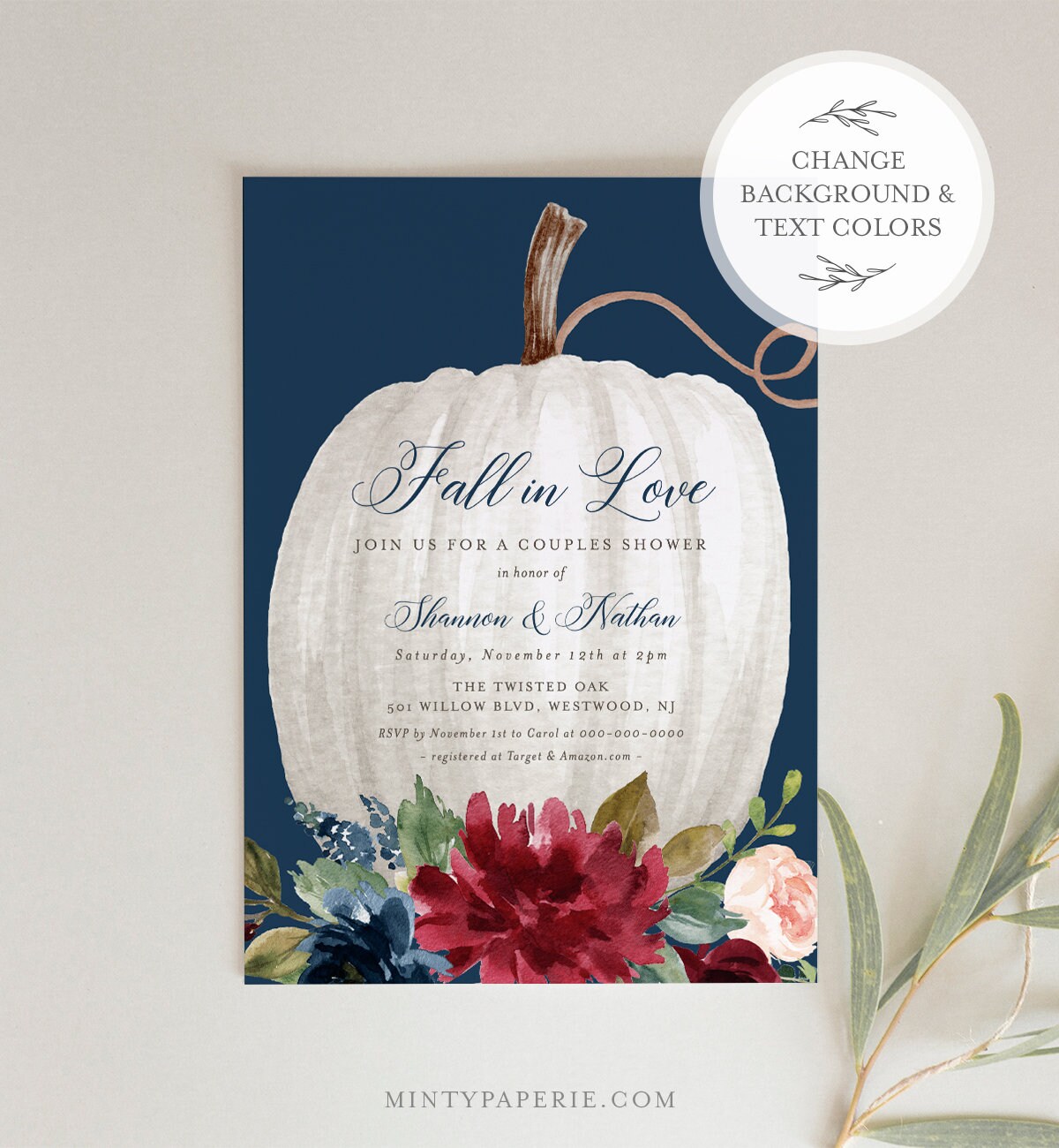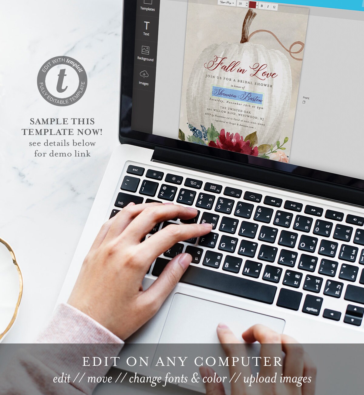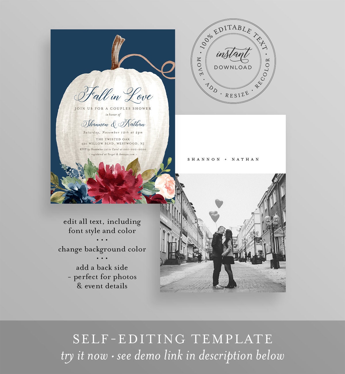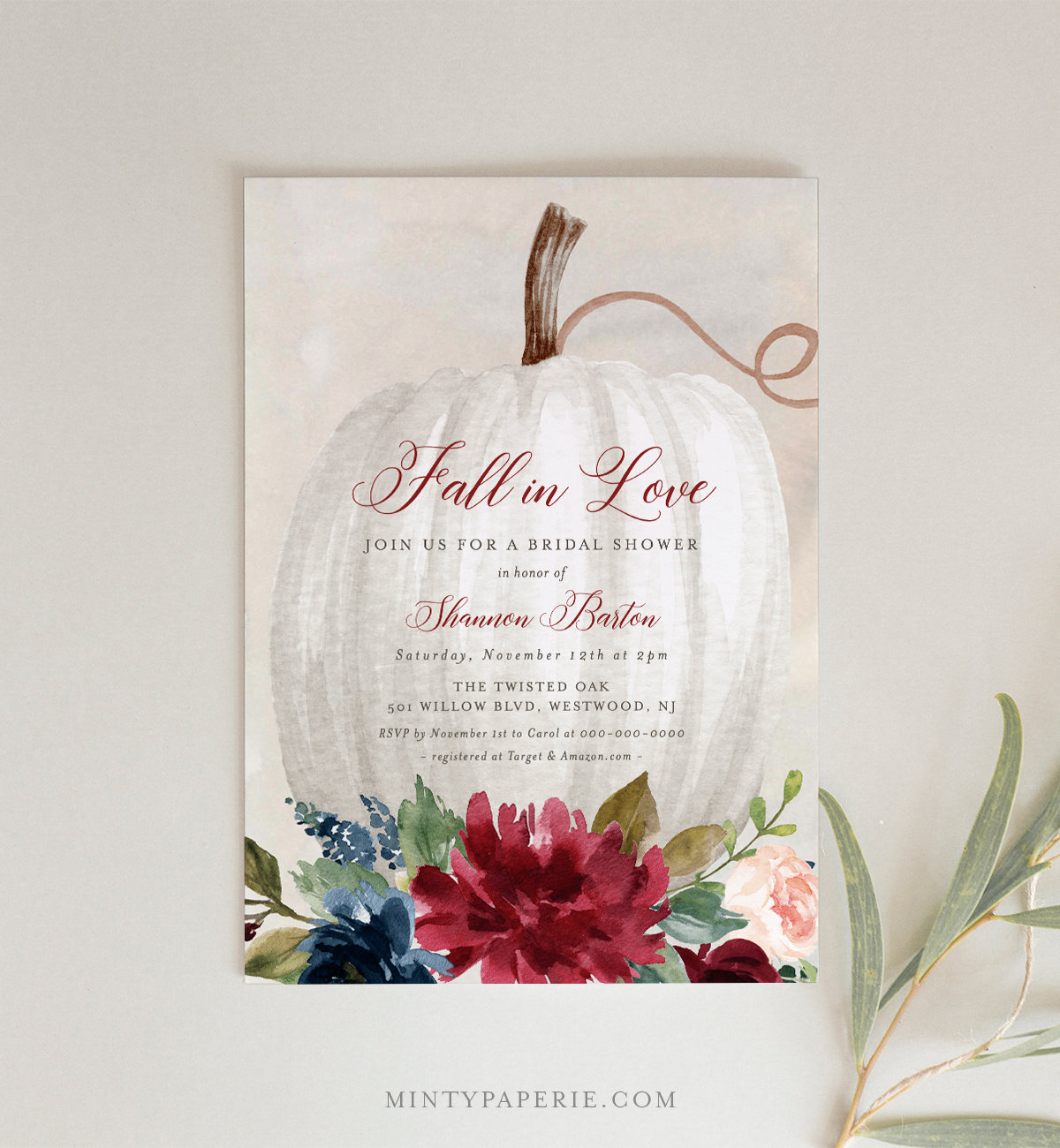 This BRIDAL SHOWER INVITATION features a hand-painted pumpkin with boho burgundy florals and greenery. It's an INSTANT DOWNLOAD, so access your template within minutes of purchase and edit using TEMPLETT - A fully customizable template editor that allows you to personalize your printable directly in your web browser. No software to install or fonts to download.