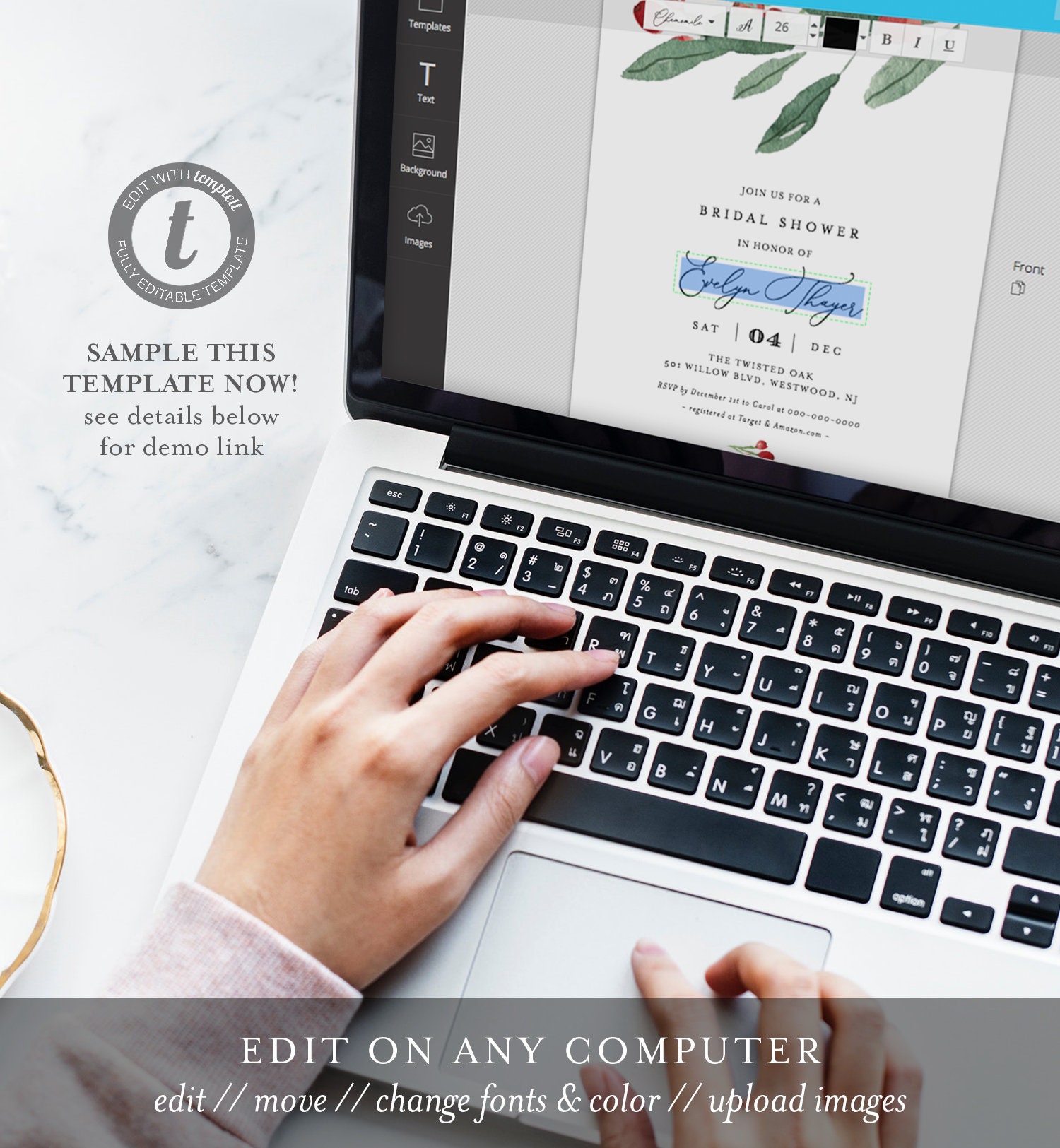 This BRIDAL SHOWER INVITATION features holly and winter foliage - perfect for a rustic fall or winter bridal or couples shower. It's an INSTANT DOWNLOAD, so access your template within minutes of purchase and edit using TEMPLETT - A fully customizable template editor that allows you to personalize your printable directly in your web browser. No software to install or fonts to download.