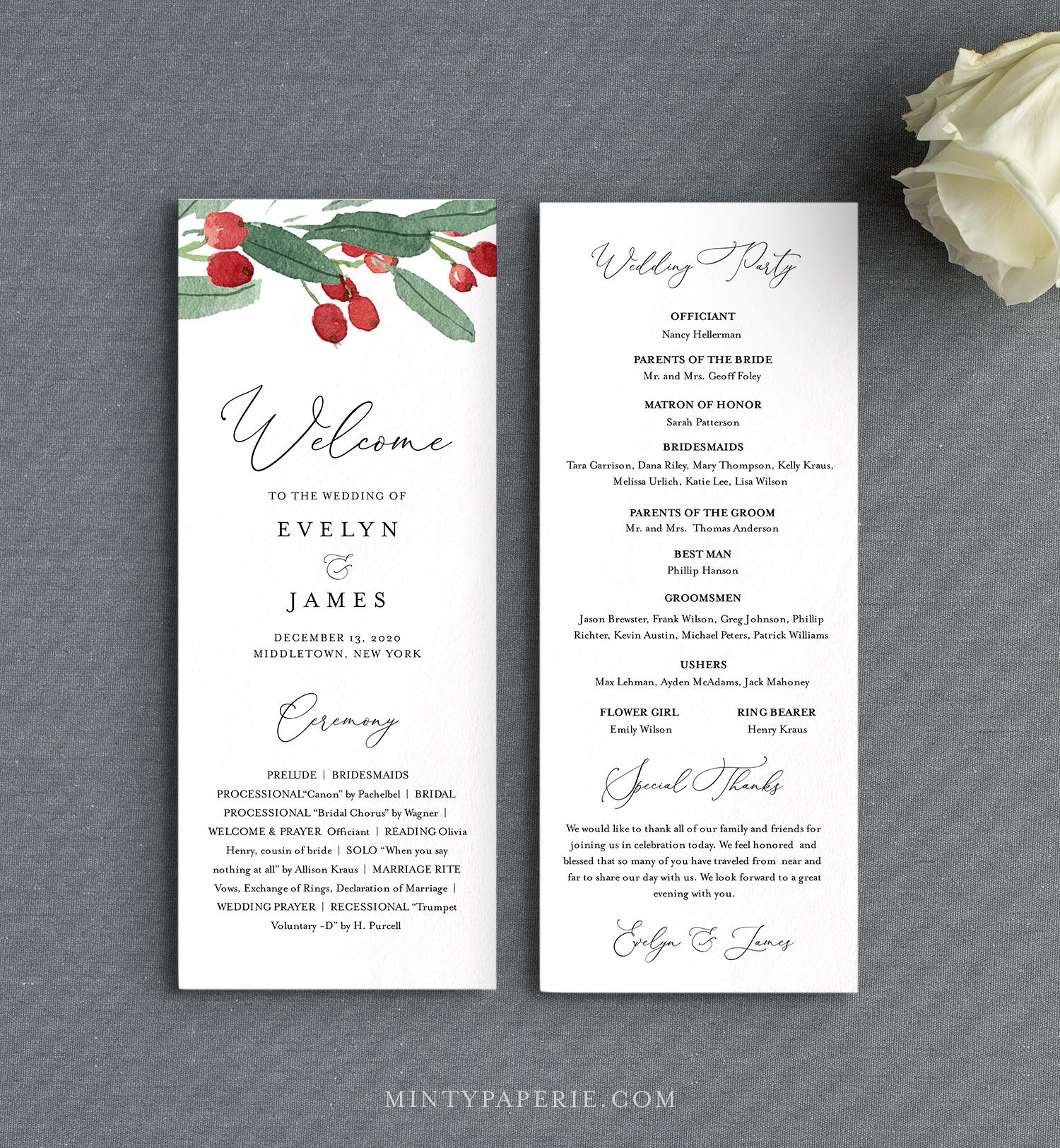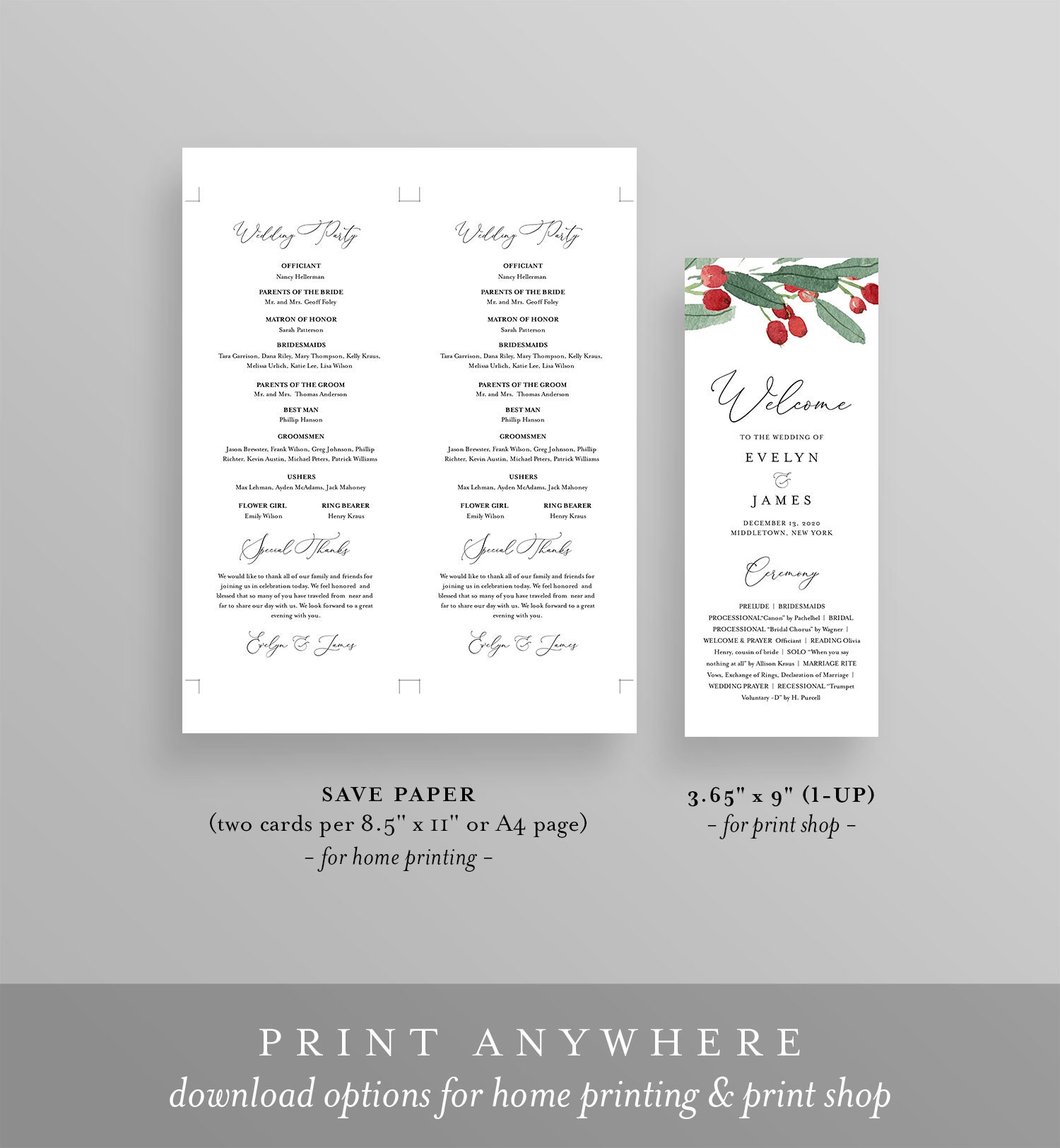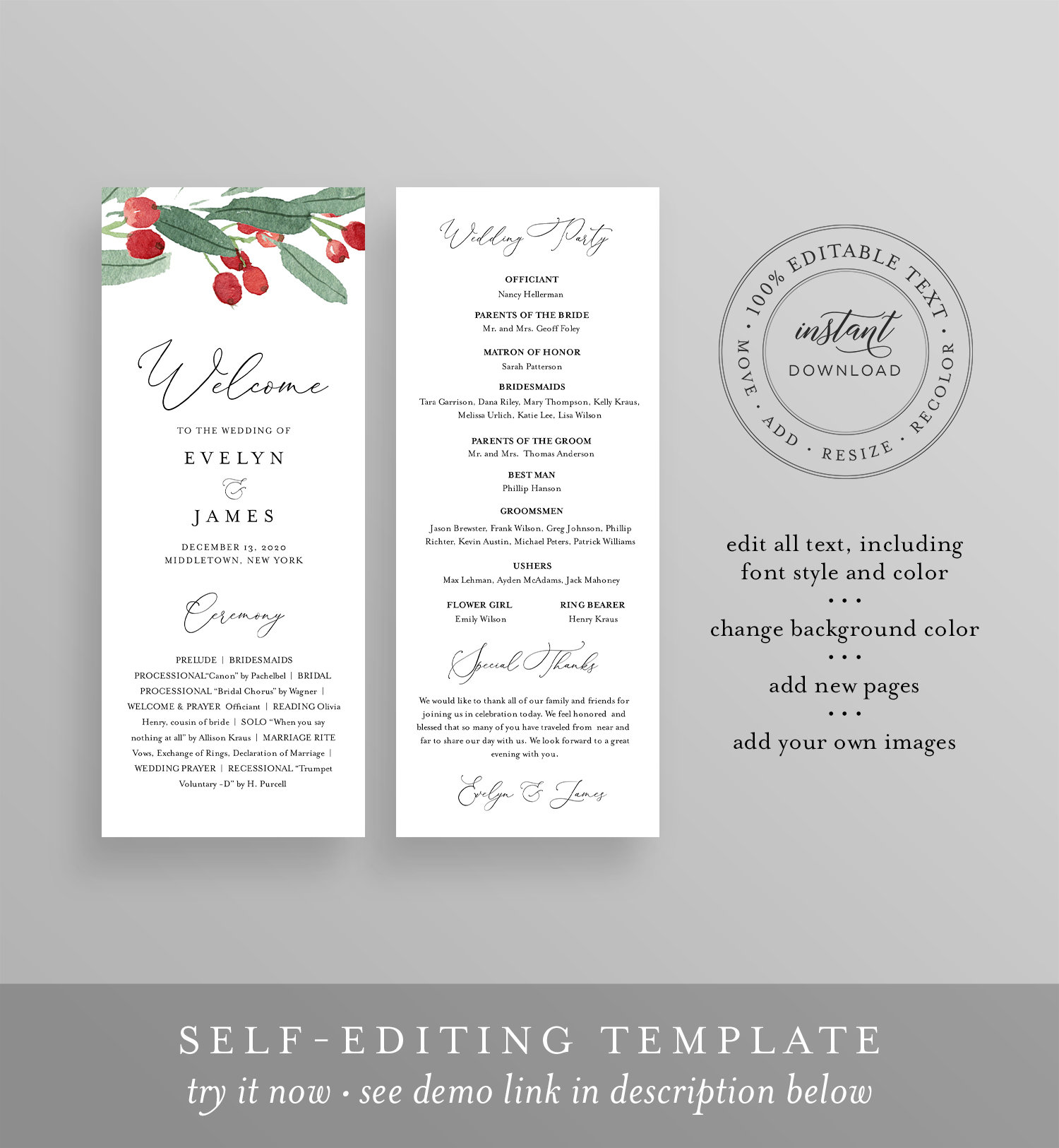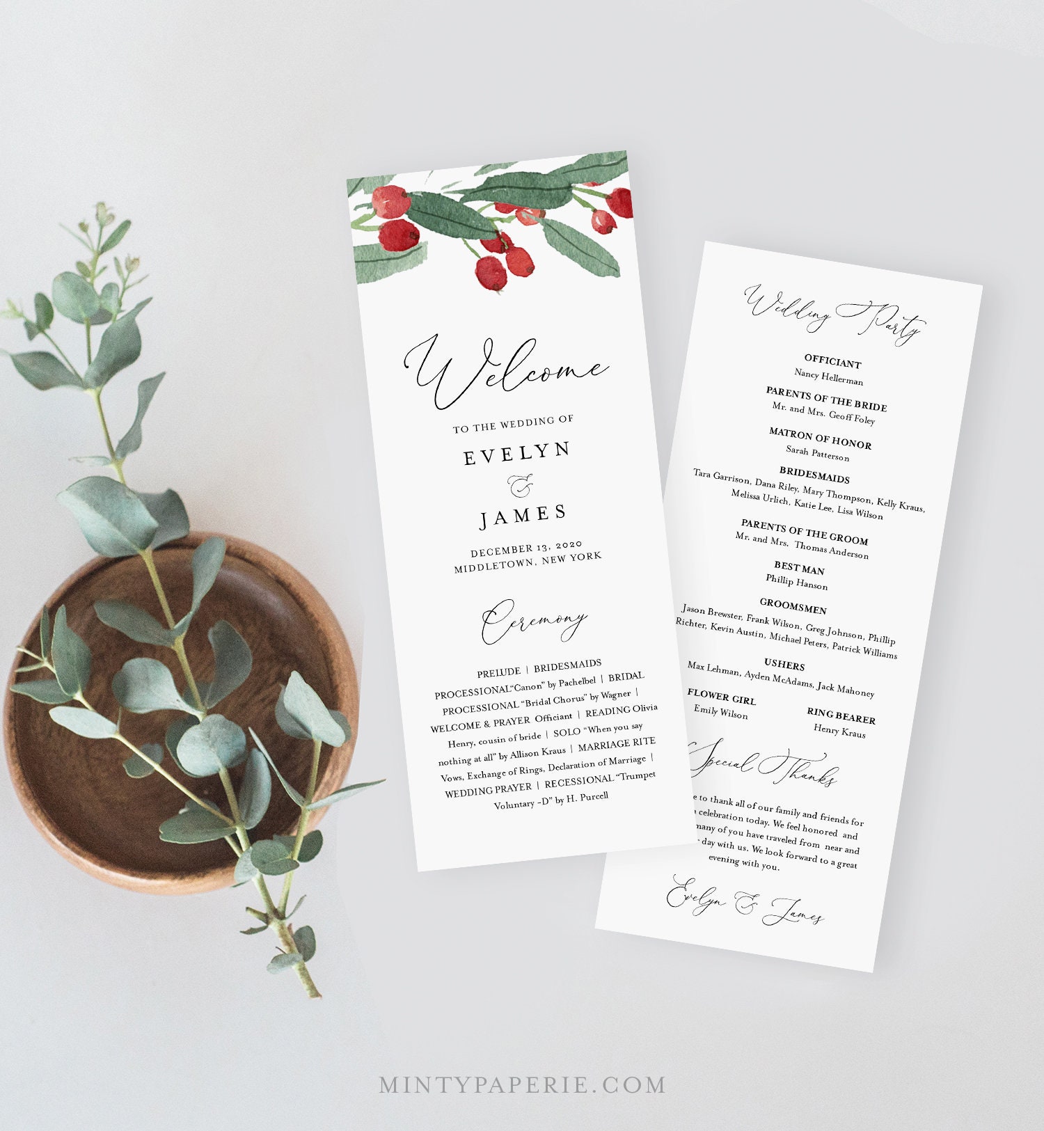 This WEDDING PROGRAM template features hand-painted winter holly and greenery. It's an INSTANT DOWNLOAD - Access your template within minutes of purchase and edit in TEMPLETT - A fully customizable template editor that allows you to personalize your printable directly in your web browser. No software to install or fonts to download.