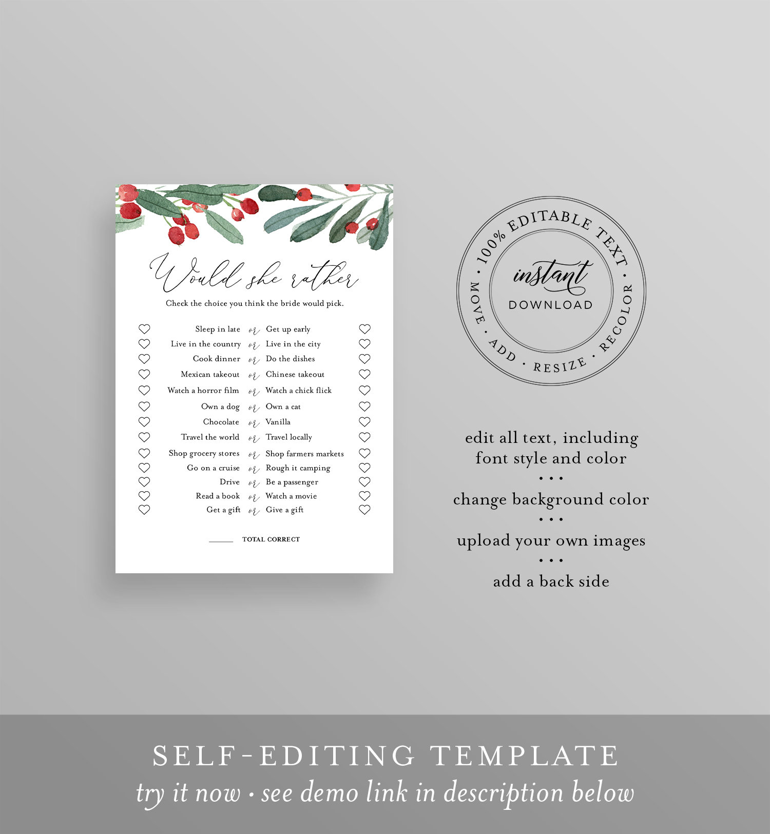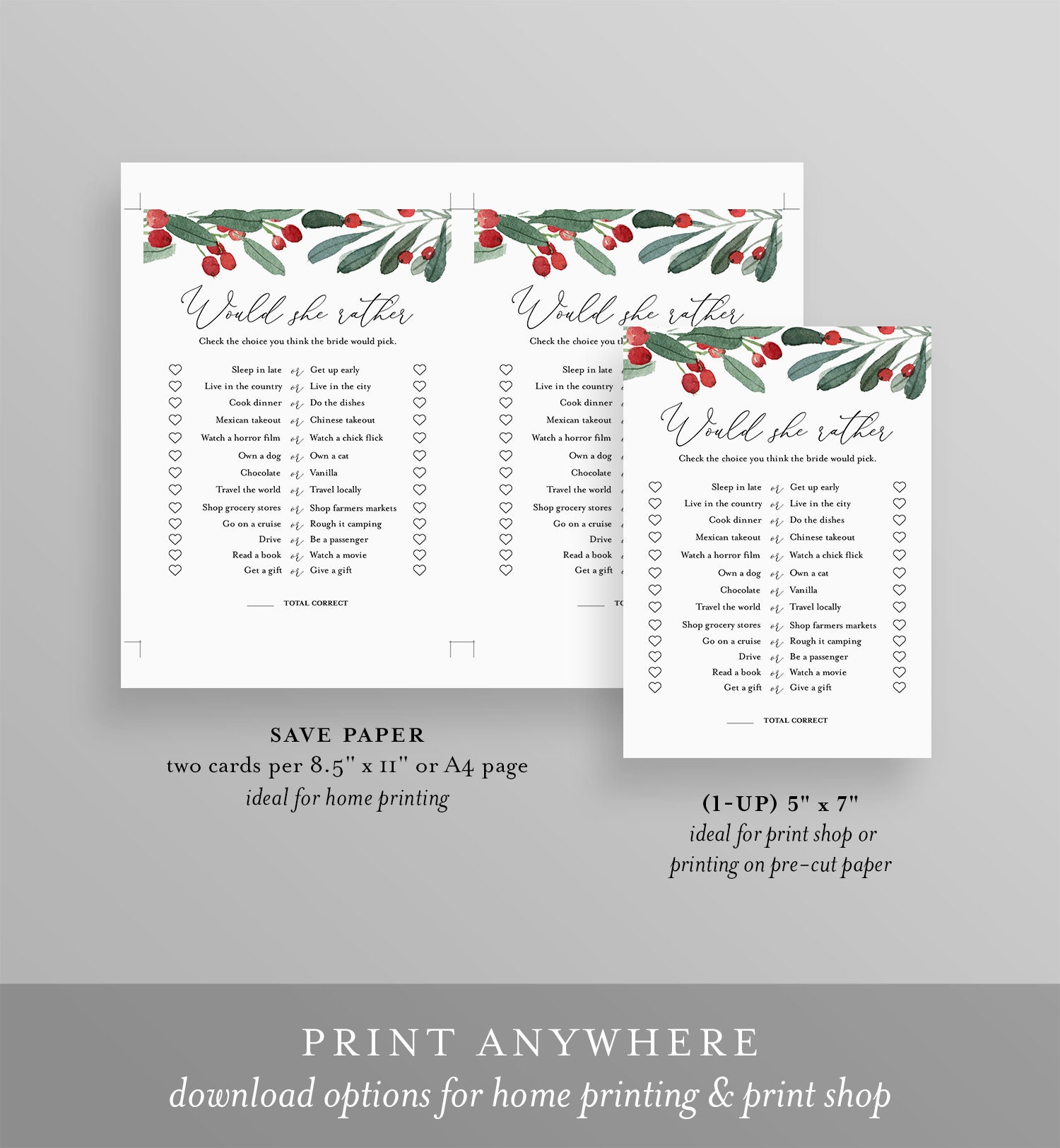 This WOULD SHE RATHER Bridal Shower Game features hand-painted winter holly and greenery. It's an INSTANT DOWNLOAD - Access your template within minutes of purchase and edit in TEMPLETT - A fully customizable template editor that allows you to personalize your printable directly in your web browser. No software to install or fonts to download.