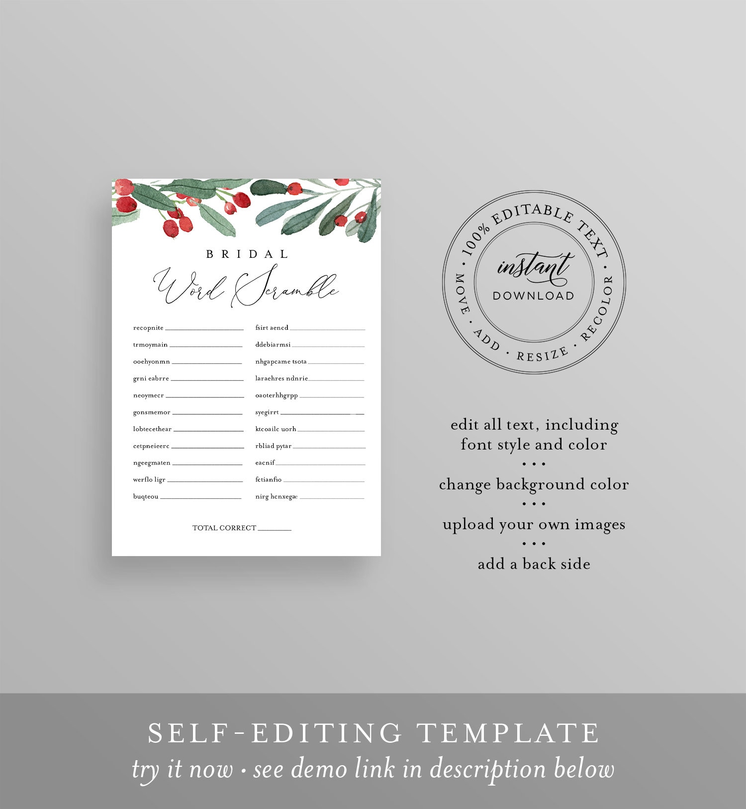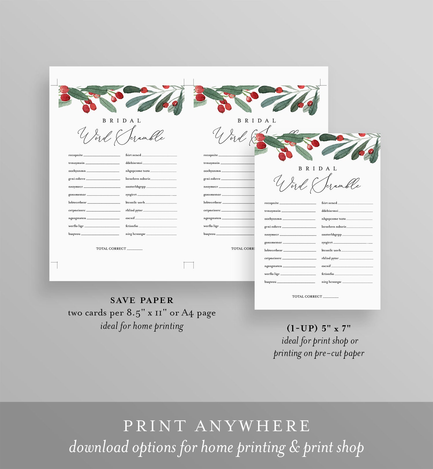 This WORD SCRAMBLE Bridal Shower Game features hand-painted winter holly and greenery. It's an INSTANT DOWNLOAD - Access your template within minutes of purchase and edit in TEMPLETT - A fully customizable template editor that allows you to personalize your printable directly in your web browser. No software to install or fonts to download.