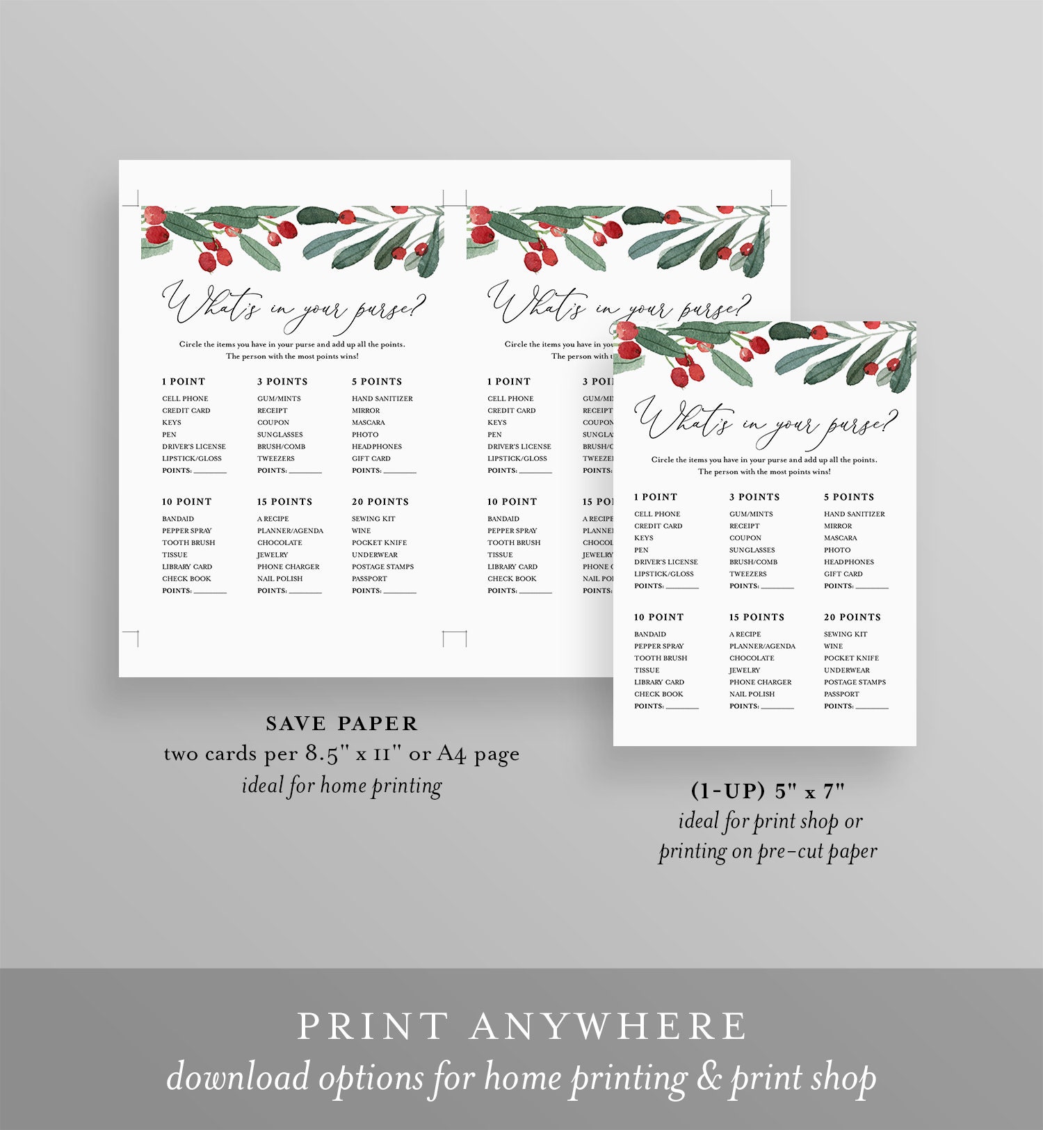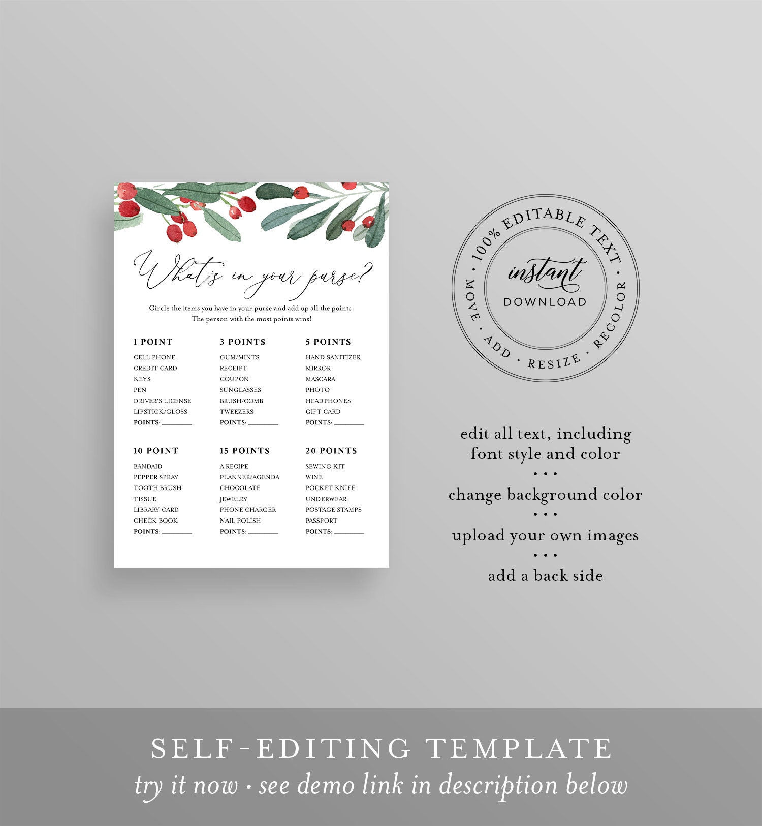 This WHAT'S IN YOUR PURSE Bridal Shower Game features hand-painted winter holly and greenery. It's an INSTANT DOWNLOAD - Access your template within minutes of purchase and edit in TEMPLETT - A fully customizable template editor that allows you to personalize your printable directly in your web browser. No software to install or fonts to download.