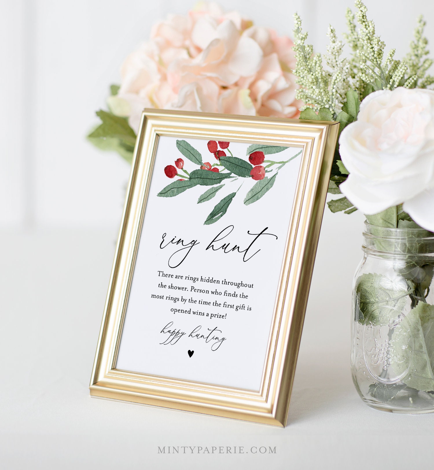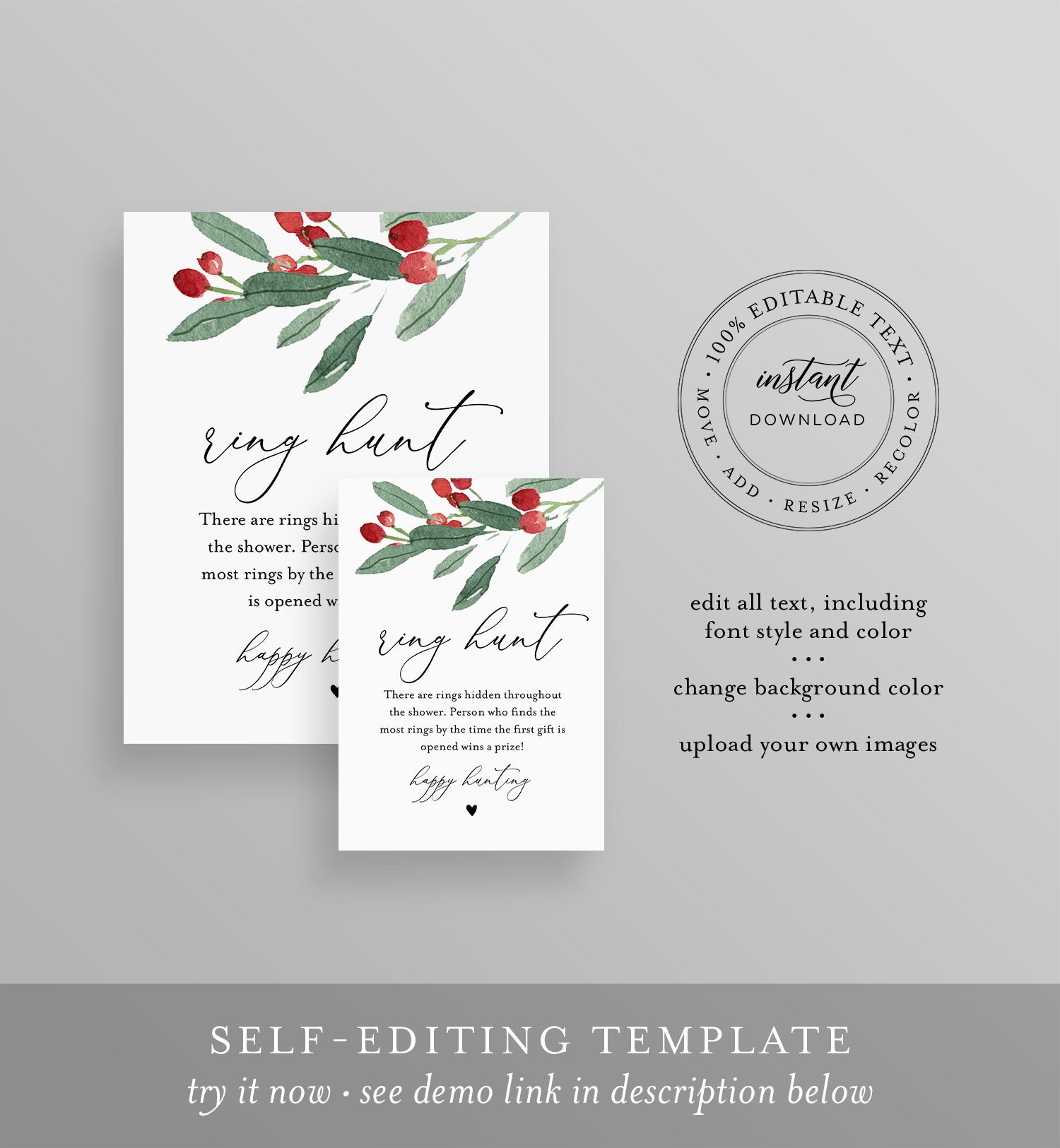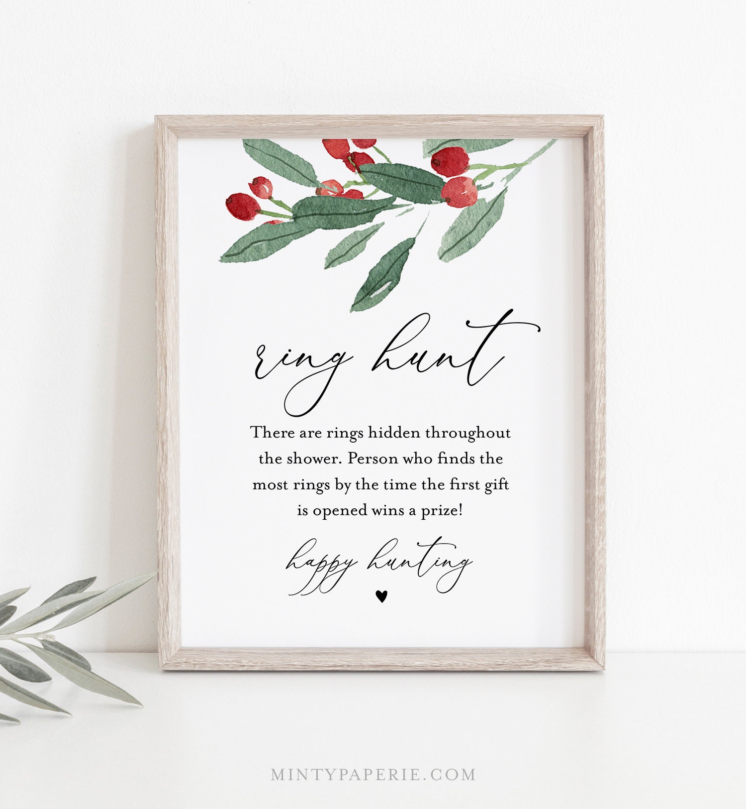 This RING HUNT Bridal Shower Game features hand-painted winter holly and greenery. It's an INSTANT DOWNLOAD - Access your template within minutes of purchase and edit in TEMPLETT - A fully customizable template editor that allows you to personalize your printable directly in your web browser. No software to install or fonts to download.