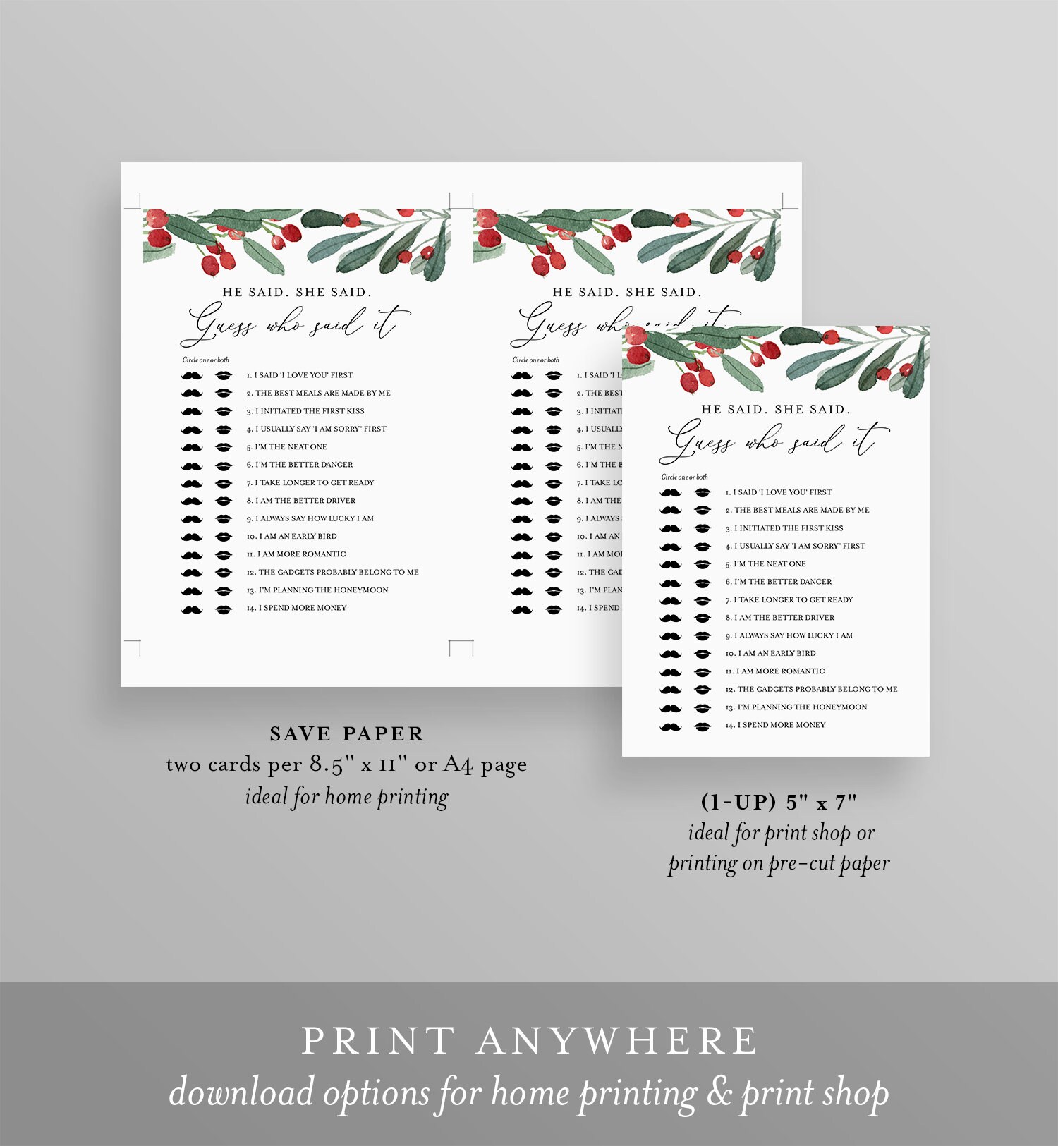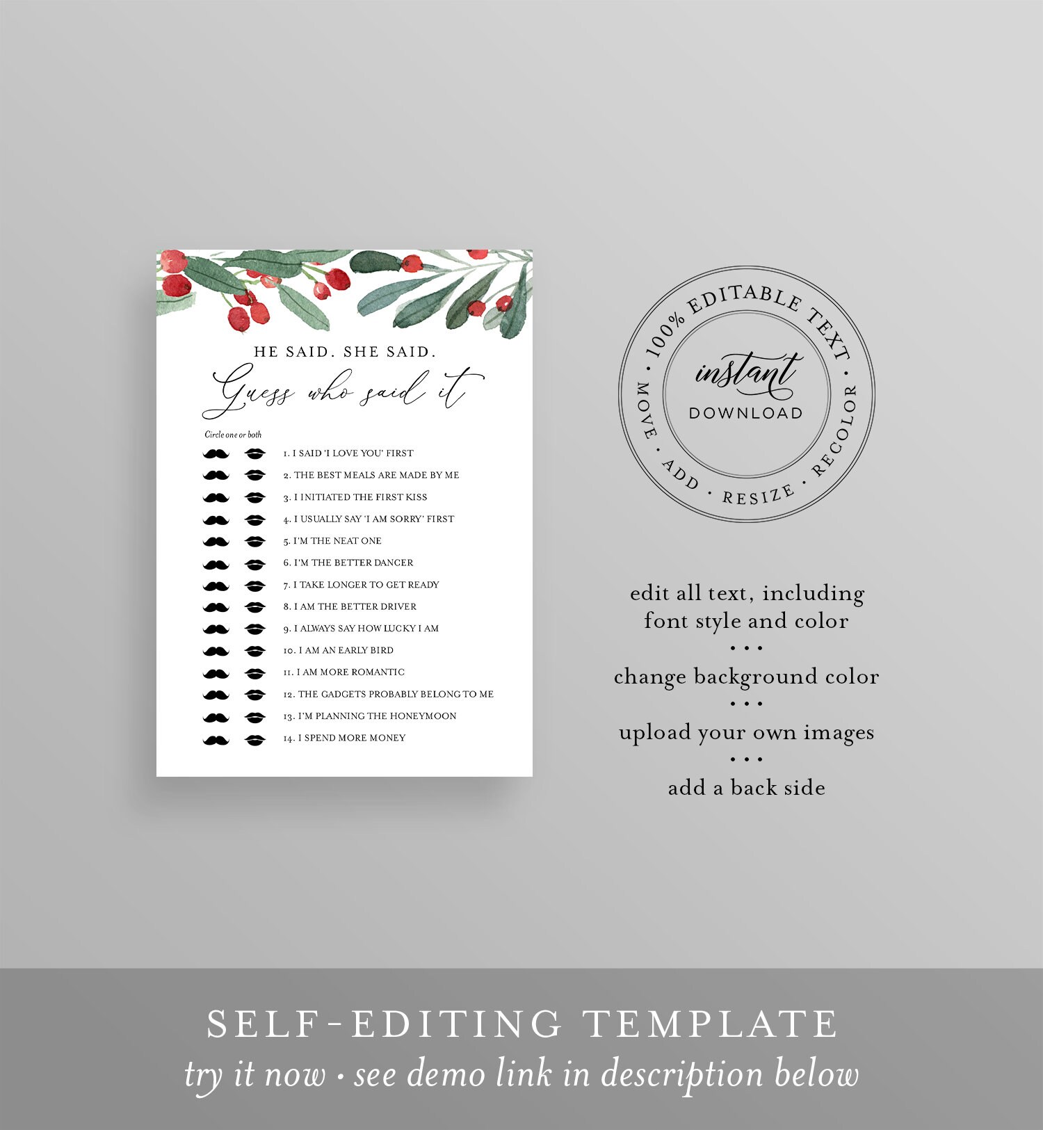 This HE SAID. SHE SAID. Bridal Shower Game features hand-painted winter holly and greenery. It's an INSTANT DOWNLOAD - Access your template within minutes of purchase and edit in TEMPLETT - A fully customizable template editor that allows you to personalize your printable directly in your web browser. No software to install or fonts to download.