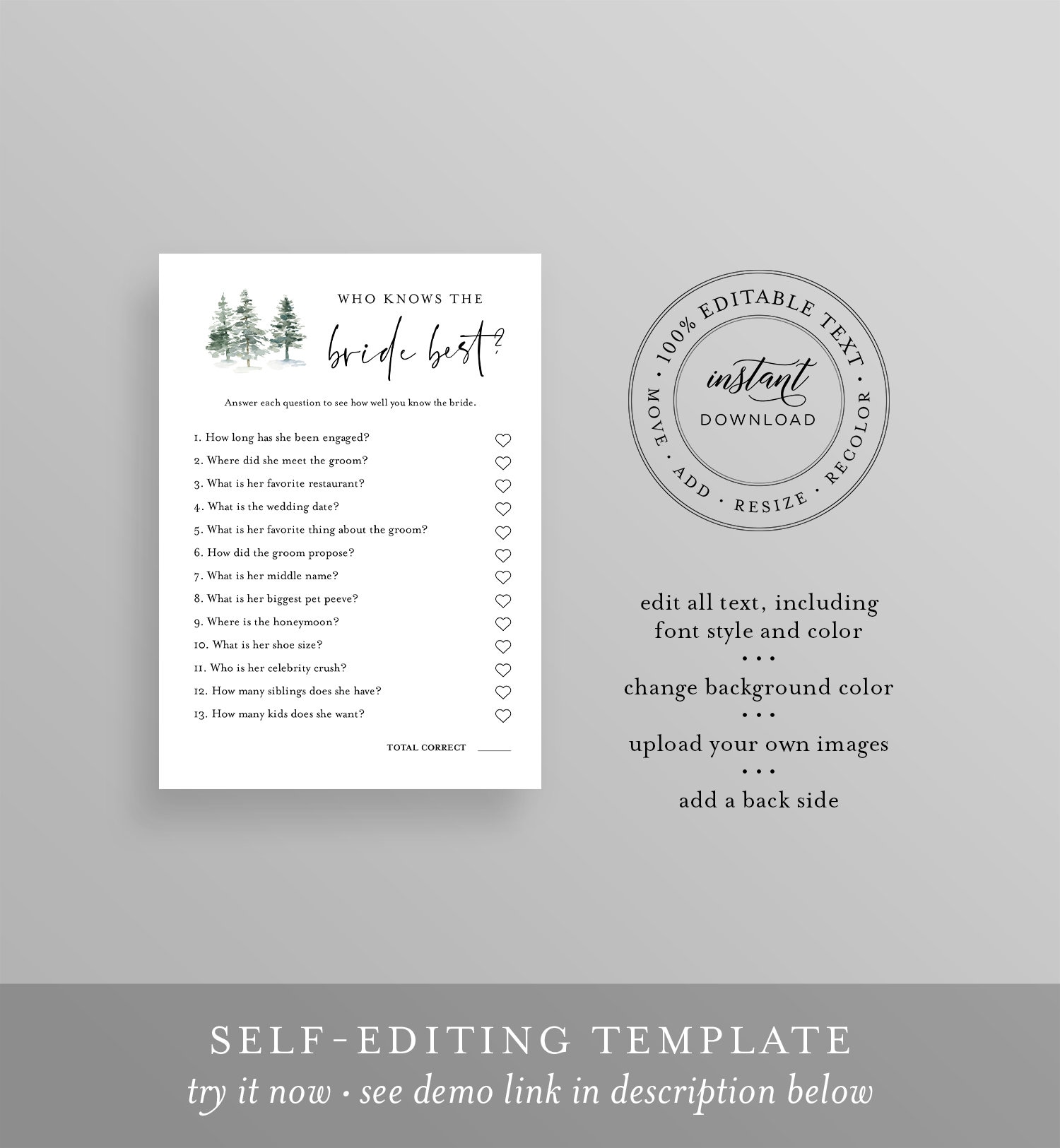 This WHO KNOWS THE BRIDE BEST Bridal Shower Game is an INSTANT DOWNLOAD. Access your template within minutes of purchase and edit in TEMPLETT - A fully customizable template editor that allows you to personalize your printable directly in your web browser. No software to install or fonts to download.