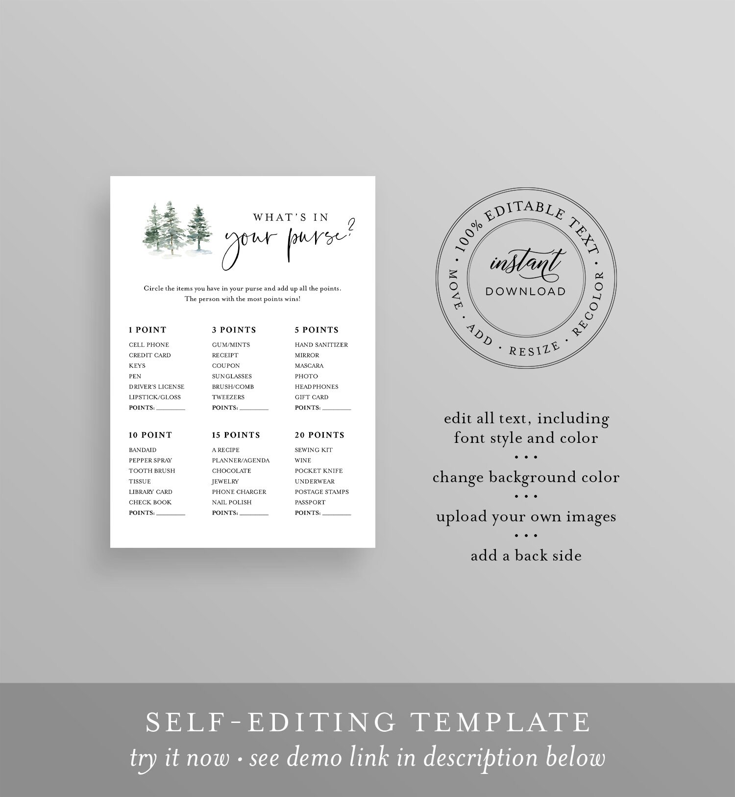 This WHAT'S IN YOUR PURSE Bridal Shower Game is an INSTANT DOWNLOAD. Access your template within minutes of purchase and edit in TEMPLETT - A fully customizable template editor that allows you to personalize your printable directly in your web browser. No software to install or fonts to download.