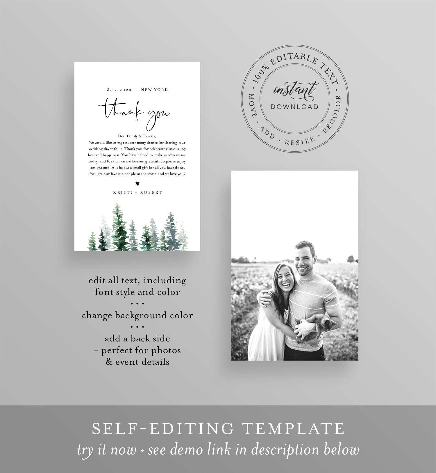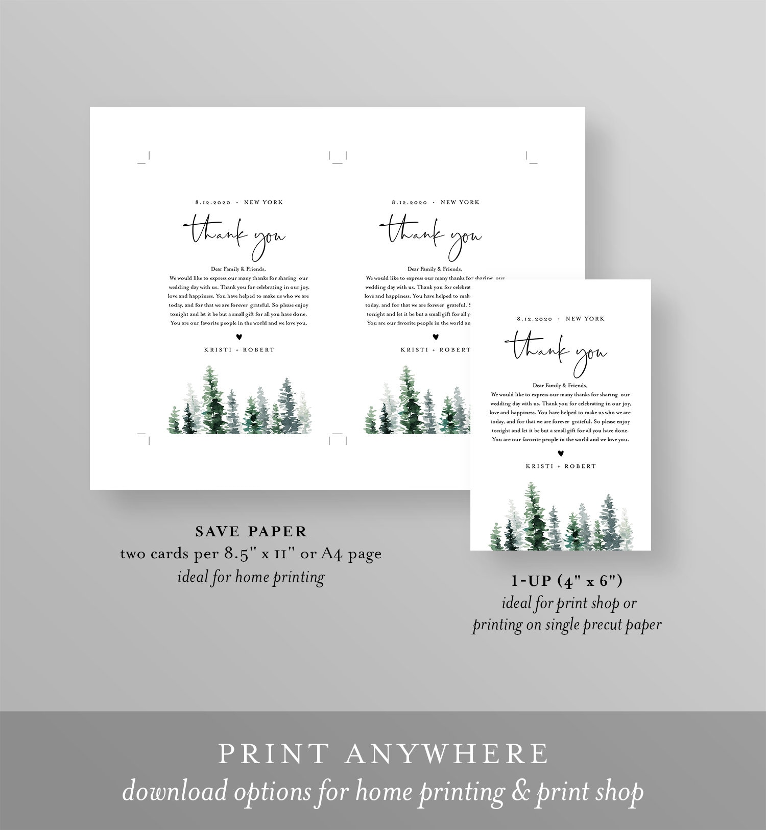 This WEDDING THANK YOU NOTE template features winter rustic pine. It's an INSTANT DOWNLOAD! Access your template within minutes of purchase and edit using TEMPLETT - A fully customizable template editor that allows you to personalize your printable directly in your web browser. No software to install or fonts to download.