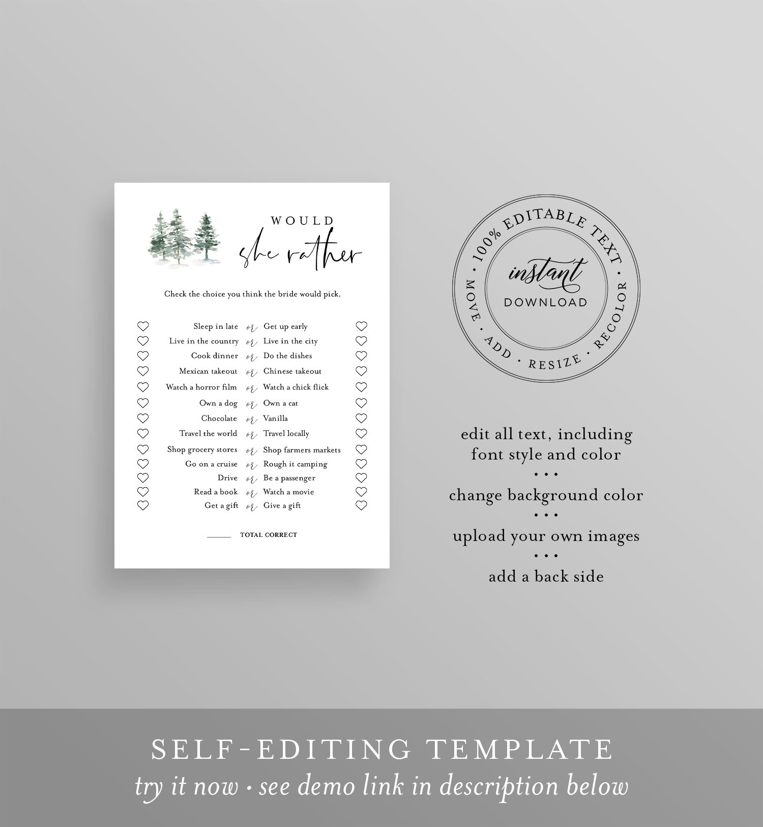 This WOULD SHE RATHER Bridal Shower Game is an INSTANT DOWNLOAD. Access your template within minutes of purchase and edit in TEMPLETT - A fully customizable template editor that allows you to personalize your printable directly in your web browser. No software to install or fonts to download.