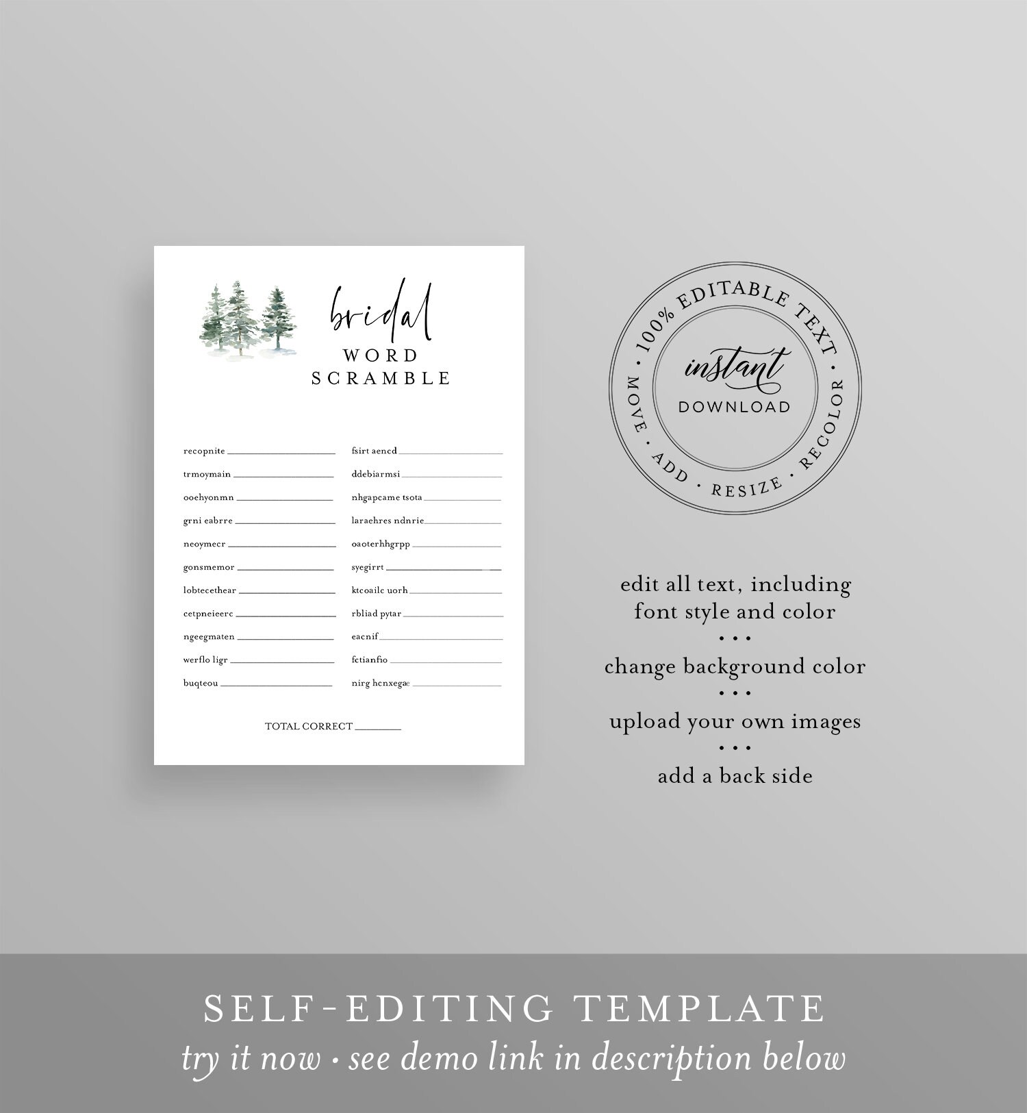 This WORD SCRAMBLE Bridal Shower Game is an INSTANT DOWNLOAD. Access your template within minutes of purchase and edit in TEMPLETT - A fully customizable template editor that allows you to personalize your printable directly in your web browser. No software to install or fonts to download.