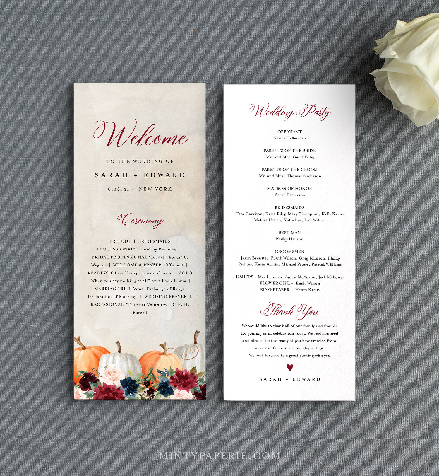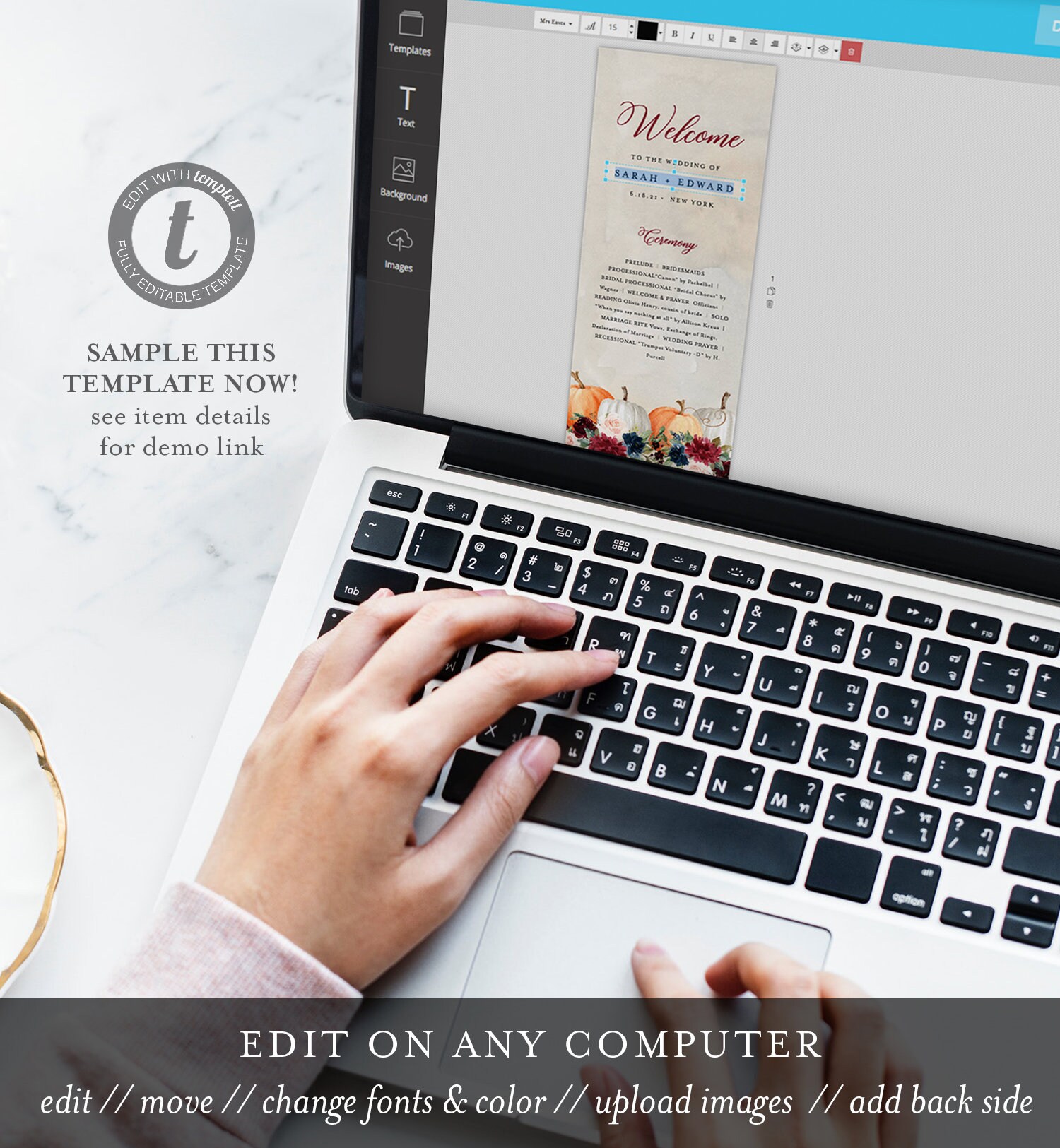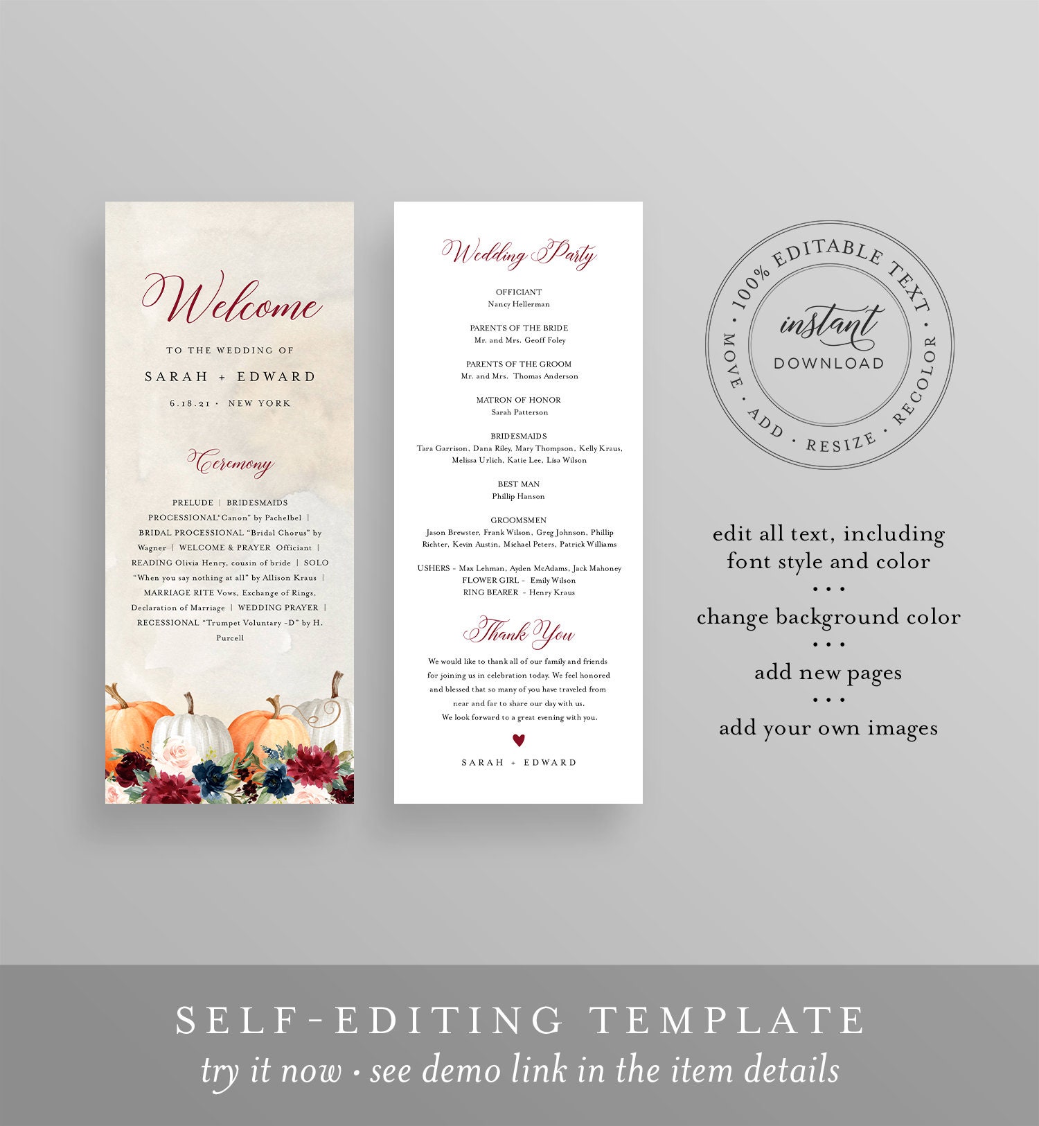 This pumpkin wedding program template is an instant download. Access your template within minutes of purchase and edit in Templett - A fully customizable template editor that allows you to personalize your printable directly in your web browser. No software to install or fonts to download.