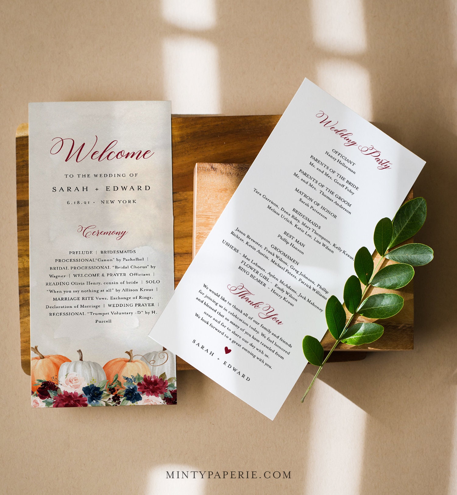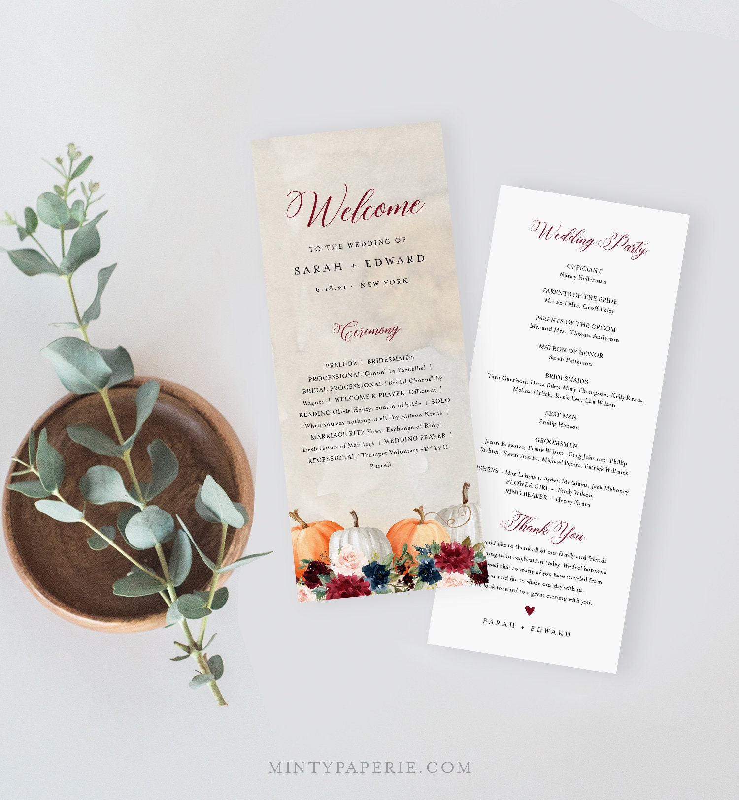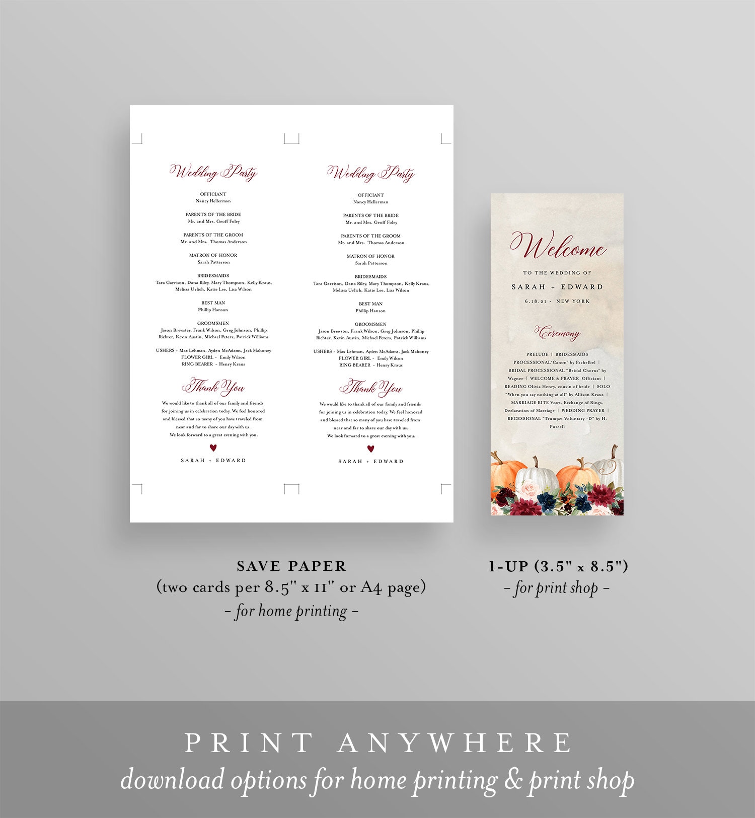 This pumpkin wedding program template is an instant download. Access your template within minutes of purchase and edit in Templett - A fully customizable template editor that allows you to personalize your printable directly in your web browser. No software to install or fonts to download.