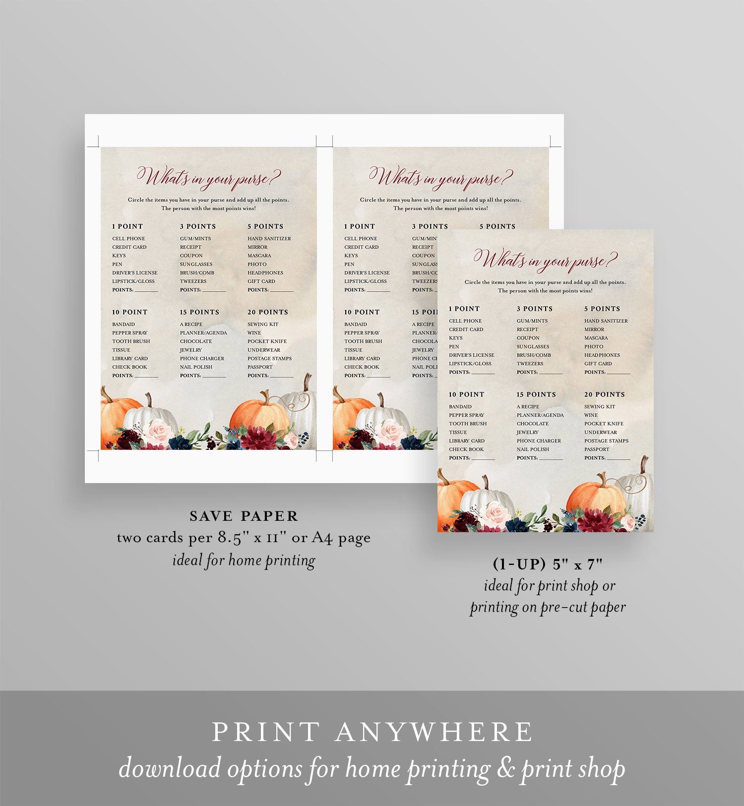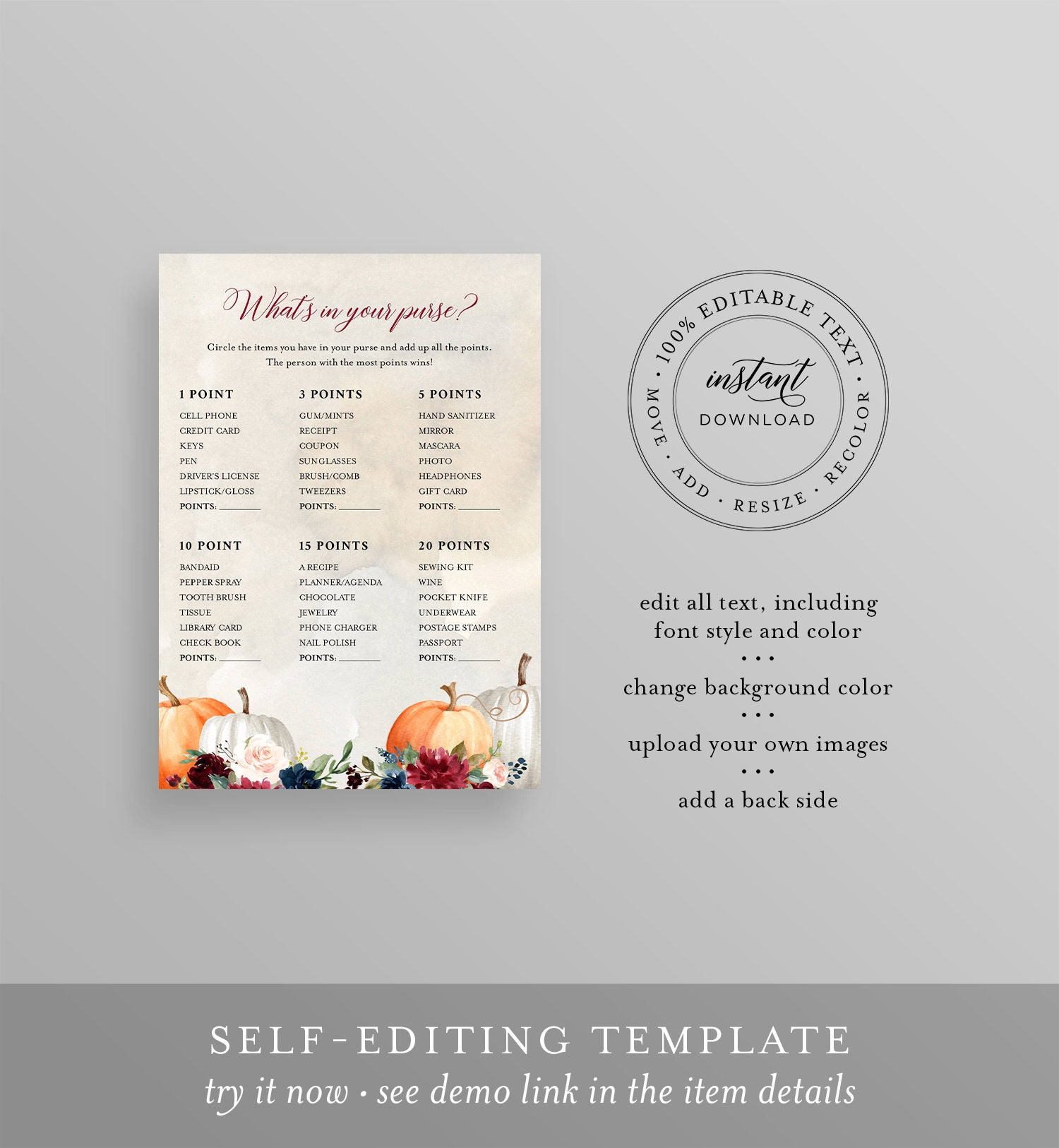 This "what's in your purse" bridal sower game is an instant download. Access your template within minutes of purchase and edit in Templett - A fully customizable template editor that allows you to personalize your printable directly in your web browser. No software to install or fonts to download.