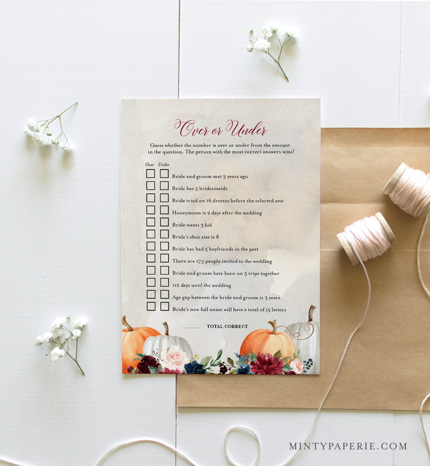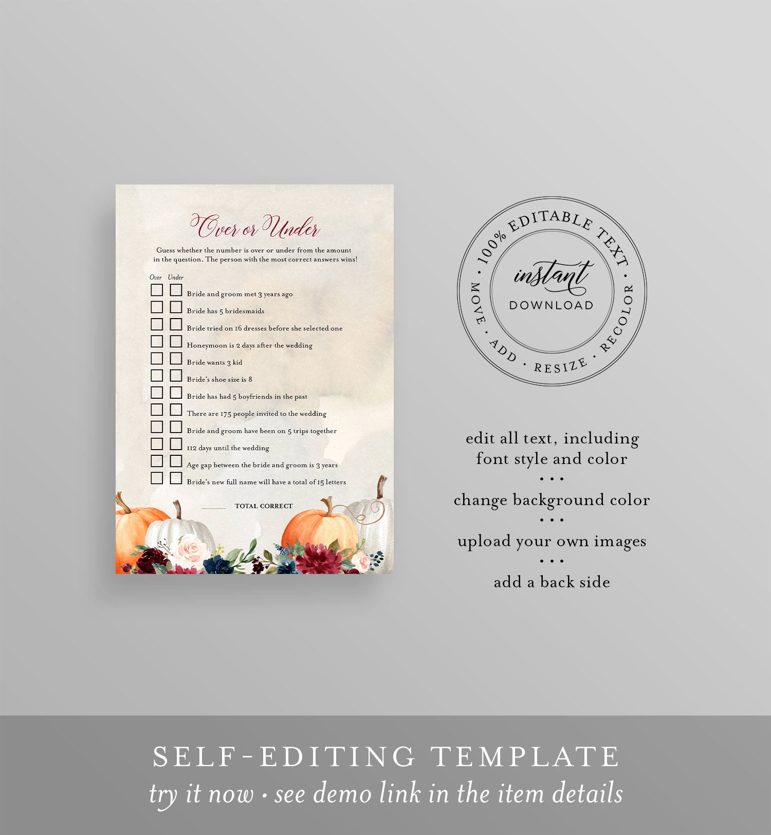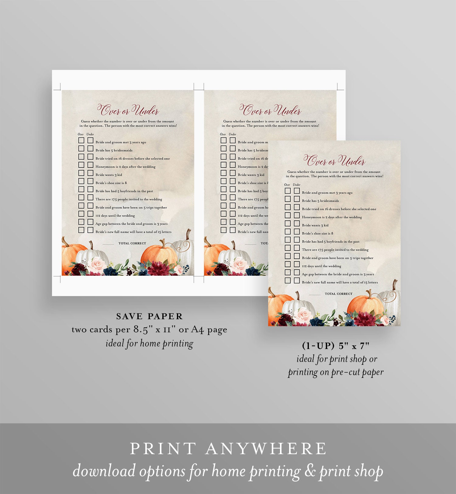 This over or under bridal shower game is an instant download. Access your template within minutes of purchase and edit in TEMPLETT - A fully customizable template editor that allows you to personalize your printable directly in your web browser. No software to install or fonts to download.