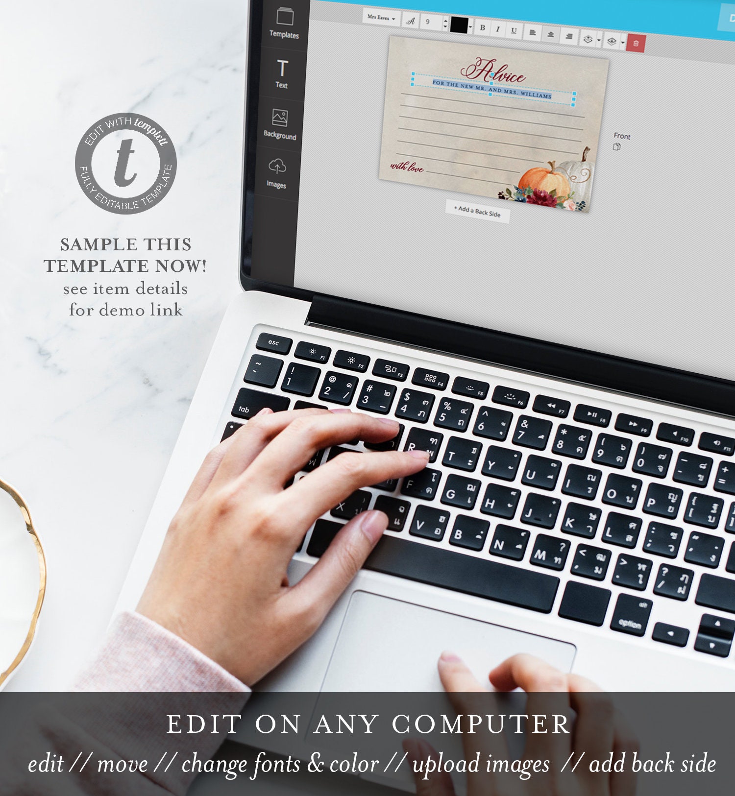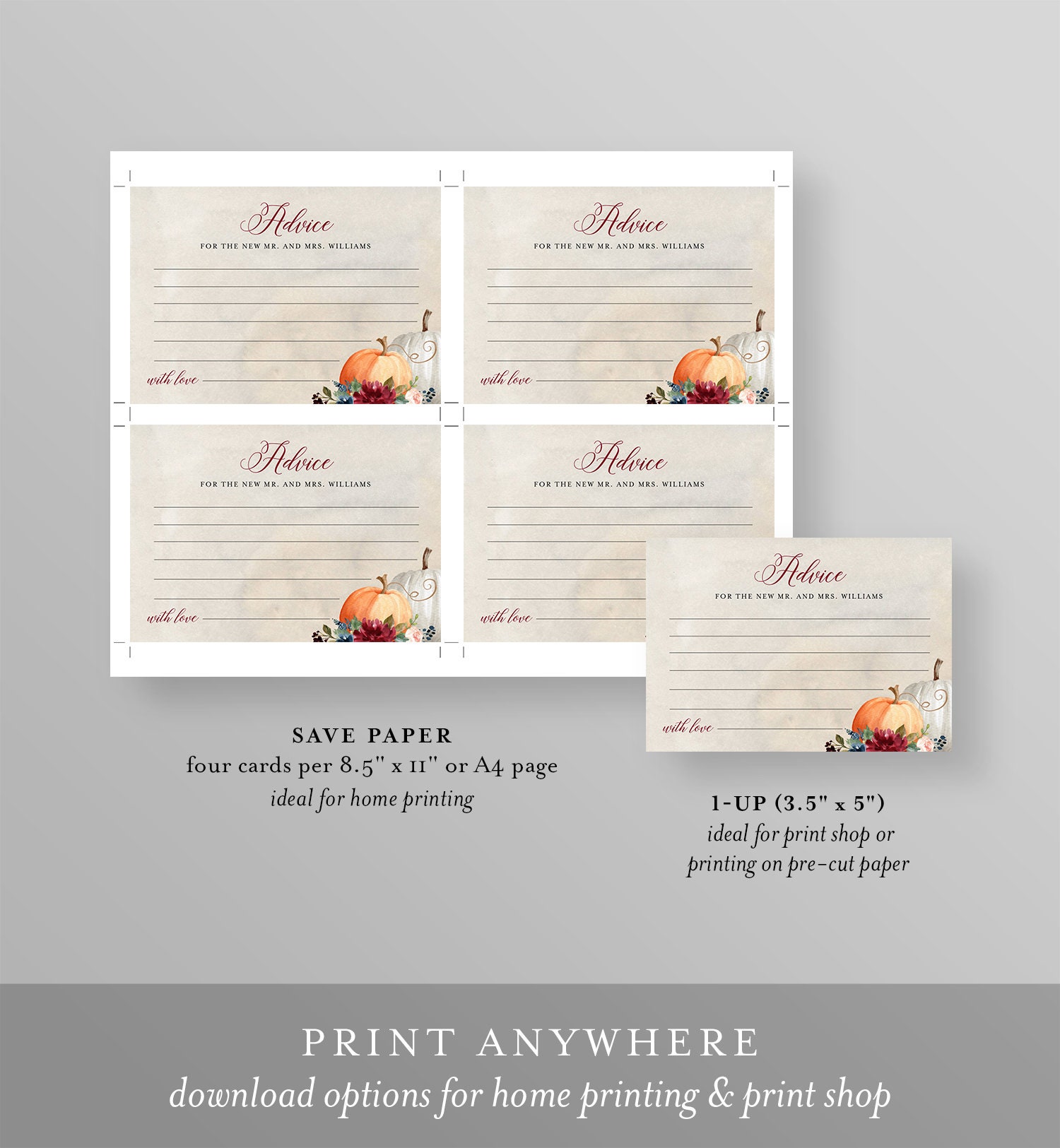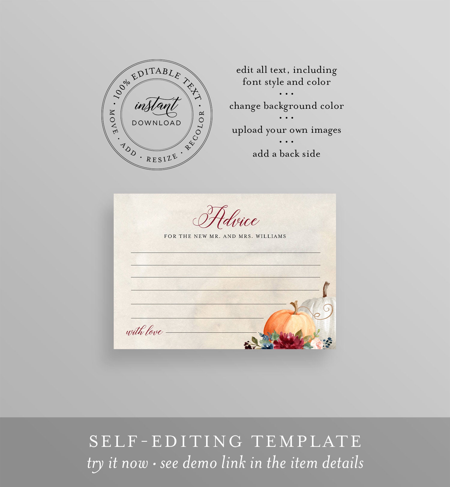 This pumpkin advice card is an instant download. Access your template within minutes of purchase and edit in TEMPLETT - A fully customizable template editor that allows you to personalize your printable directly in your web browser. No software to install or fonts to download.