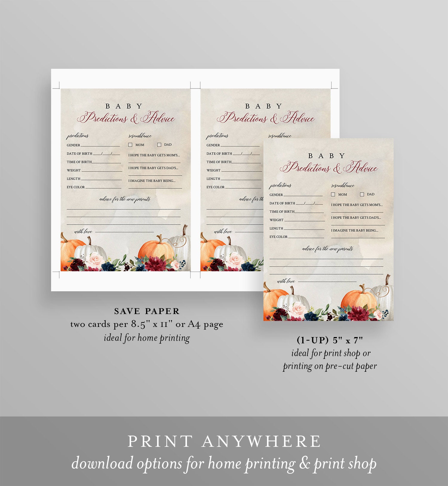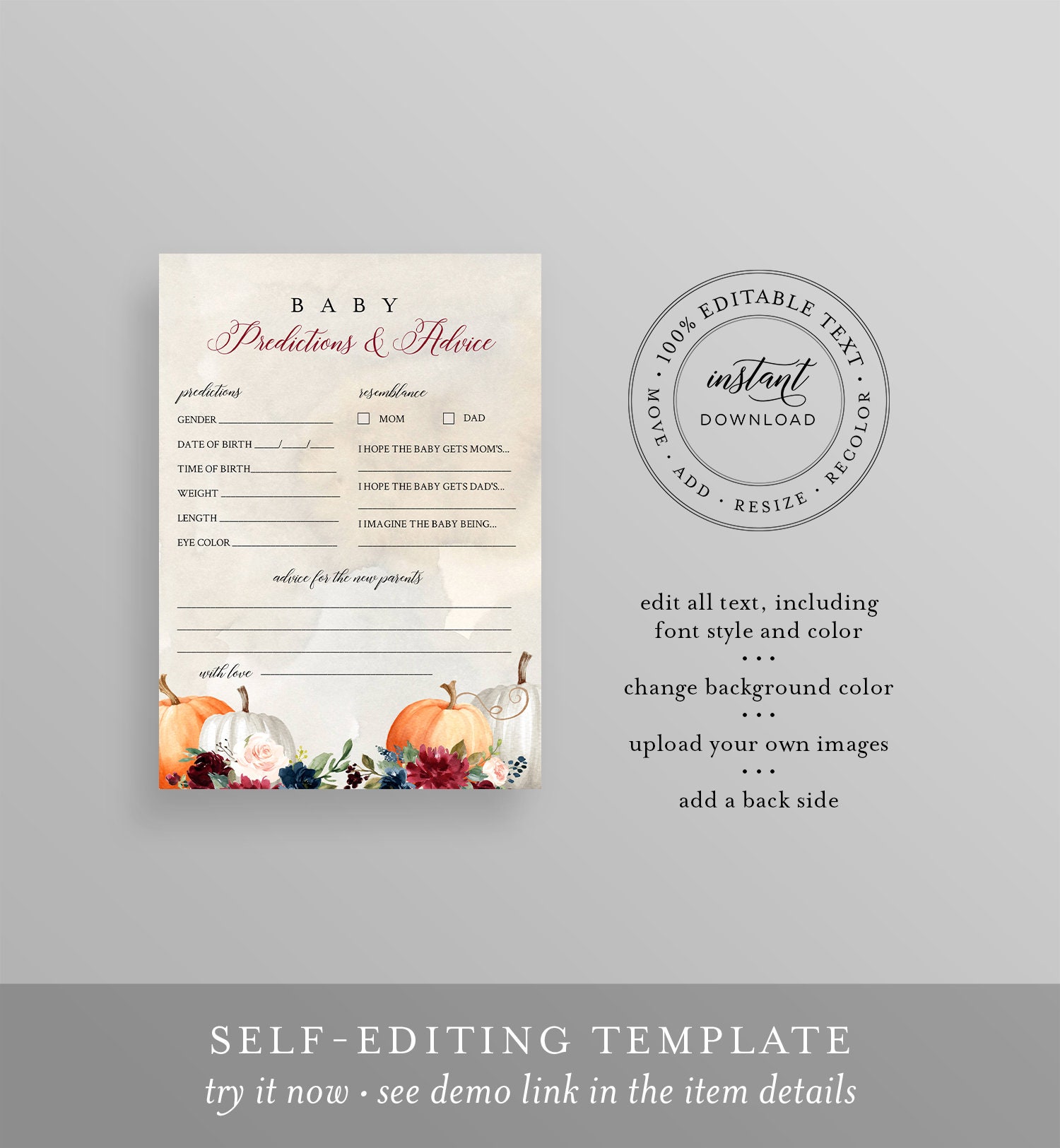 This baby predictions and advice is an instant download. Access your template within minutes of purchase and edit in Templett - A fully customizable template editor that allows you to personalize your printable directly in your web browser. No software to install or fonts to download.