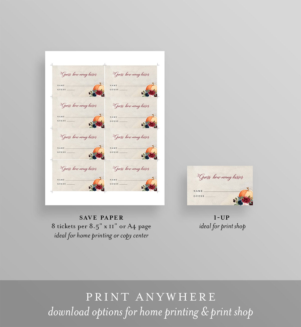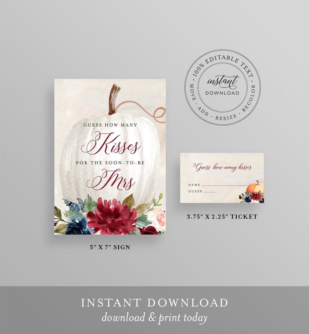 This guess how many kisses bridal shower game is an instant download. Access your template within minutes of purchase and edit in Templett - A fully customizable template editor that allows you to personalize your printable directly in your web browser. No software to install or fonts to download.