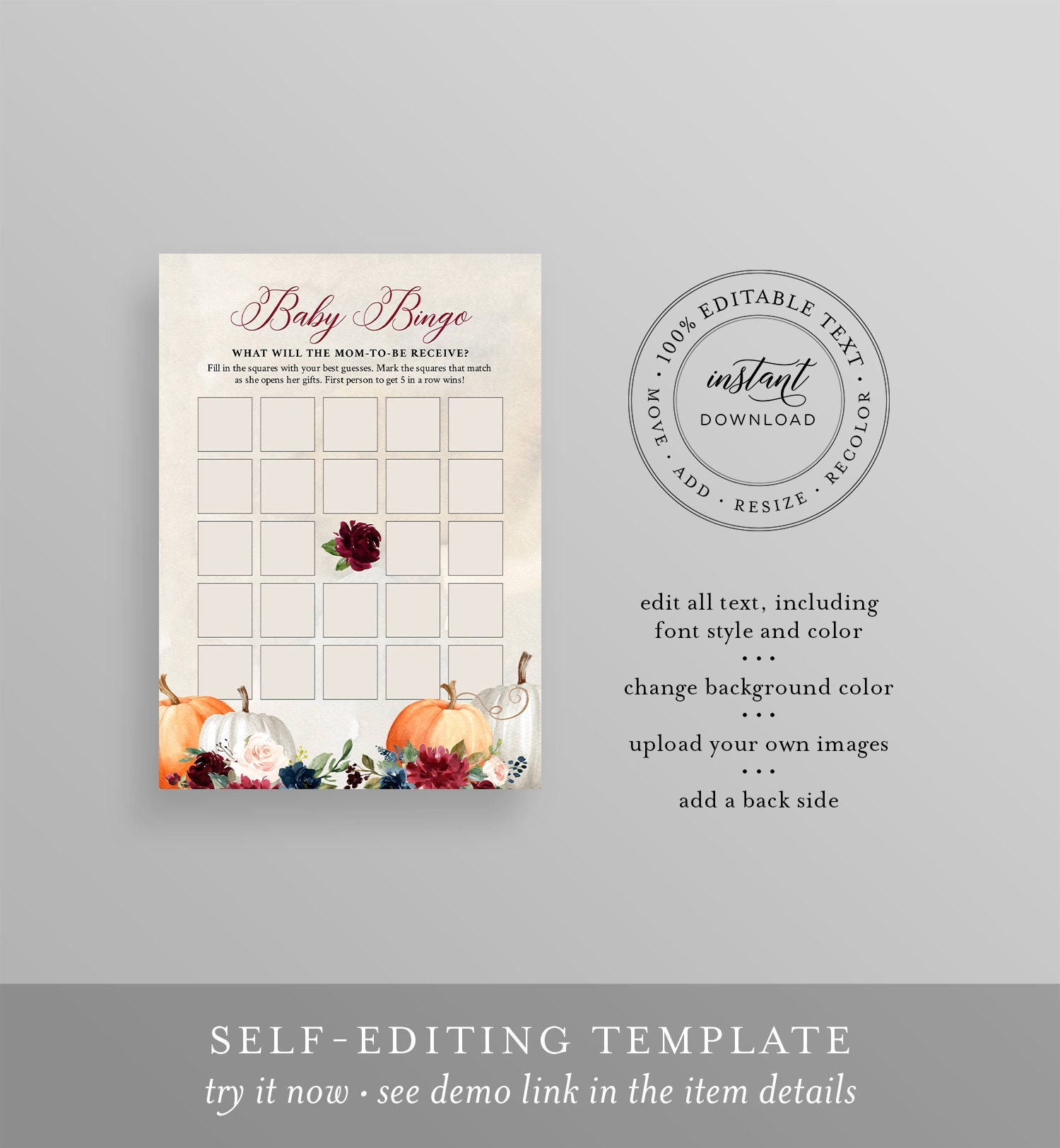 This baby bingo game template is an instant download. Access your template within minutes of purchase and edit using Templett - A fully customizable template editor that allows you to personalize your printable directly in your web browser. No software to install or fonts to download.
