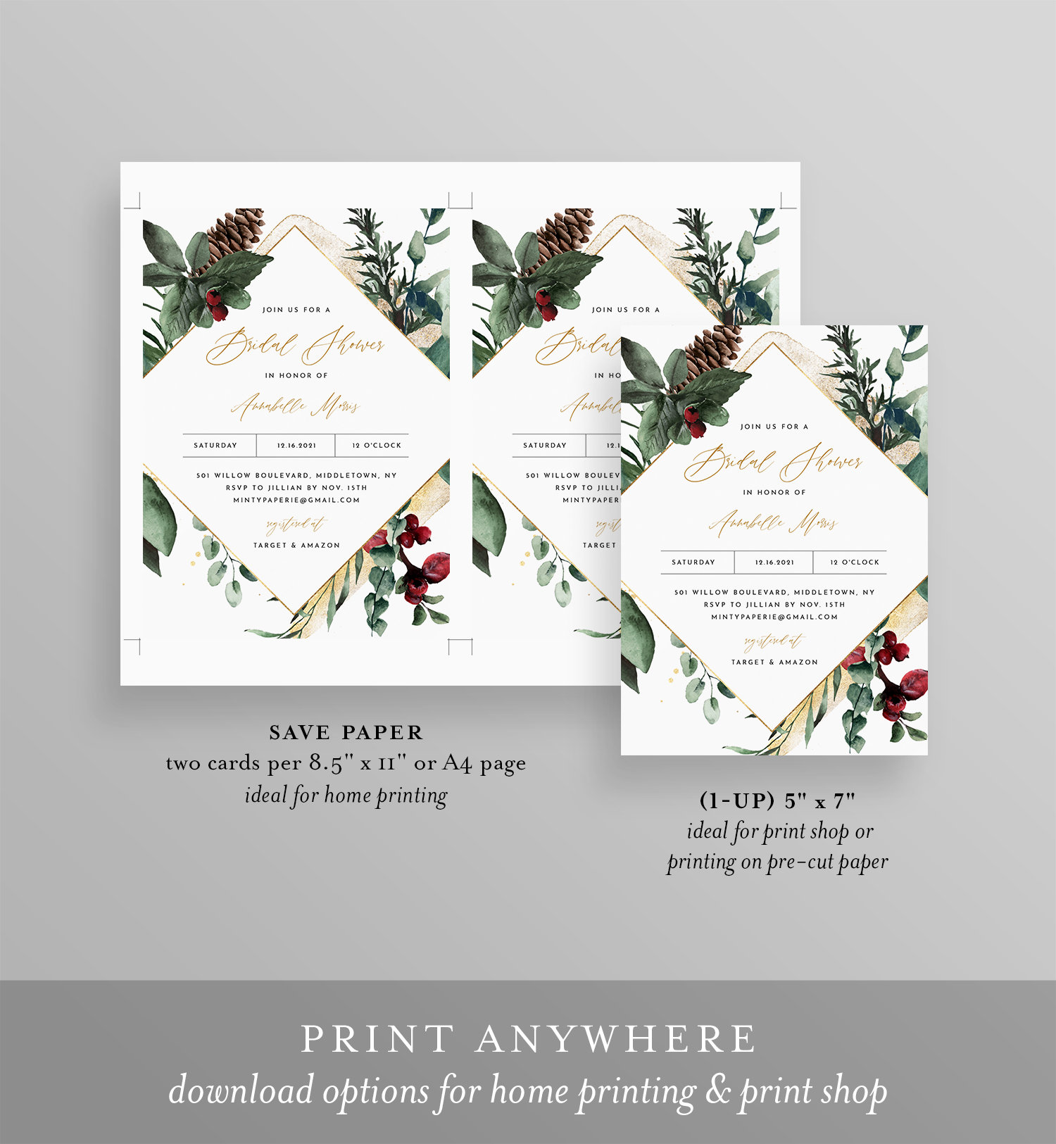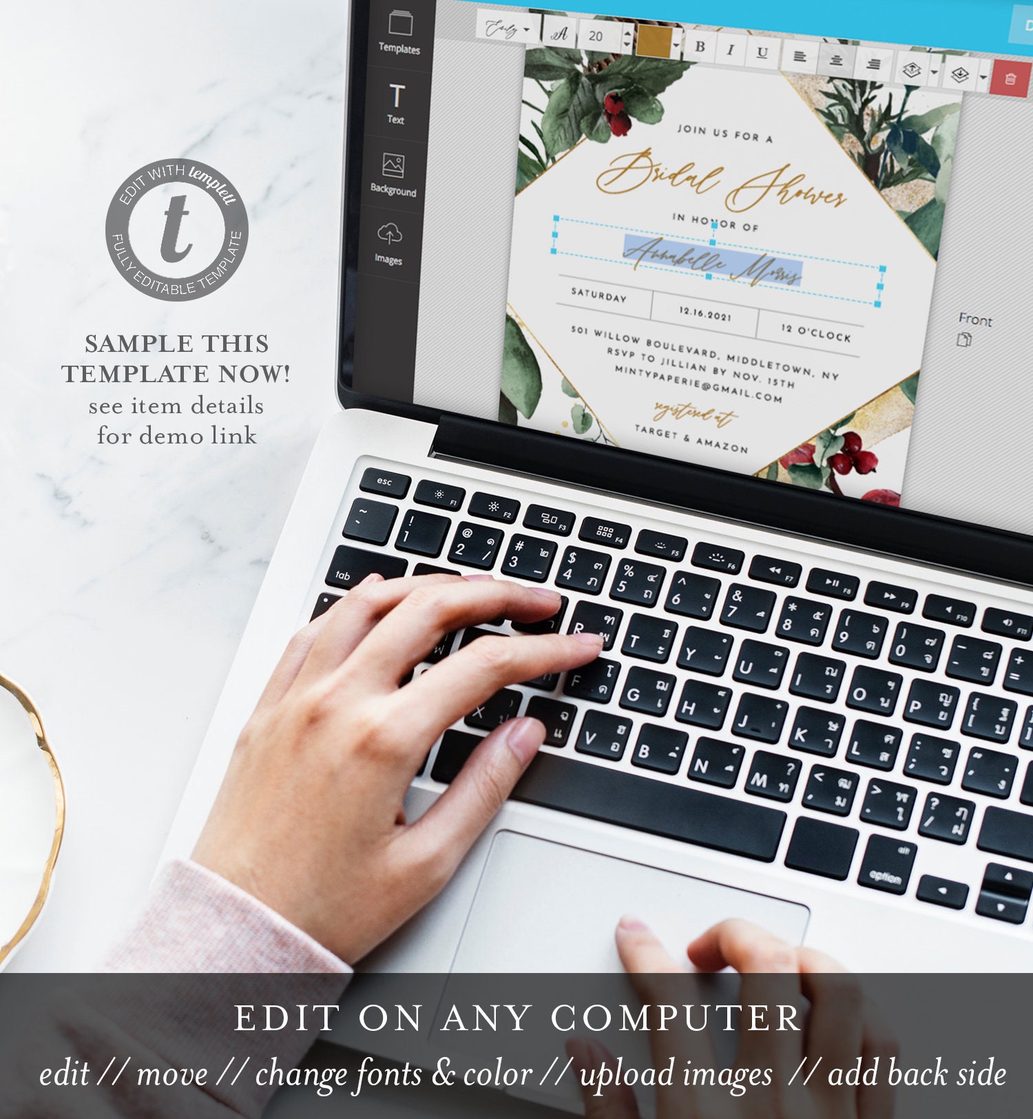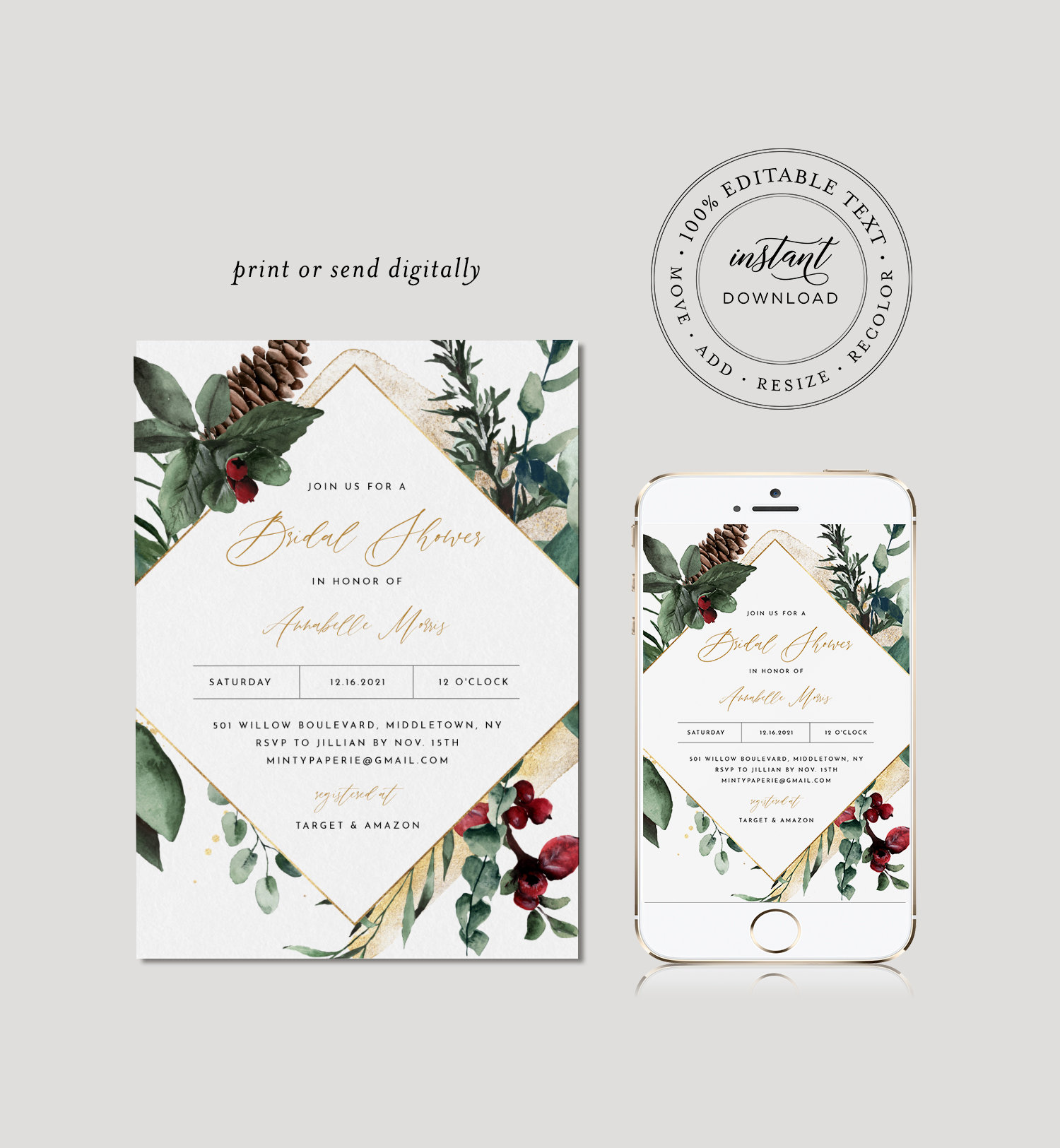 This winter bridal shower invitation template is an instant download. Access your template within minutes of purchase and edit using Templett - A fully customizable template editor that allows you to personalize your printable directly in your web browser. No software to install or fonts to download.