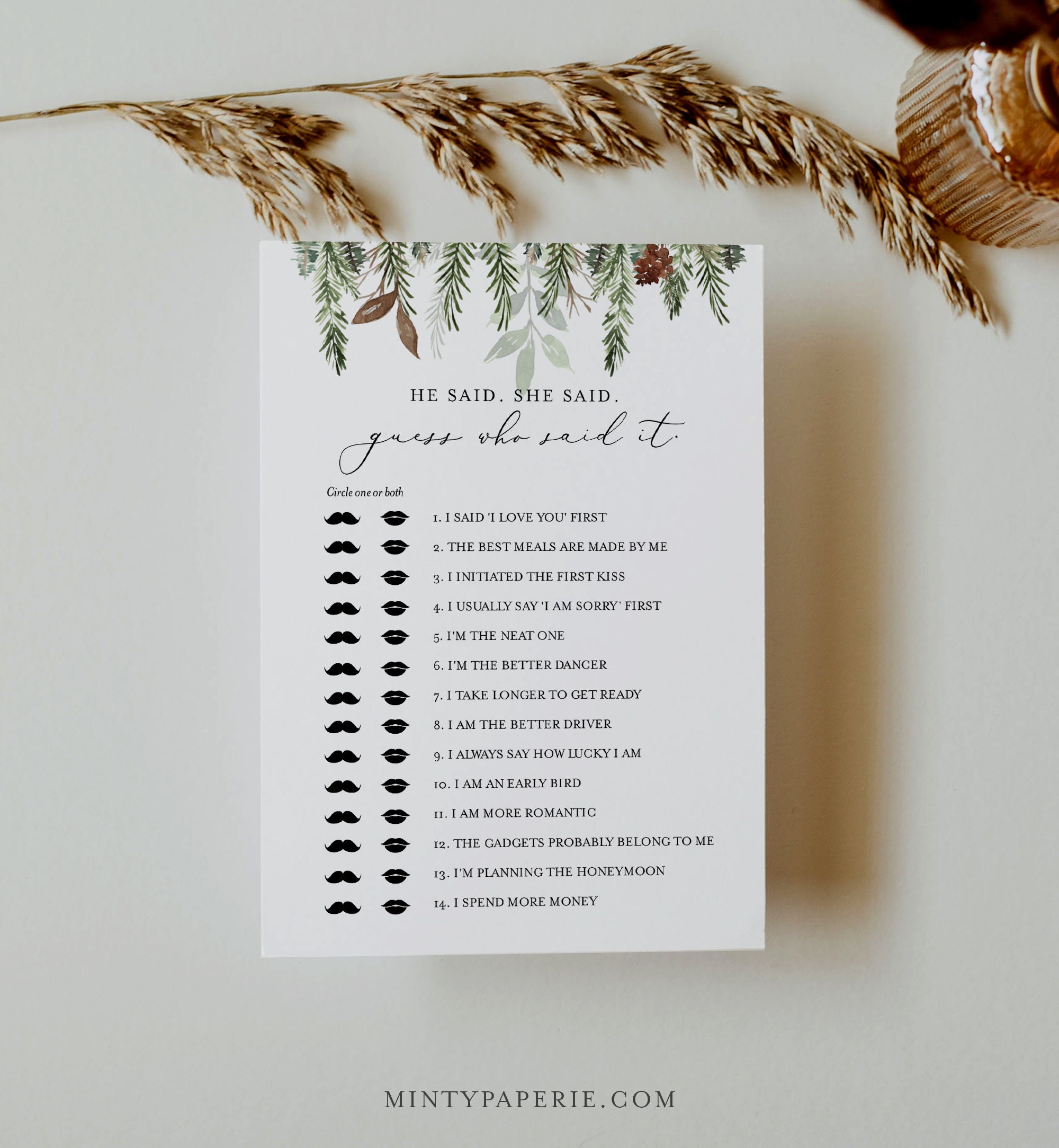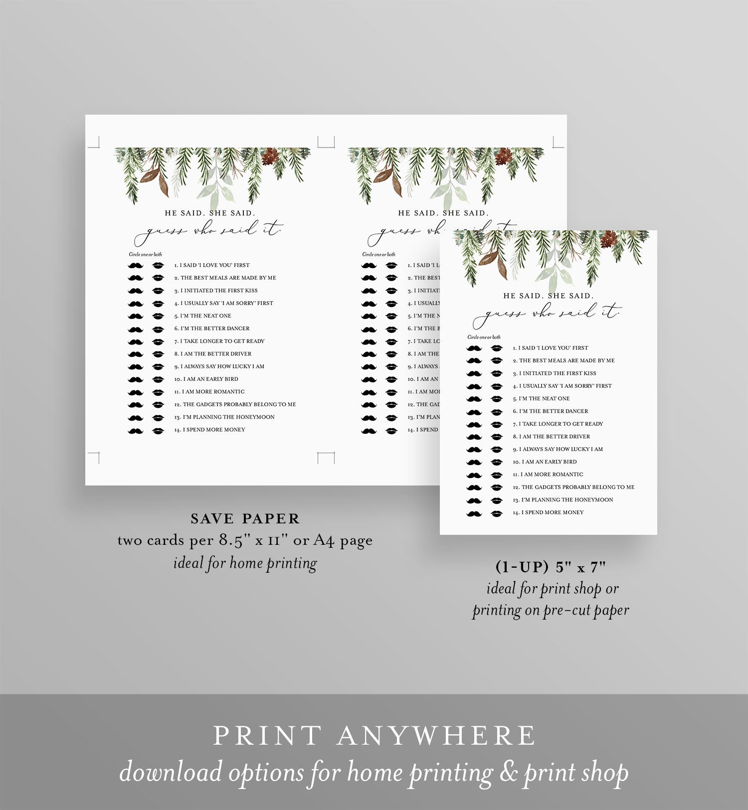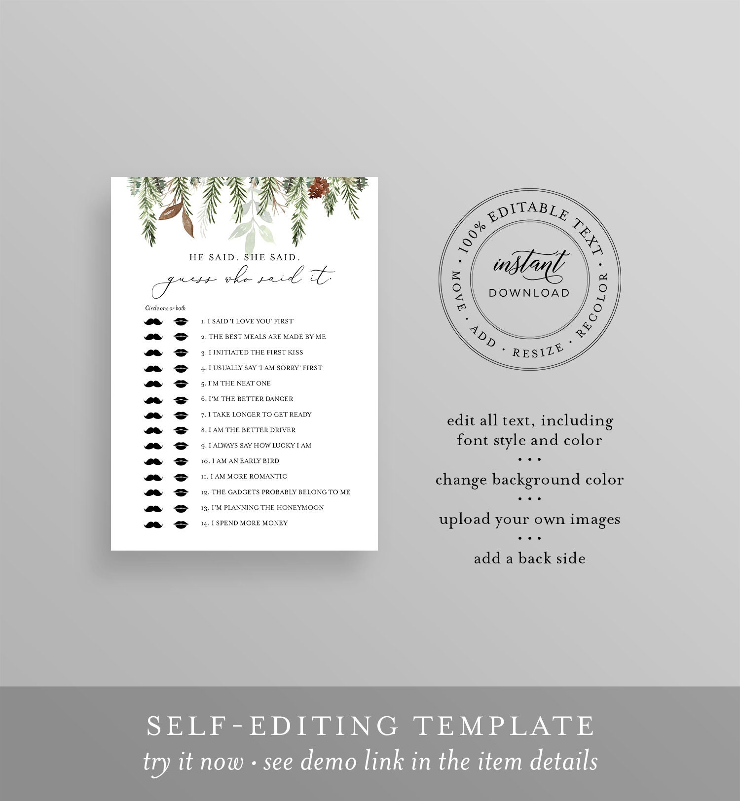 This "He Said. She Said. Guess Who Said It" bridal shower game is an instant download. Access your template within minutes of purchase and edit in Templett - A fully customizable template editor that allows you to personalize your printable directly in your web browser. No software to install or fonts to download.