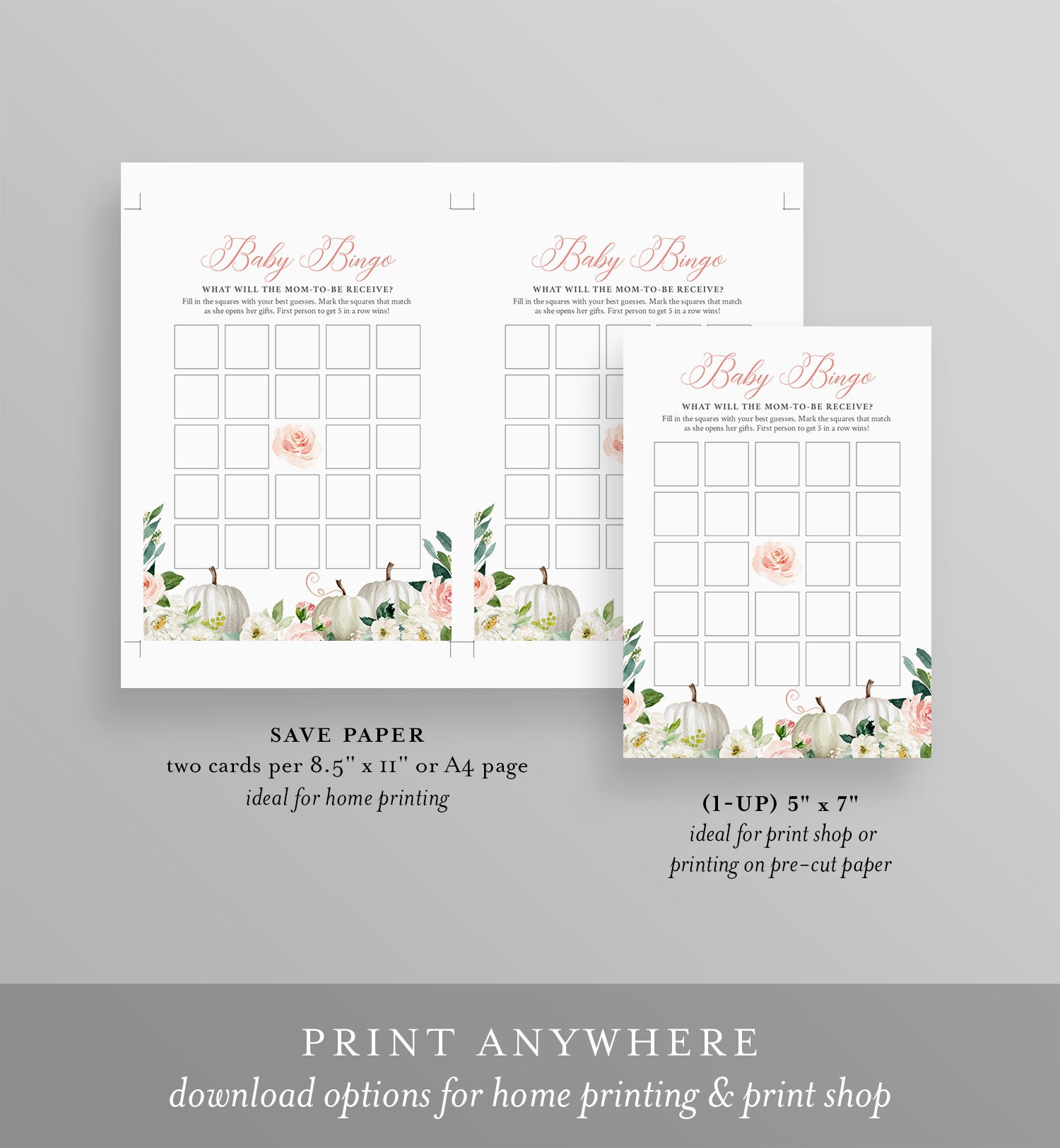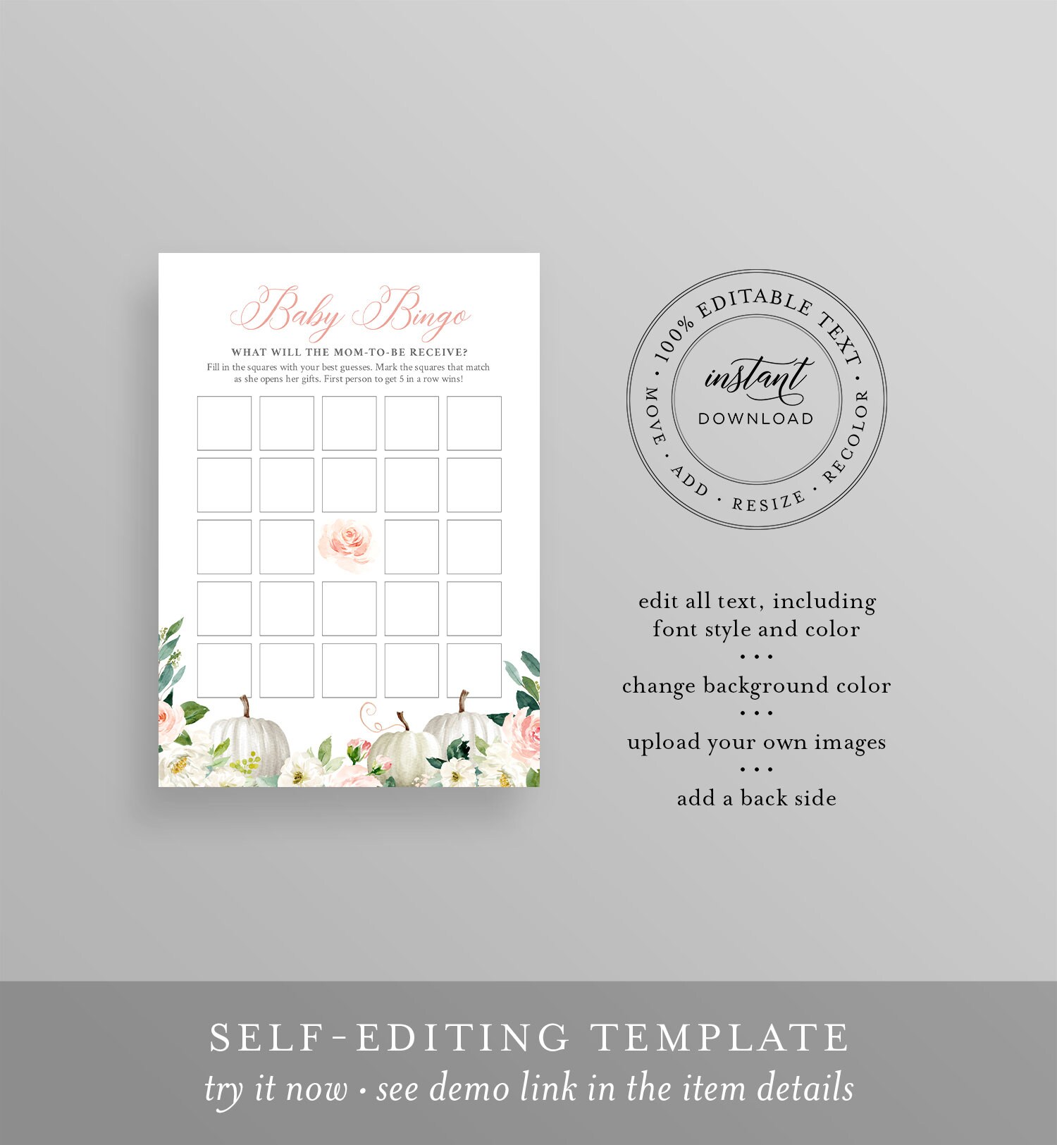 This baby bingo game template is an instant download. Access your template within minutes of purchase and edit using Templett - A fully customizable template editor that allows you to personalize your printable directly in your web browser. No software to install or fonts to download.