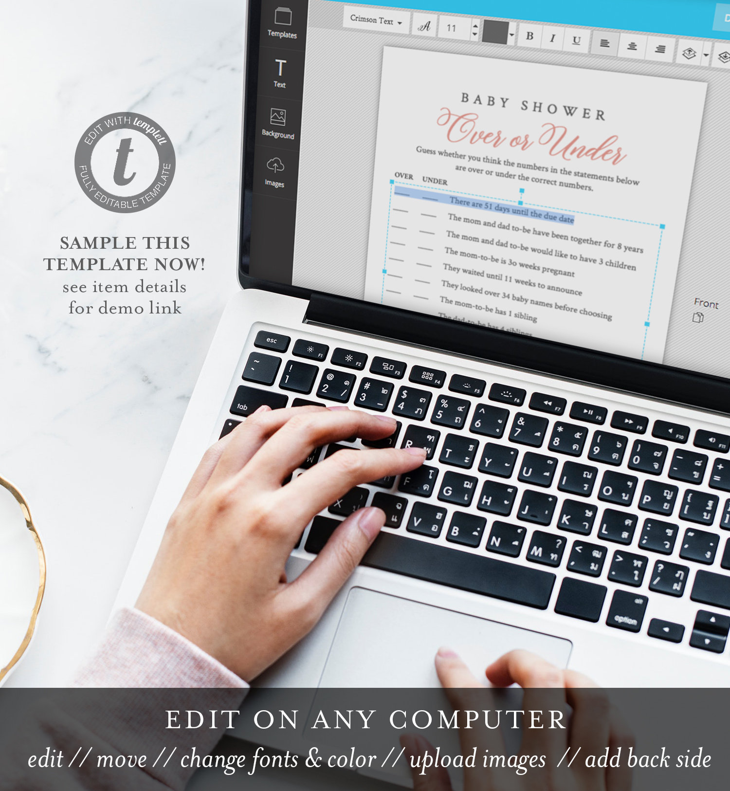 • All text can be edited for wording, font, color, size and placement