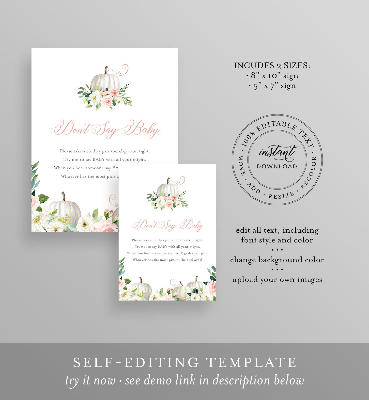 This don't say "baby" baby shower game template is an INSTANT DOWNLOAD. Access your template within minutes of purchase and edit in TEMPLETT - A fully customizable template editor that allows you to personalize your printable directly in your web browser. No software to install or fonts to download.