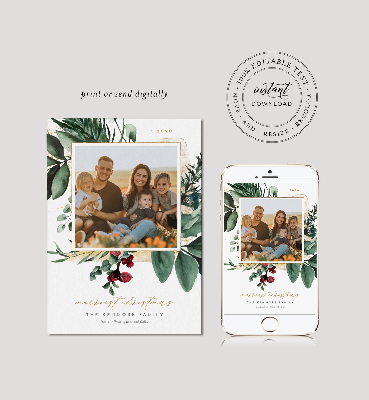 This photo holiday card template is an instant download. Access your template within minutes of purchase and edit using Templett - A fully customizable template editor that allows you to personalize your printable directly in your web browser. No software to install or fonts to download.