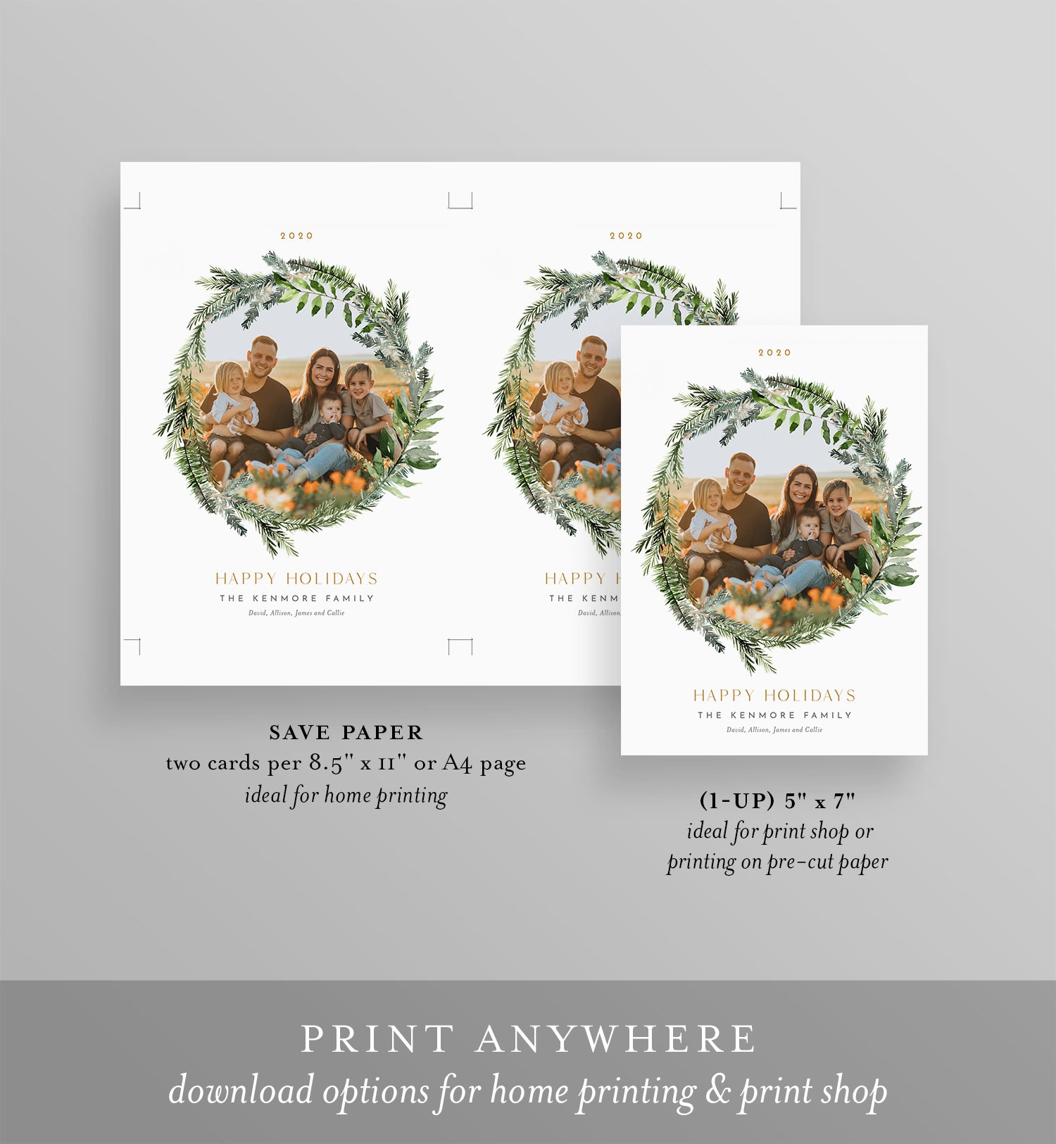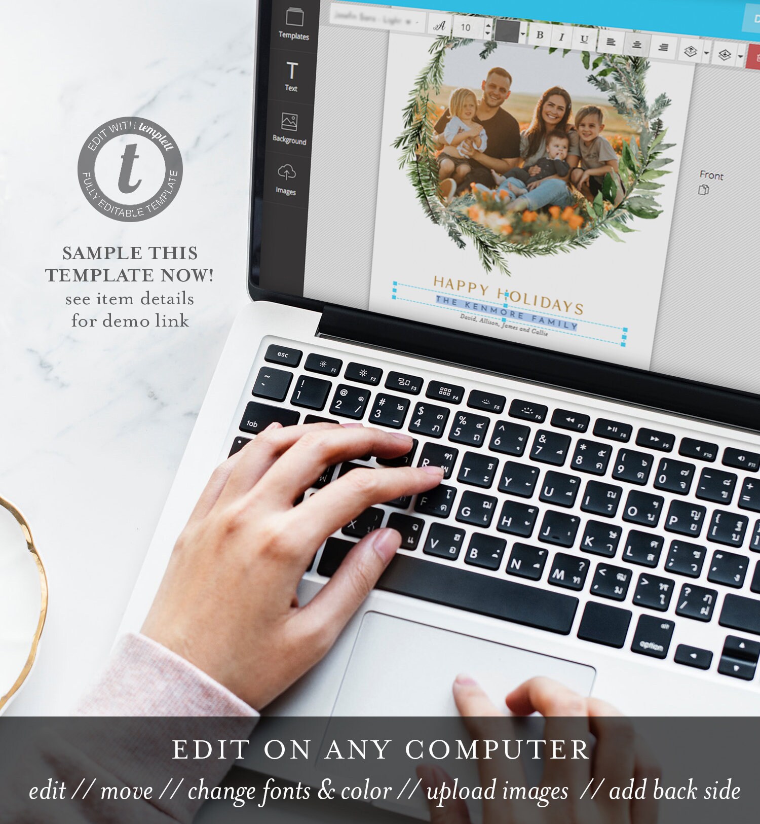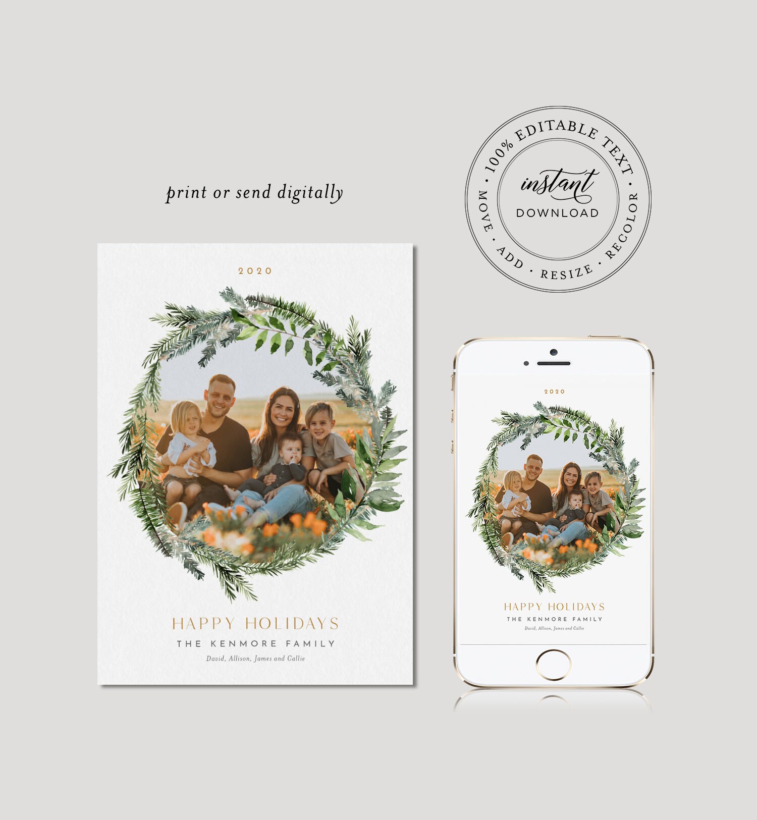 This photo holiday card template is an instant download. Access your template within minutes of purchase and edit using Templett - A fully customizable template editor that allows you to personalize your printable directly in your web browser. No software to install or fonts to download.