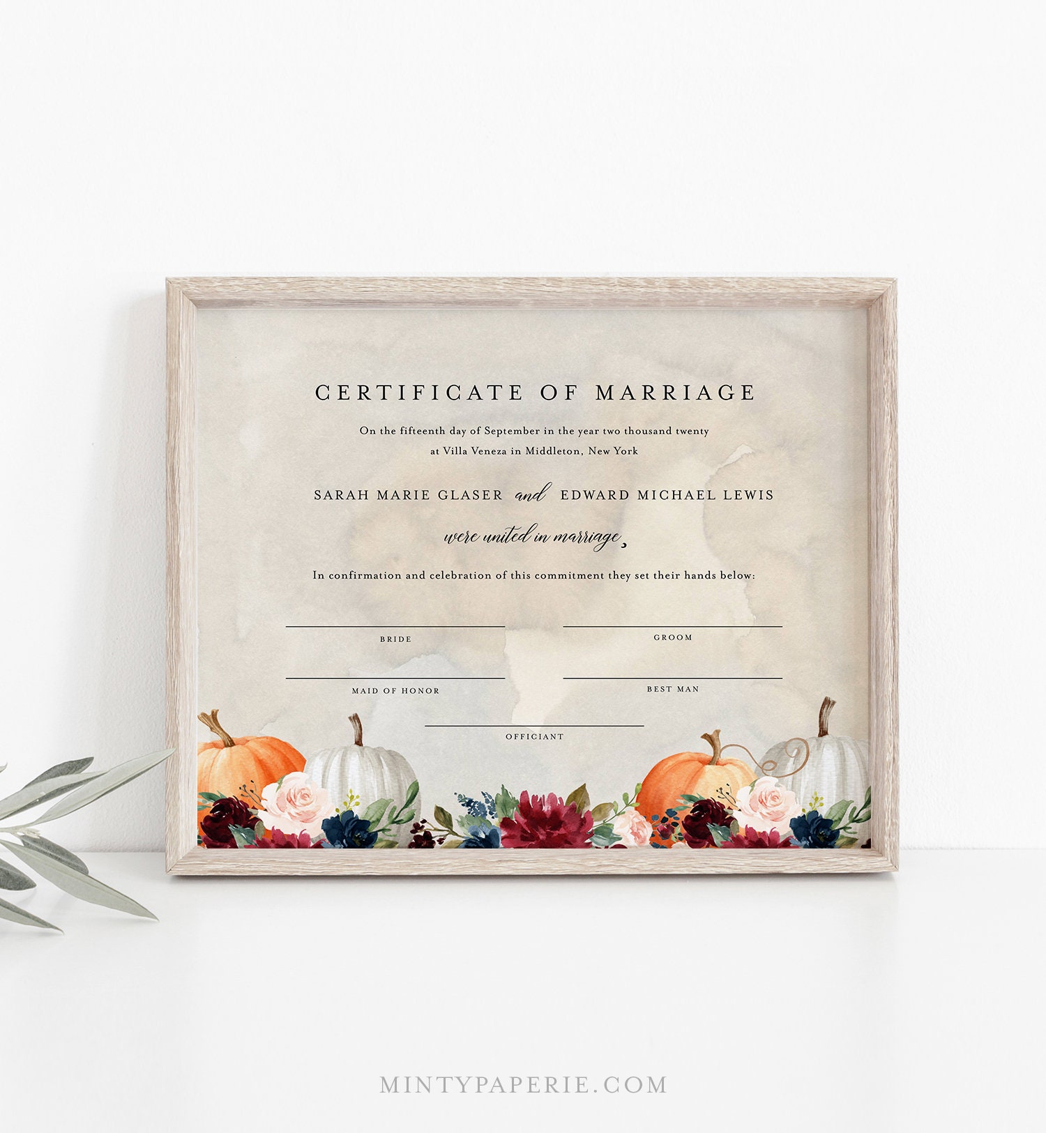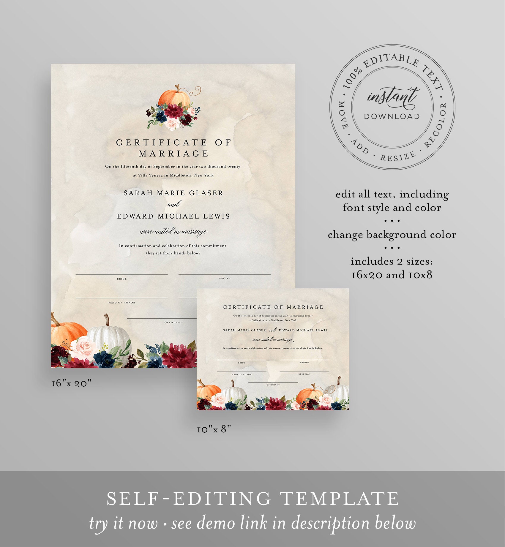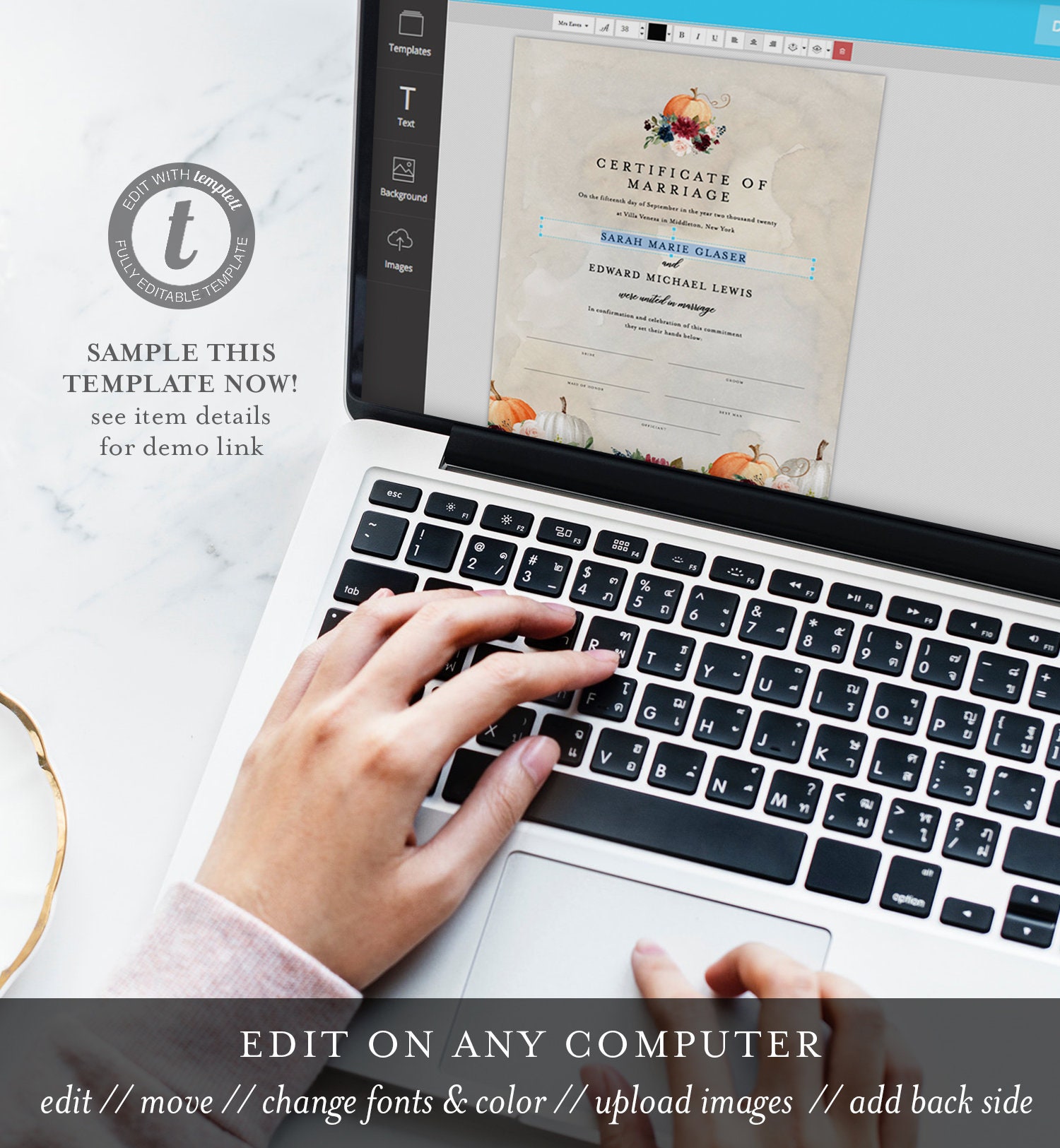 This marriage certificate template is an instant download. Access your template within minutes of purchase and edit in Templett - A fully customizable template editor that allows you to personalize your printable directly in your web browser. No software to install or fonts to download.