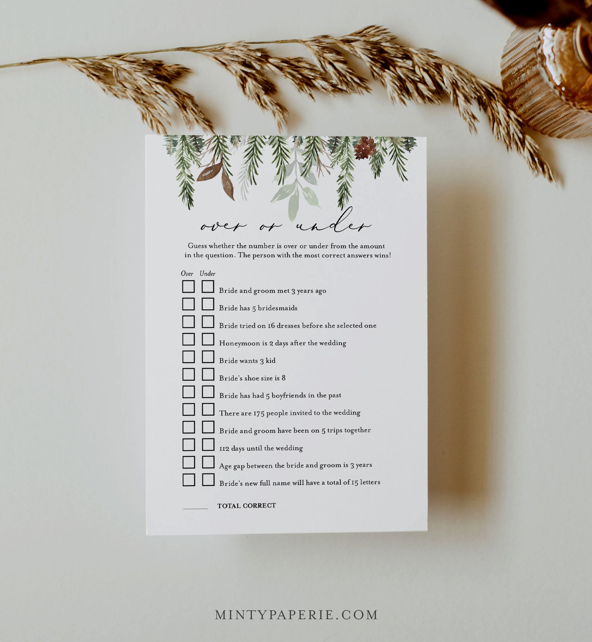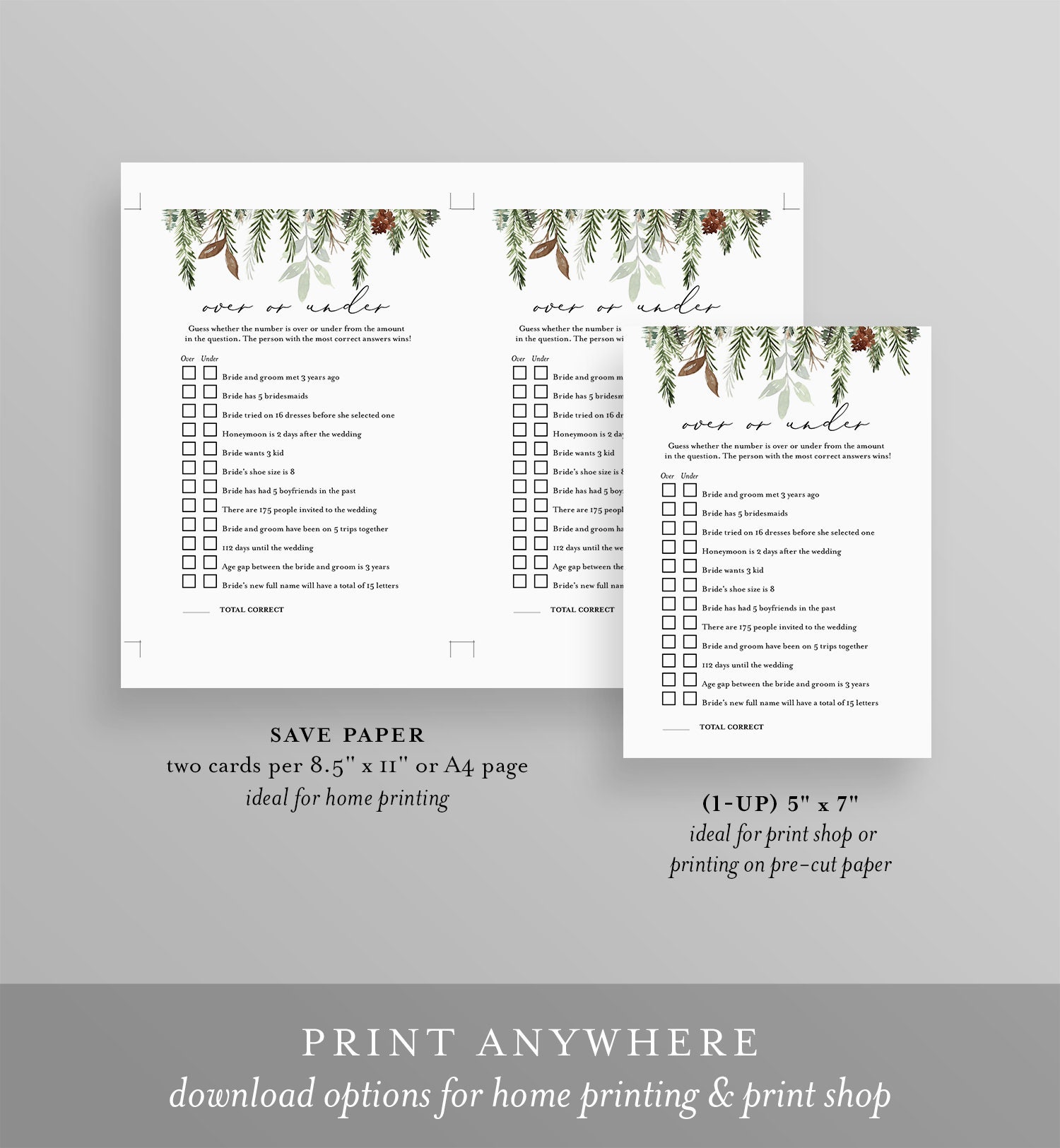 This over and under bridal shower game is an instant download. Access your template within minutes of purchase and edit in Templett - A fully customizable template editor that allows you to personalize your printable directly in your web browser. No software to install or fonts to download.